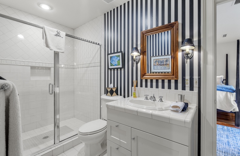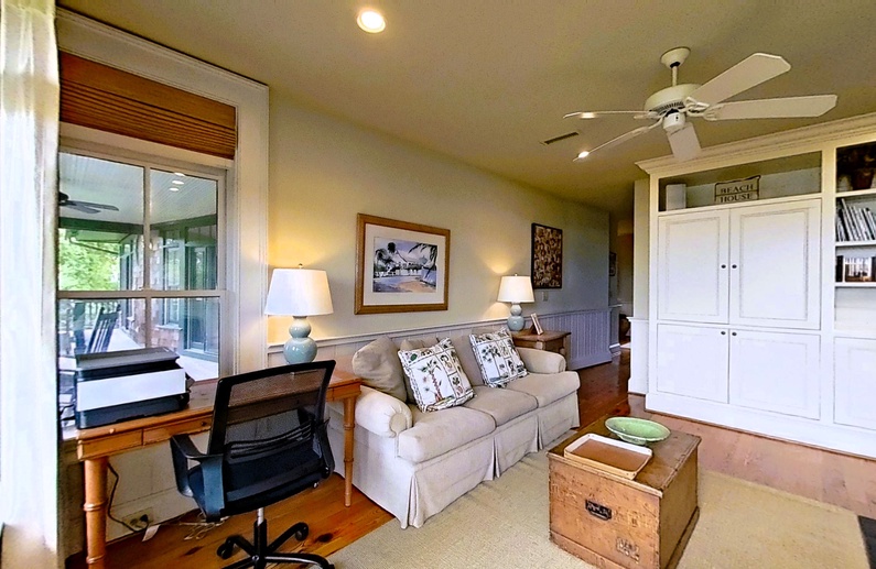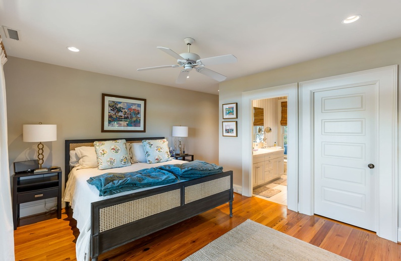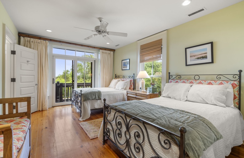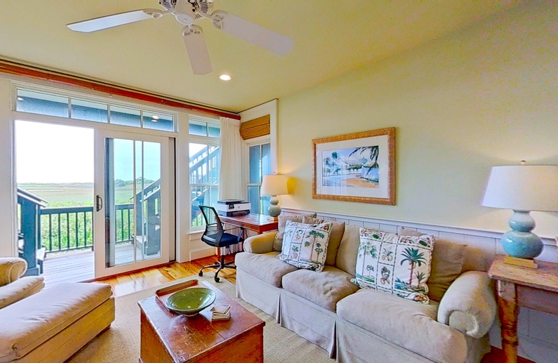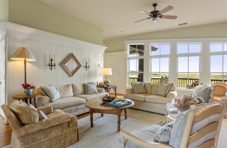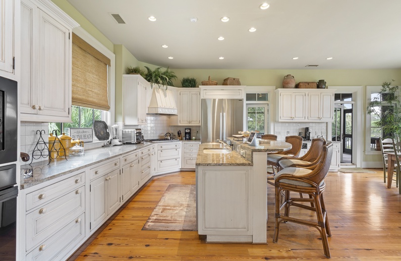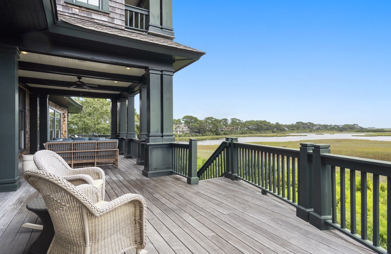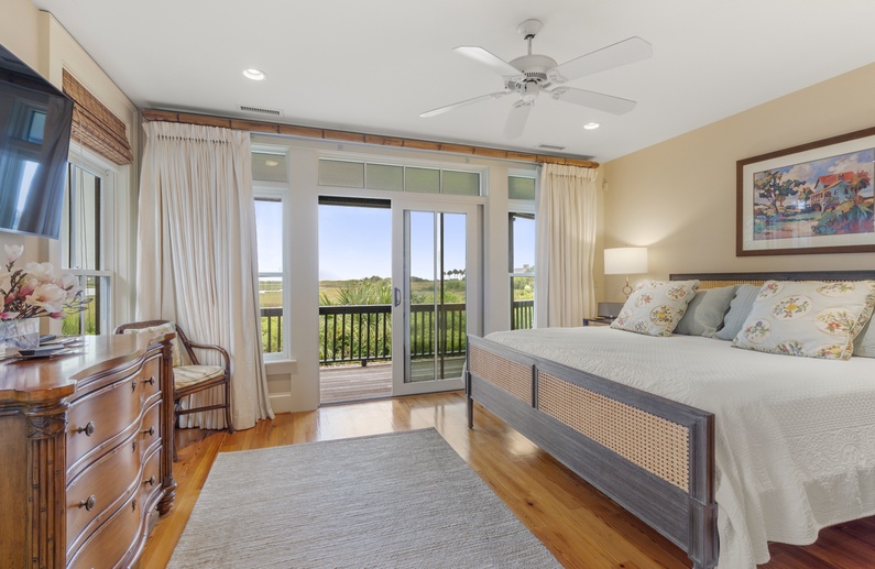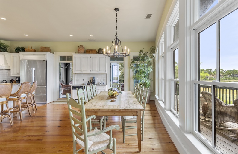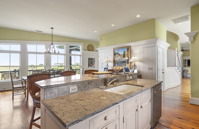 The main living spaces are thoughtfully located on the second floor to take advantage of the sweeping views. The sizable living room welcomes you with plenty of comfortable seating, a large TV, and a picturesque wall of windows. The open kitchen and dining room boasts another wall of windows. The kitchen has abundant counter and cabinet space as well as a center island with bar stool seating, and the dining table comfortably seats eight people. Just off the kitchen and dining room you’ll find the screened porch with a built-in grill and two tables that seat four people each. The second-floor deck spans the length of the home, offers covered and uncovered spaces for unwinding and soaking in the views, and is accessible from the central hallway and screened porch. A powder room is conveniently located on the second floor.