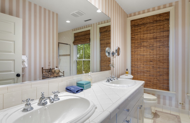 The primary suite is secluded on the third floor and offers a king bed, wall-mounted TV, sitting area, writing desk, en suite bathroom with double sinks, soaking bathtub, and walk-in shower, and a private balcony with incredible views. Four additional bedrooms plus a den are located on the first floor, all of which open onto the first-floor deck. To the left, one bedroom features a king bed, wall-mounted TV, and en suite bathroom with double sinks and walk-in shower, and another bedroom provides a king bed, wall-mounted TV, and private access to a bathroom with walk-in shower. A cozy den is centrally located on the first floor and provides additional access to the king bedroom’s bathroom. To the right, another bedroom includes a king bed, wall-mounted TV, and access to the Jack-and-Jill bathroom shared by a bedroom with two full beds. This bathroom has a sink area and bathtub/shower combo. A laundry room and two hallway window seats complete the first floor. The lengthy first-floor deck includes a relaxing hammock, entry to the pool area, and serene views.