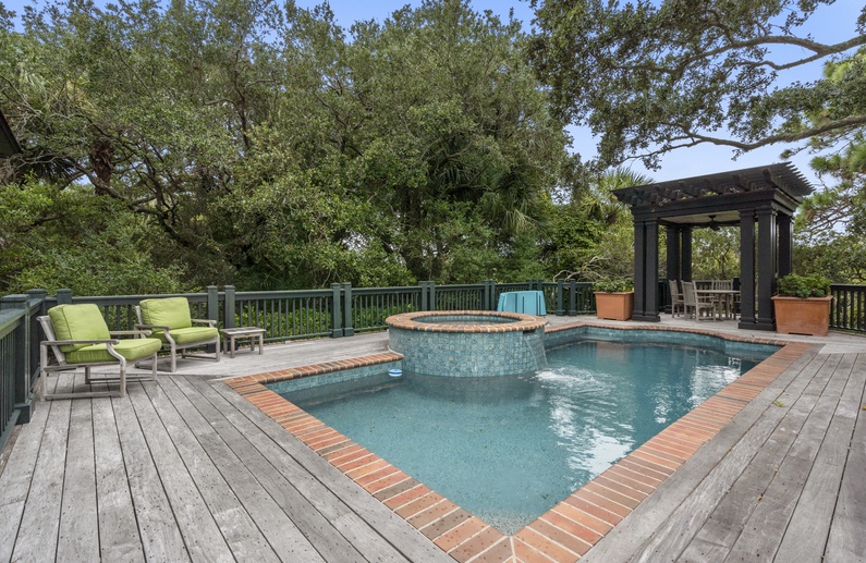 The pool area is situated at the far end of the first-floor deck. Whether you’re cooling off in the refreshing water, lounging poolside, dining al fresco under the cabana, or simply admiring the beautiful scenery, this area is sure to be a highlight of your stay. This pool cannot be heated.
