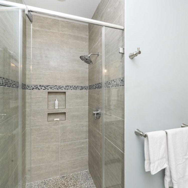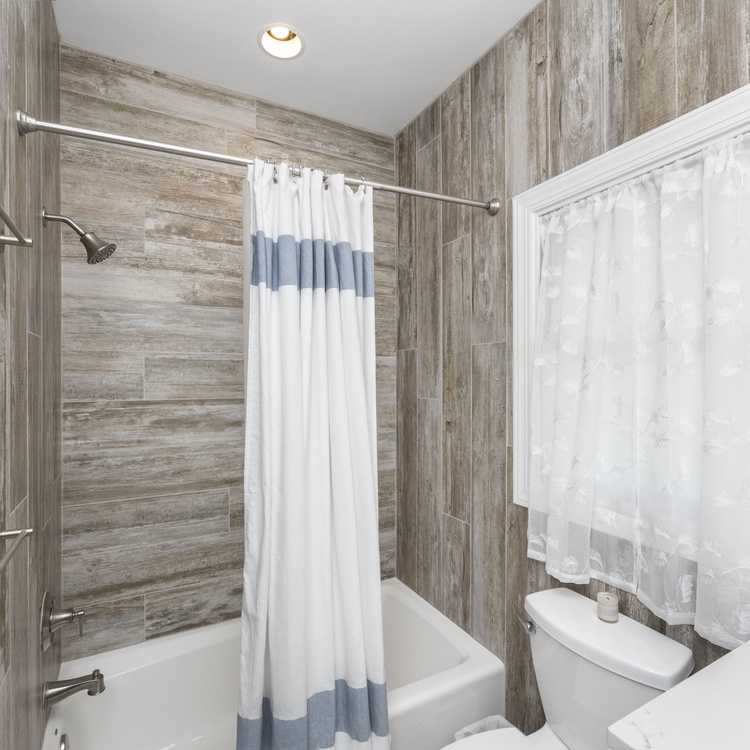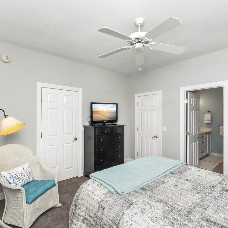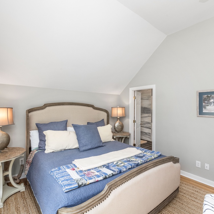 Two of the bedrooms are on the main floor. The first bedroom has a king-sized bed, flat-screen TV, and an attached bathroom with double sink vanity and a walk-in shower. The second bedroom offers a full-over-queen bunk bed. A full bathroom with a shower/tub combo is conveniently located a few steps down the hall.