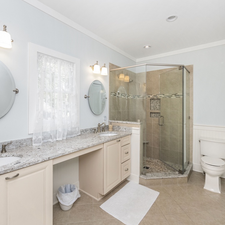 Ascend the stairs to the second floor. Here, you will find the remaining two bedrooms and bathrooms. The first upstairs bedroom is a large primary suite with a king-sized bed, a TV, and a private balcony facing the lagoon. The en suite bathroom has two sinks, a large walk-in shower, and a tub. The second bedroom has a king-sized bed, a TV, a private balcony, and an attached bathroom with a walk-in shower and dual-sink vanity.