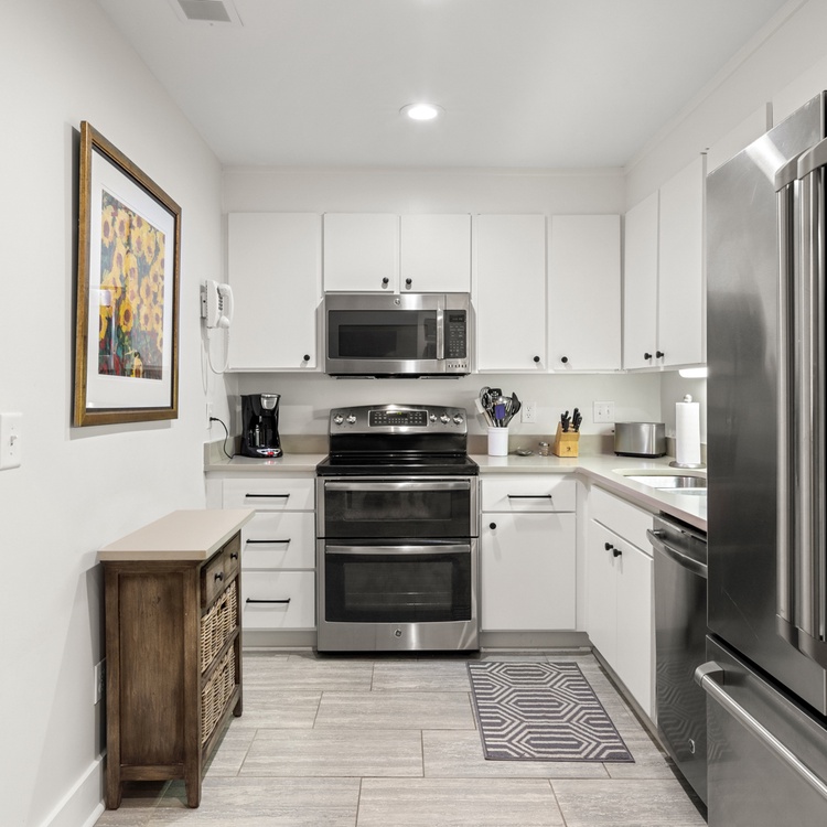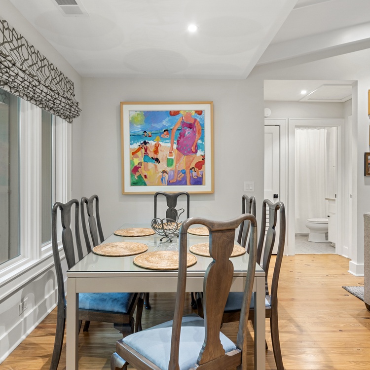 Walk into an open, one-story floor plan and be greeted by beautiful hardwood flooring, a calming ambiance, and an abundance of natural light. In the living area, you will find comfortable furniture and a large flat-screen TV. The fully equipped kitchen is adjacent to the living area and offers white cabinetry and stainless steel appliances. The dining area offers scenic views and ample seating for your whole party.