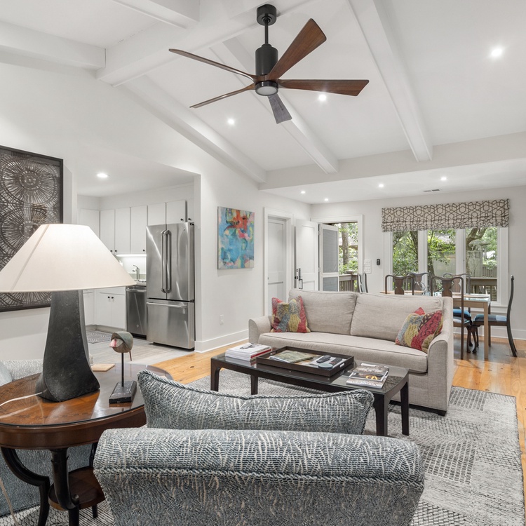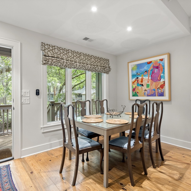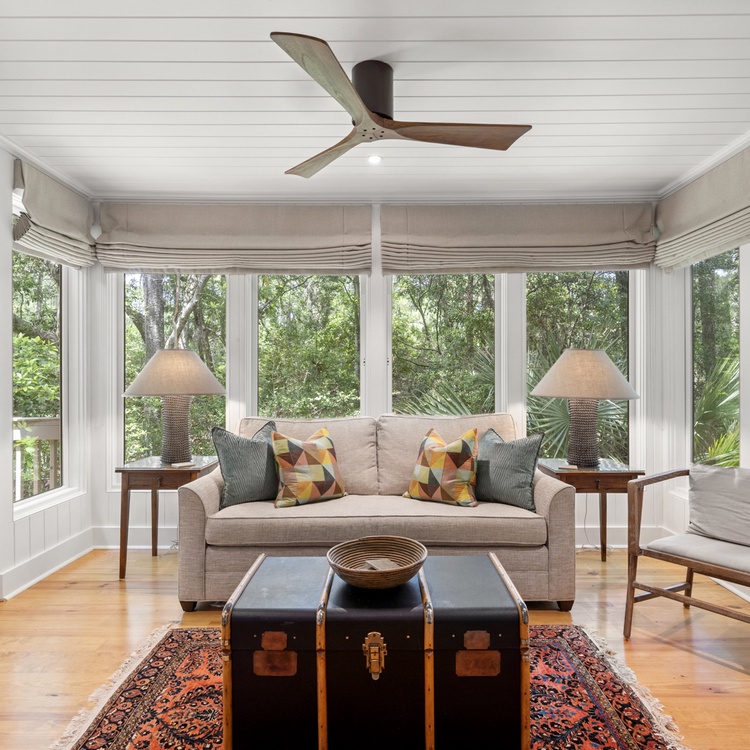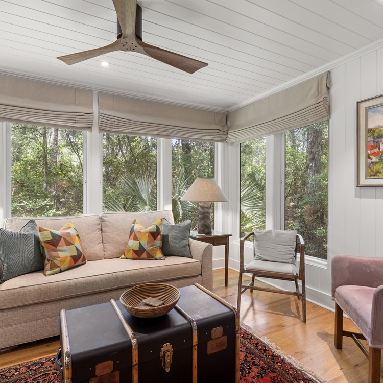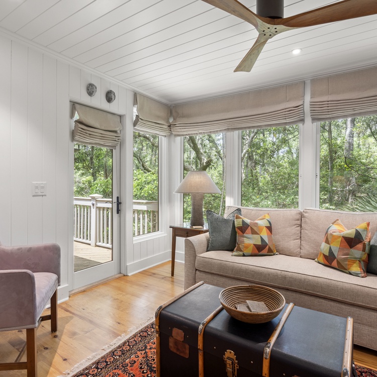 This updated Kiawah Island vacation rental offers three bedrooms, a bright sunroom, a spacious deck, access to a seasonal community pool, and a 4-minute walk to the beach.