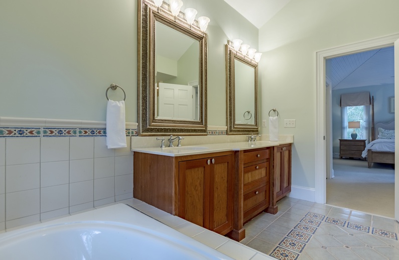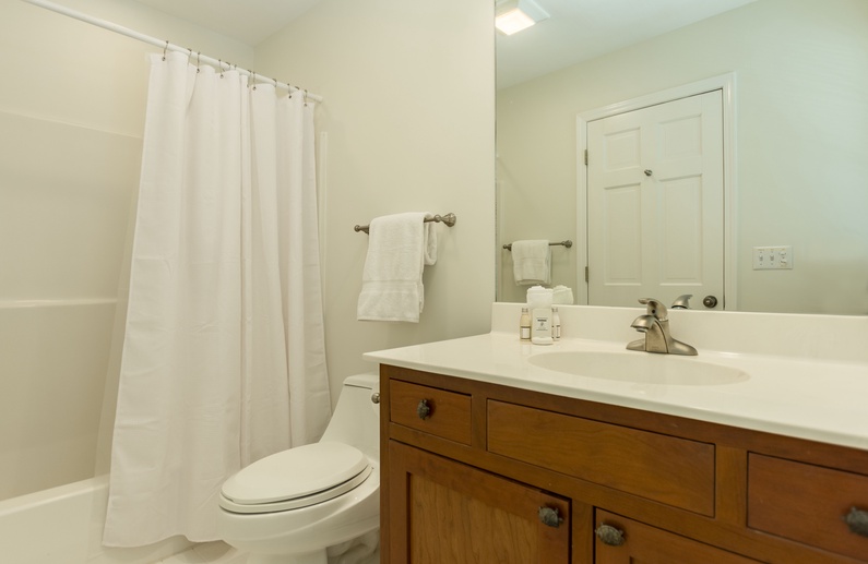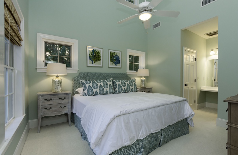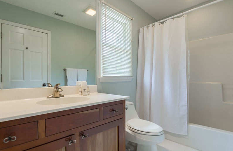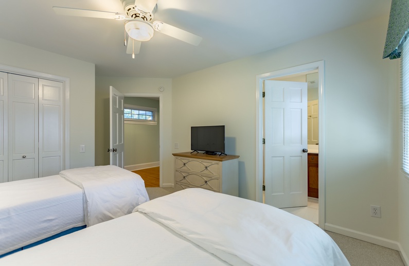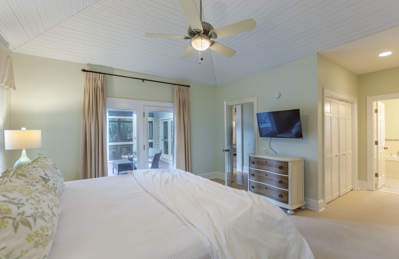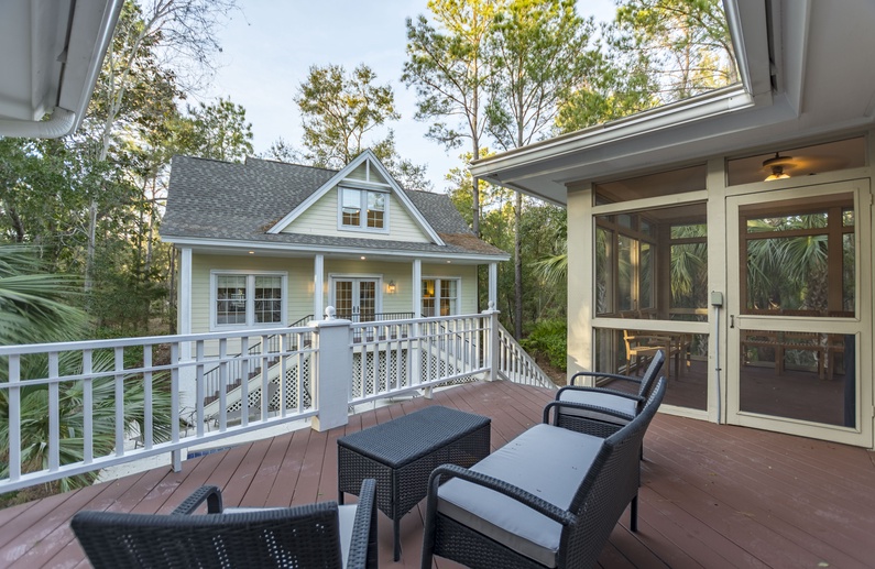 The main house offers both formal and informal living areas, each furnished with comfortable seating and TVs. The fully equipped, large kitchen offers everything needed to cook a meal while on vacation. Adjacent to the informal living area is a dining table that seats 8 and a sliding glass door to access the screened porch connecting to the deck. The first-floor primary bedroom offers a king bed, access to the back deck, a vaulted ceiling, TV, his and her closets, and its own private bathroom equipped with 2 sinks, a soaking tub, and a walk-in shower. Upstairs, you will find 2 bedrooms and 2 bathrooms. The first bedroom features 2 twin beds, a TV, and a private bathroom with shower/tub combo. The second bedroom features a queen bed, a TV, and a private bathroom with a shower/tub combo.