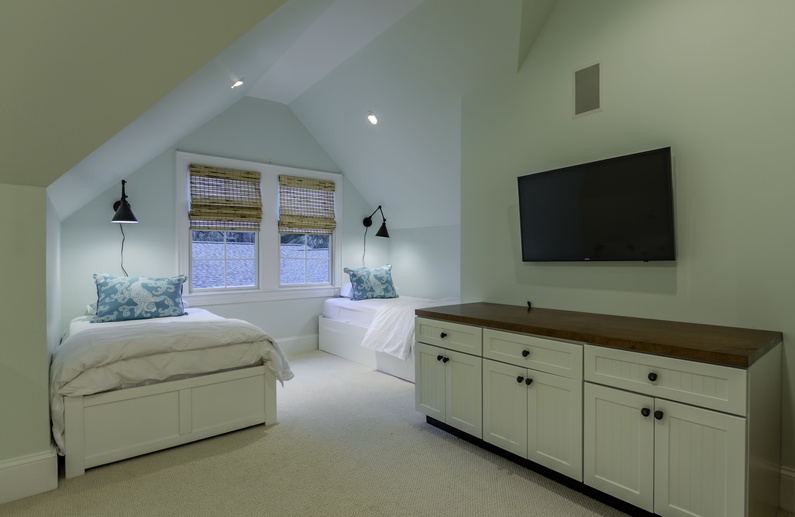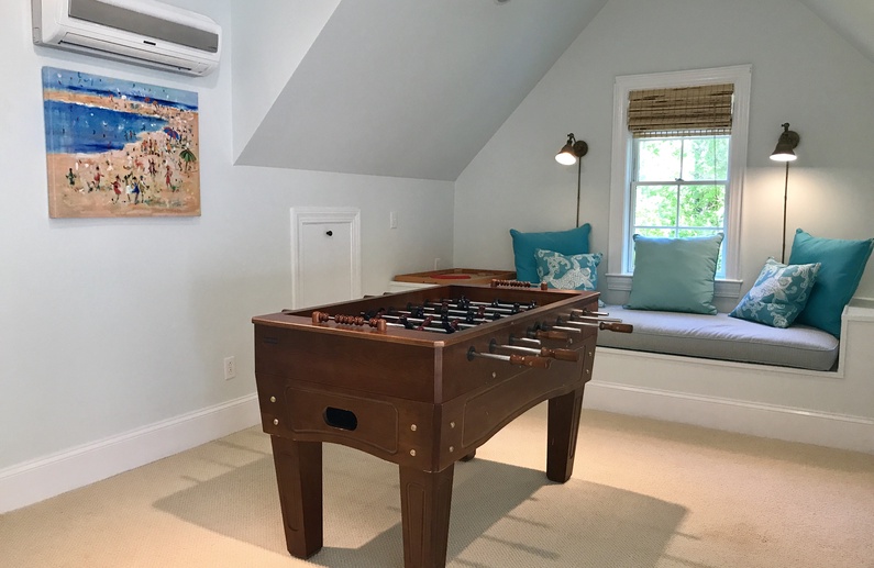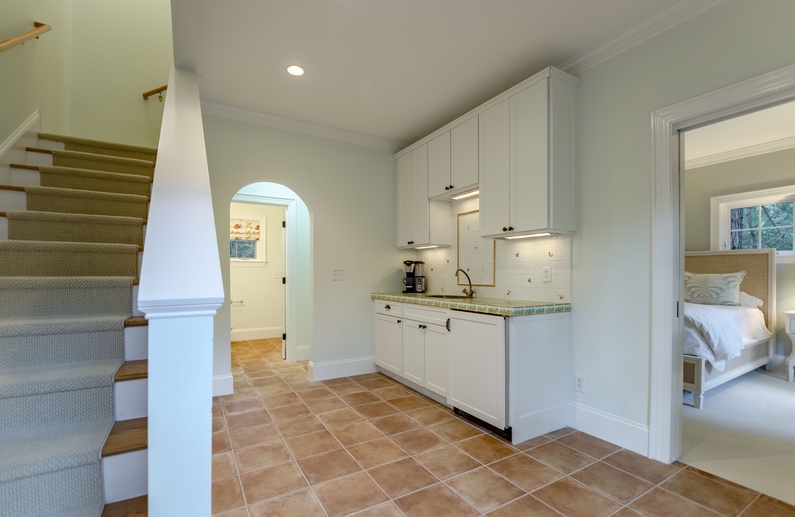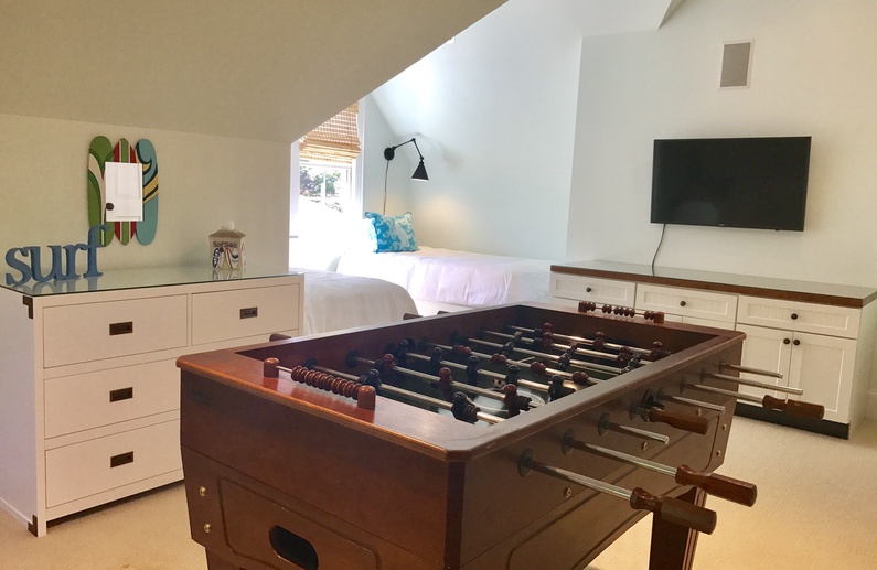 The 2-story guest house features 3 bedrooms and a kitchenette. The kitchenette has a sink, mini fridge, cabinets, and counter space. One first-floor bedroom has a king bed with a private bathroom featuring a shower/tub combo. The second first-floor bedroom has a queen bed with private access to a hall bathroom with a walk-in shower. Upstairs, you will find a large space with 2 twin beds, 1 trundle bed, foosball table, TV, and an adorable reading nook.