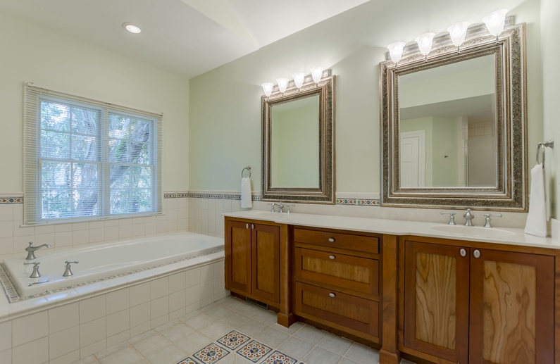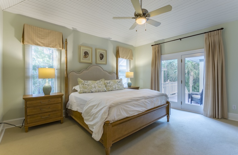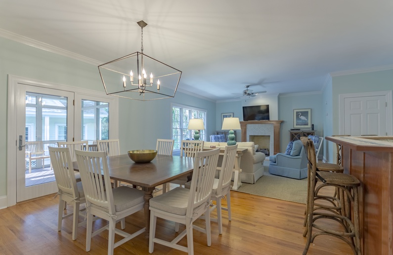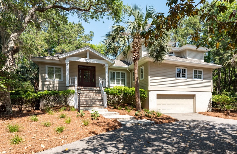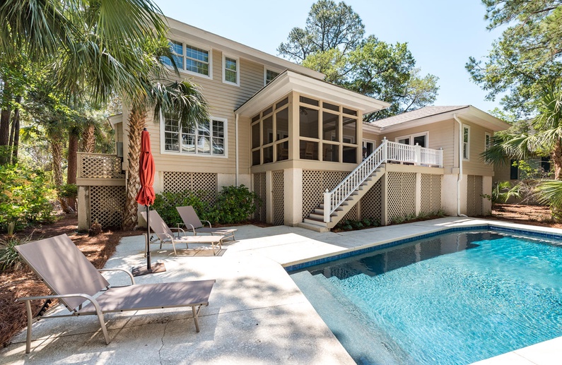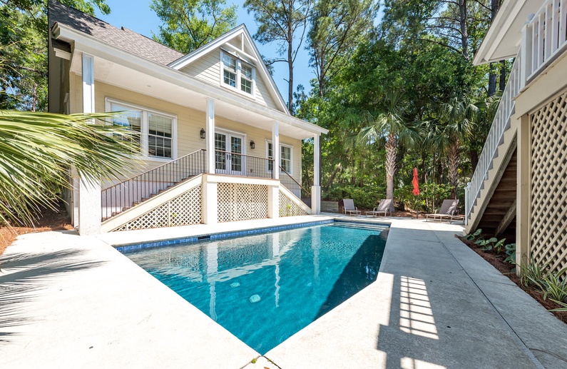 This Kiawah Island vacation rental offers a private pool, 3 bedrooms in the main house, and 3 bedrooms in the guest house. The home is about a 7-minute bike ride to the beach.