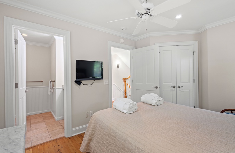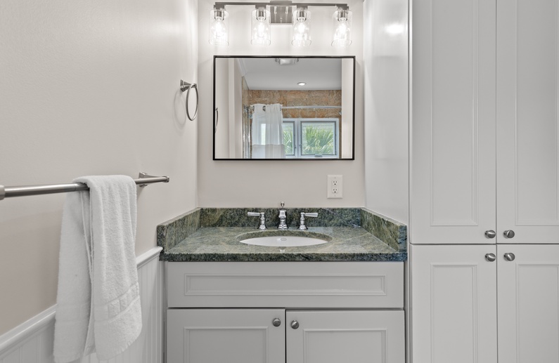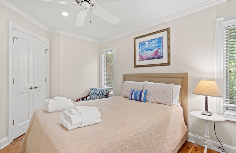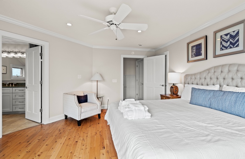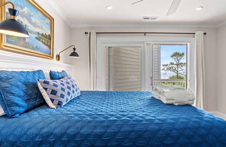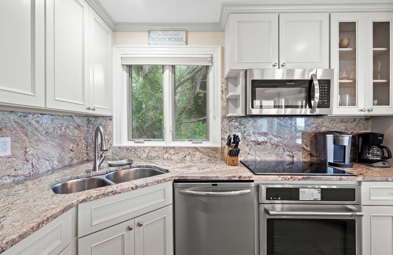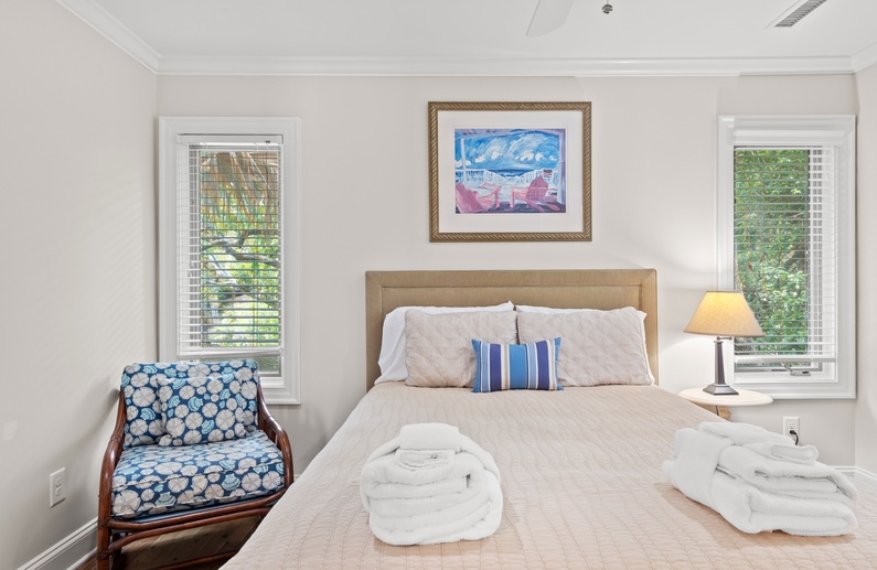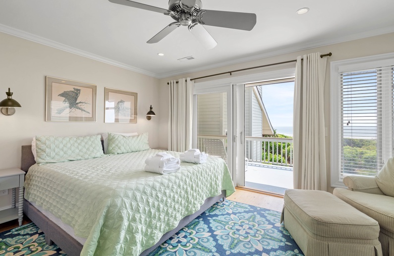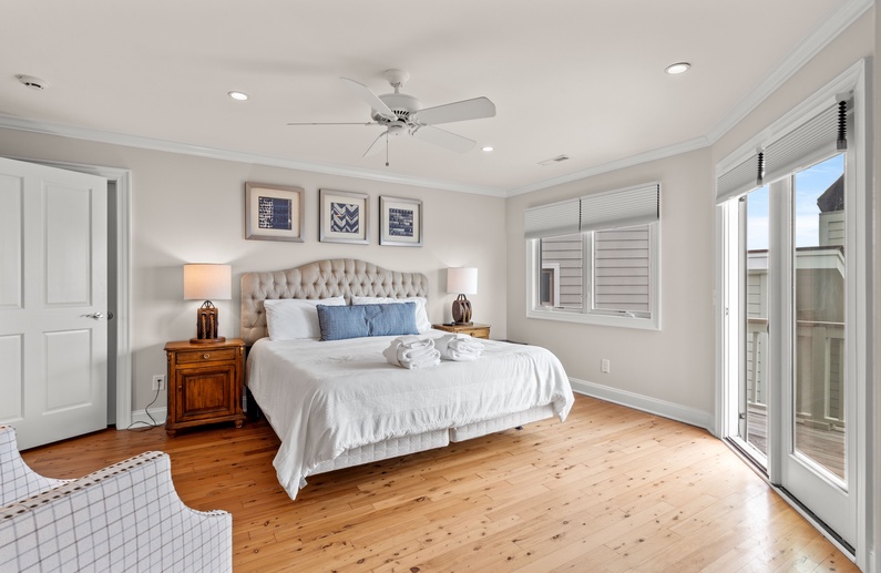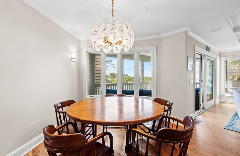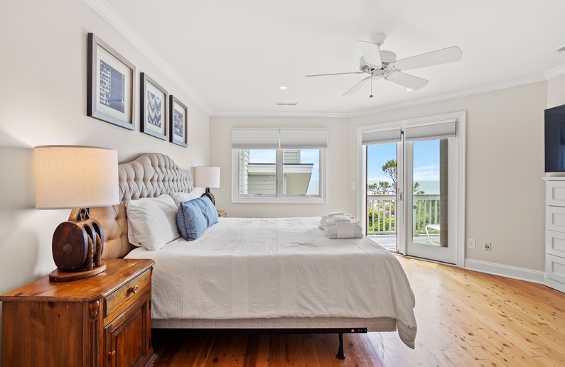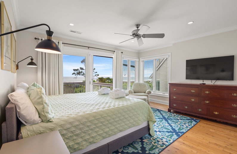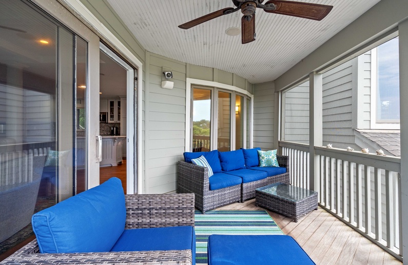 The main living space allows seamless flow and easy entertaining between the kitchen, dining and living areas. The fully equipped kitchen features an elevated island with two stools, granite countertops, and stainless steel appliances. The dining room offers seating for 6. The living room offers a wall-mounted flat-screen TV, comfortable L-shaped sofa and a chair, plus access to a screened porch with a table and seating for 4 and stairs leading to the beach boardwalk. The laundry room and half bathroom complete the first floor.
