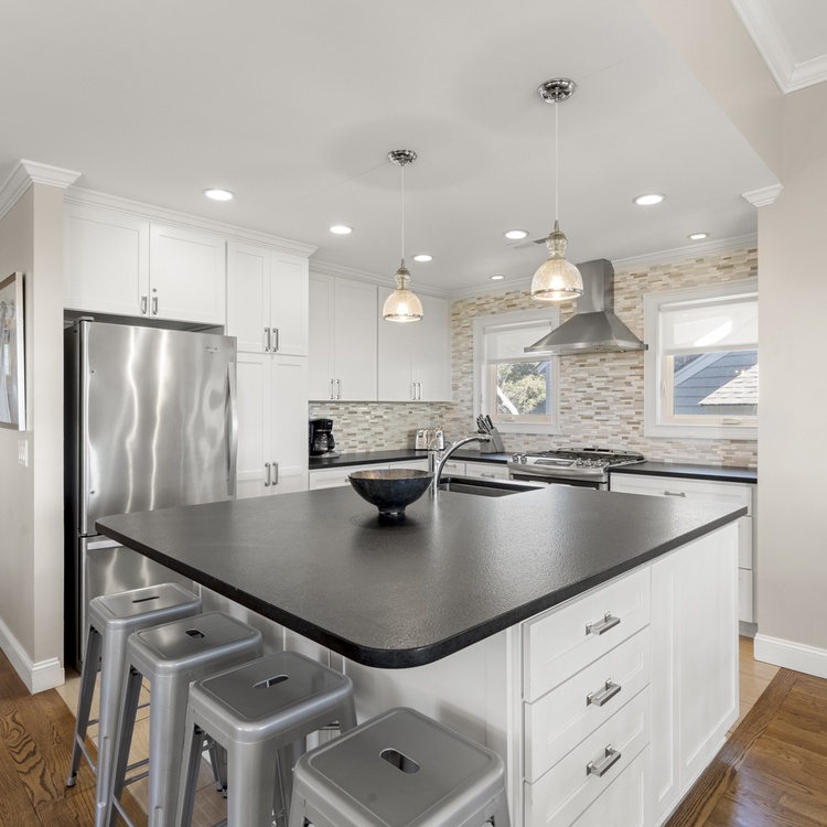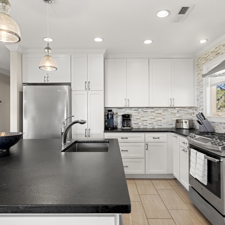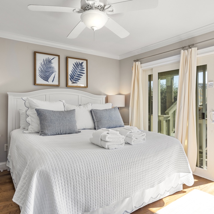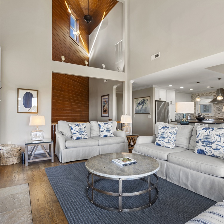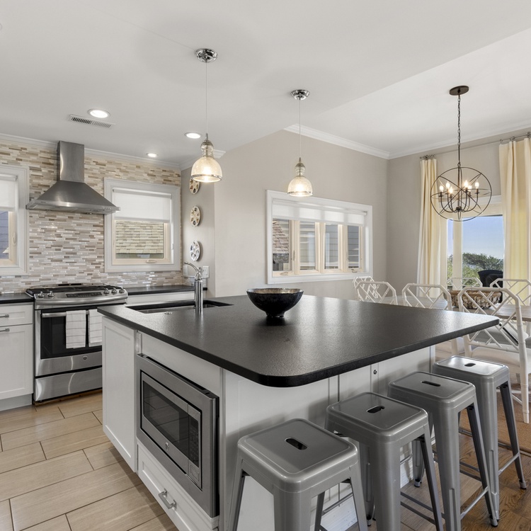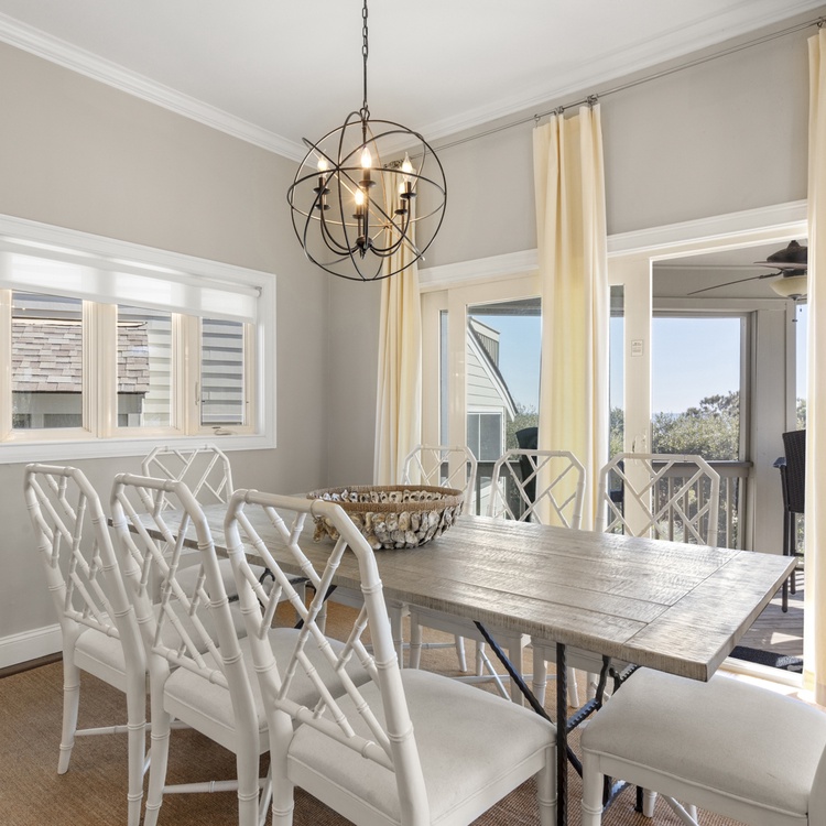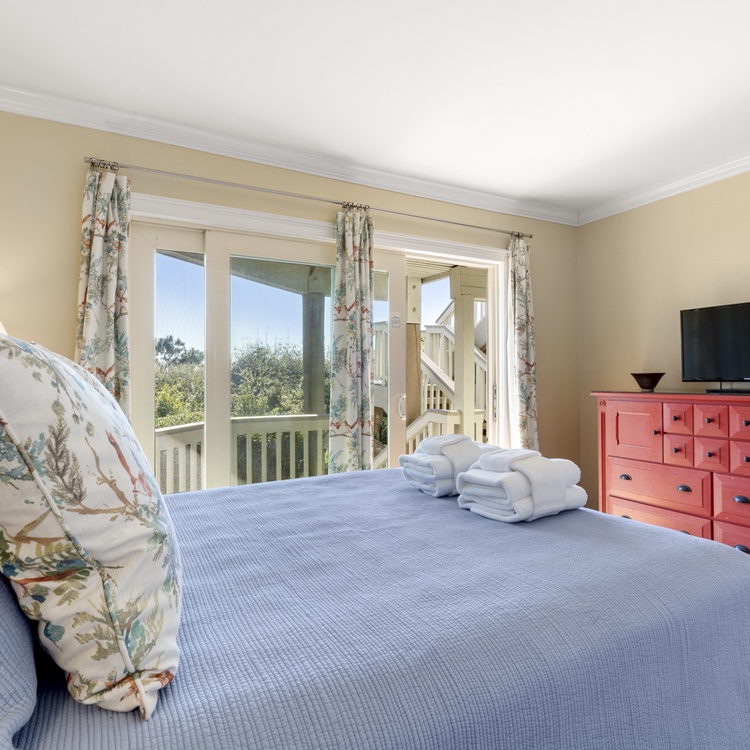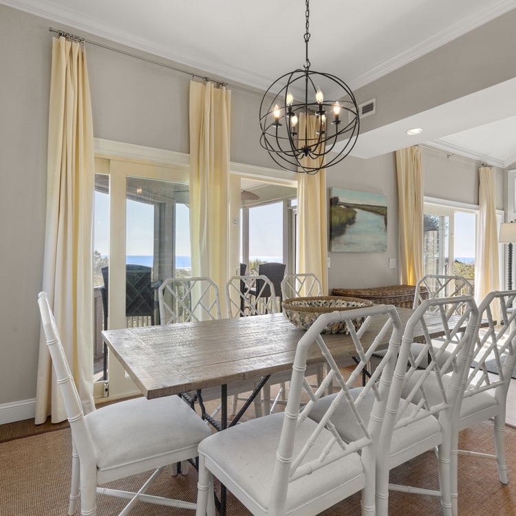 On the villa’s second floor, you will find the main living areas. Guests will enjoy gathering in the living room, which offers comfortable family seating, a wall-mounted TV, and beautiful views of the dunes. The living room adjoins a dining room that seats seven people, along with three bar stools at the kitchen island. Accommodating serious and amateur chefs alike, the recently renovated kitchen has everything guests will need to prepare vacation meals.