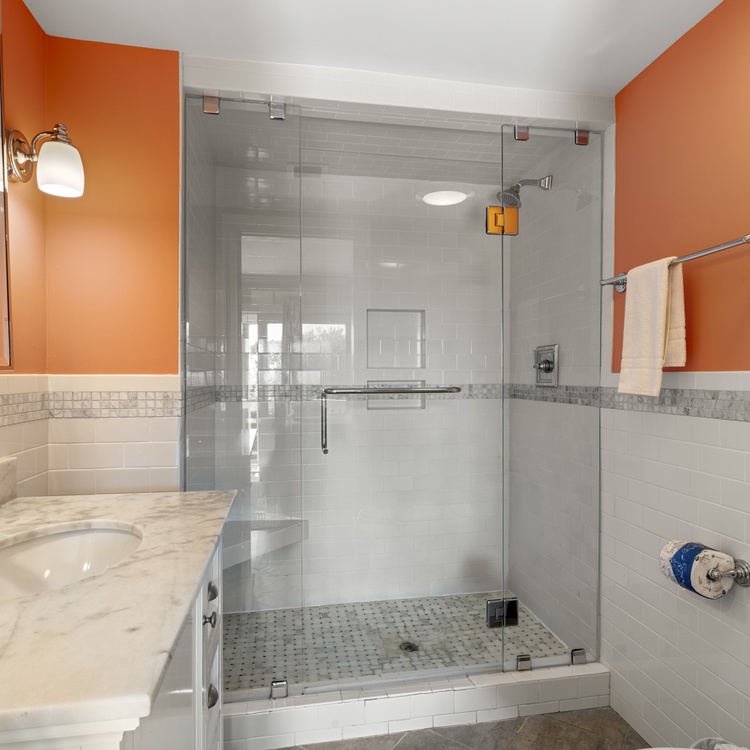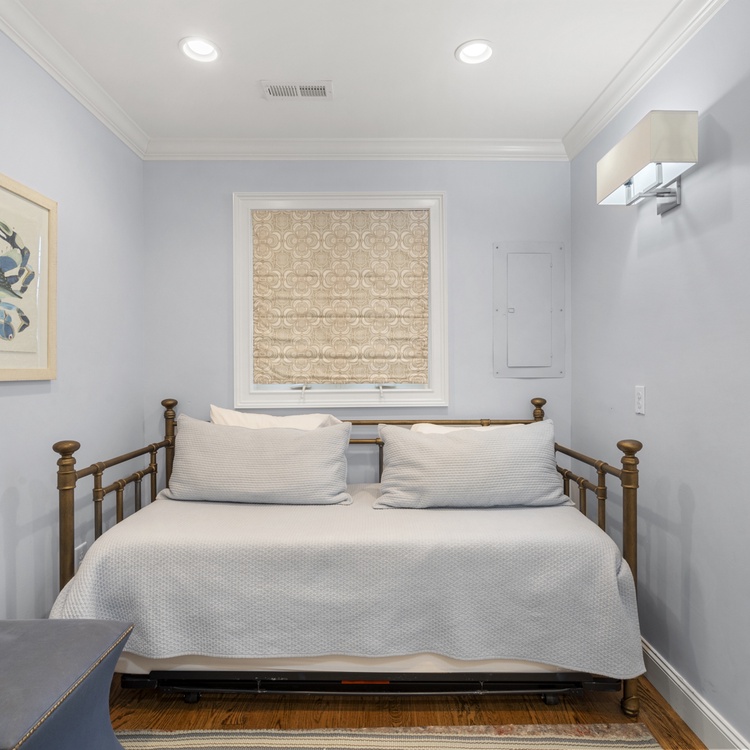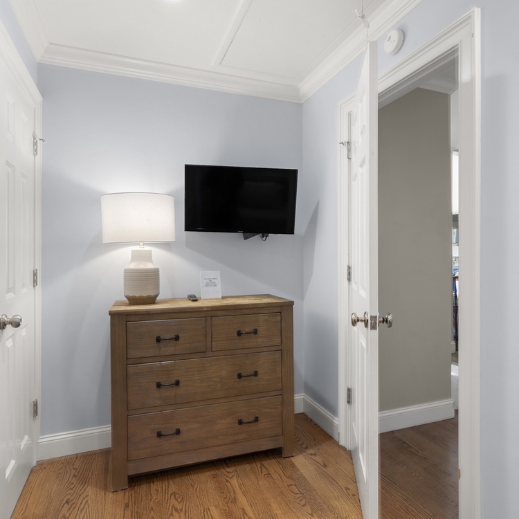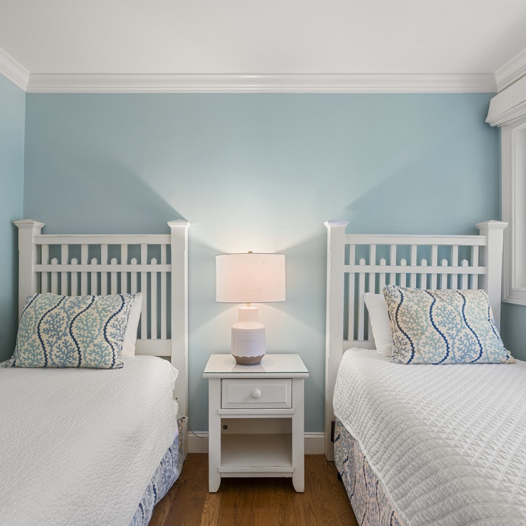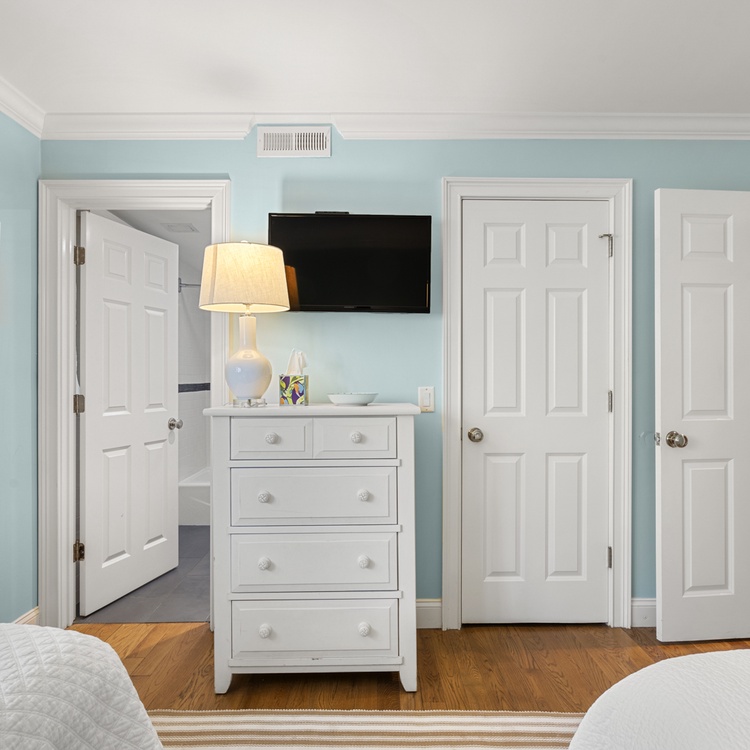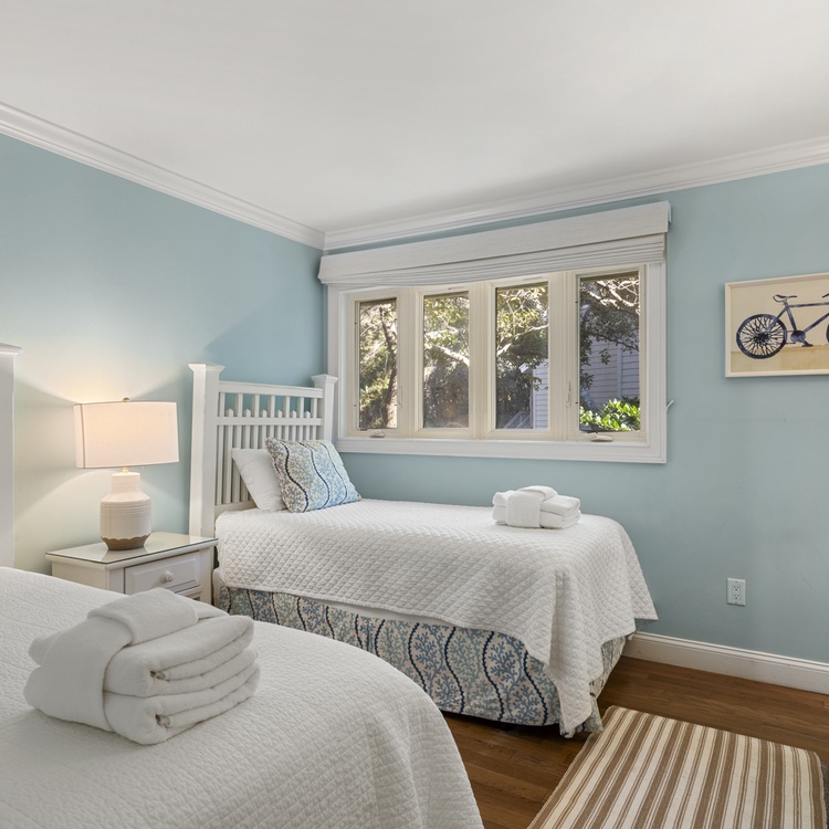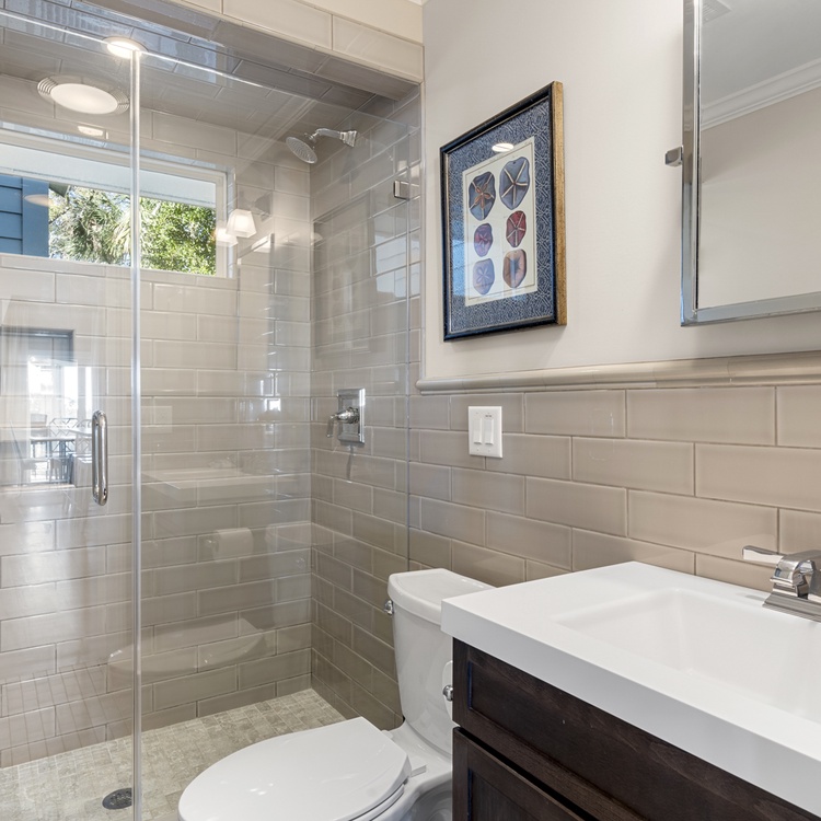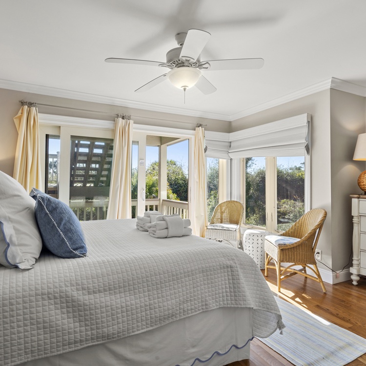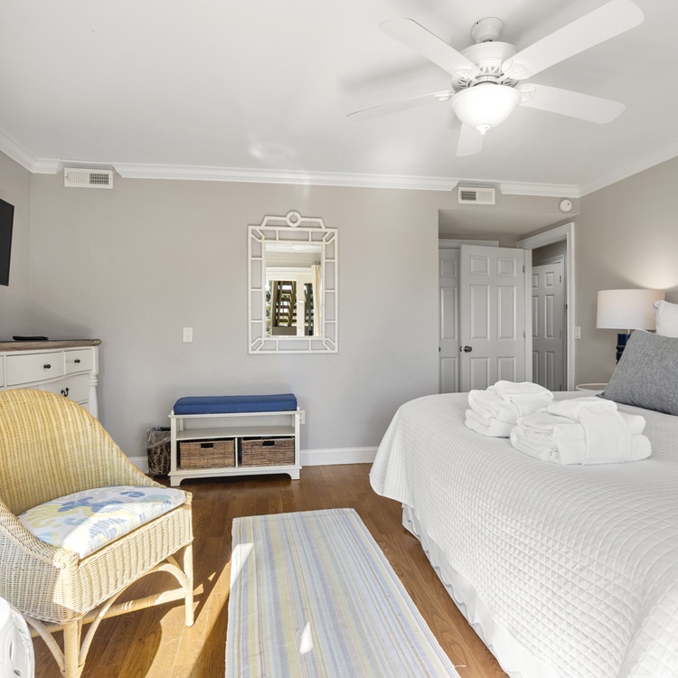 One bedroom with a twin bed and twin trundle is located on the second floor. This bedroom is adjacent to the full bathroom, which features a walk-in shower. The villa’s three remaining bedrooms, all with ensuite bathrooms, are located on the first floor. The primary bedroom is situated ocean-side and offers a king bed, large wall-mounted flat screen TV, private bathroom, and direct access to the beach walkway. The queen bedroom, also facing the ocean, has a flat-screen TV, a full private bathroom, and direct access to the beach walkway. The front bedroom offers two twin beds, a flat-screen TV, and a full private bathroom.