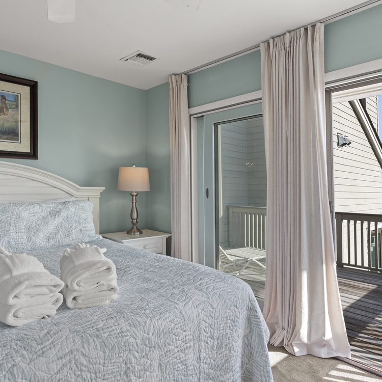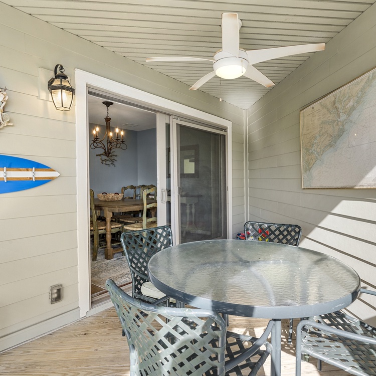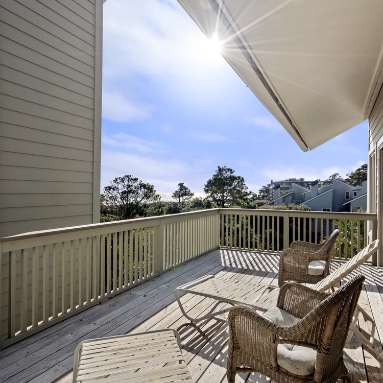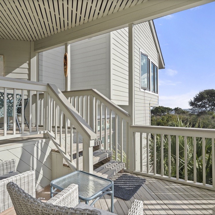 Enjoy relaxing on the screened porch, accessible from the first-floor living room. This area offers lovely views of the dunes, coastal breezes, and views of the Atlantic Ocean.