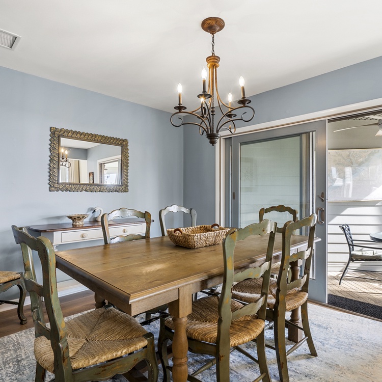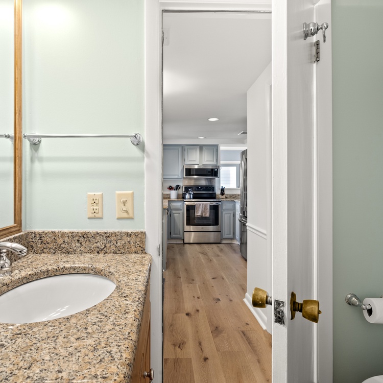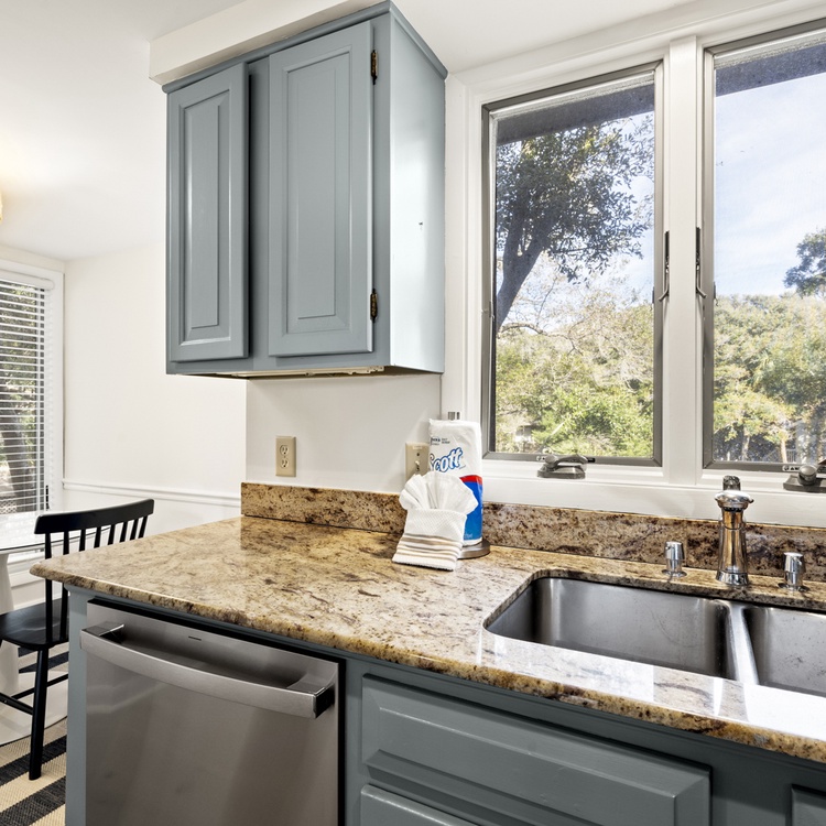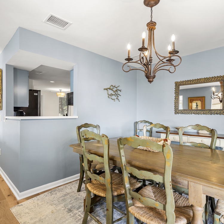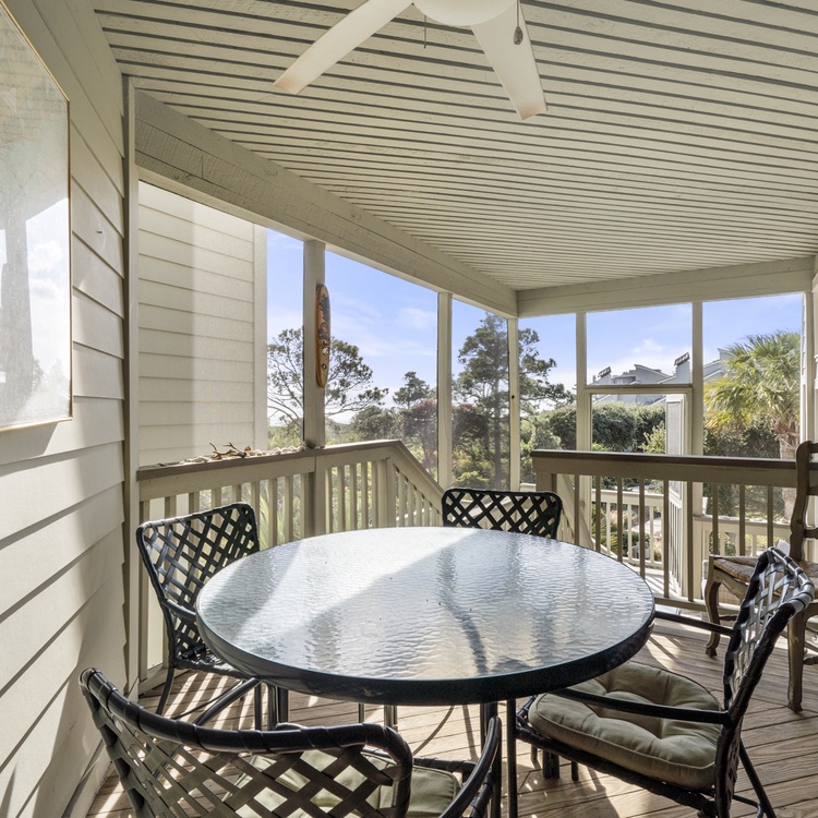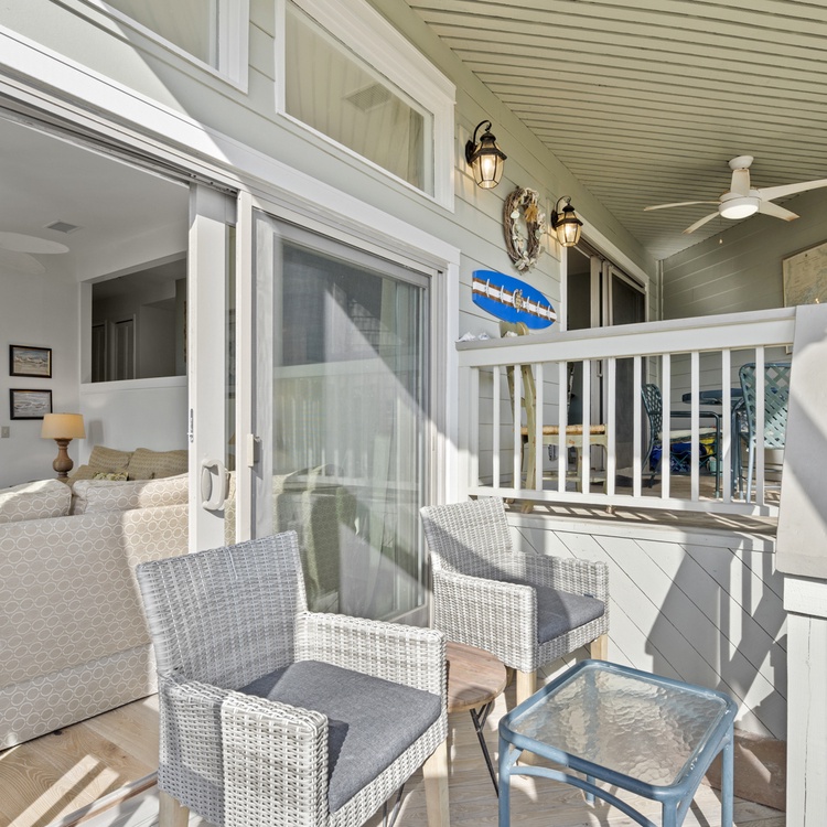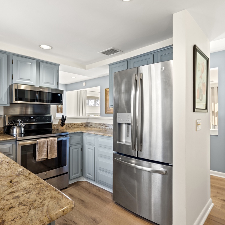 Featuring a townhouse-style layout, this Duneside villa stands two stories tall, with the living areas on the first floor and the bedrooms on the second. The light-filled living room is a cozy retreat with incredible ocean views, a TV, and two sofas. Just a few steps up from the sunken living room, the nearby kitchen has a pass-through window allowing easy conversation flow. The updated kitchen has granite countertops, stainless steel appliances, and white cabinets. Enjoy your vacation meals and snacks in the dining area, or step outside to the screened porch for al fresco dining.