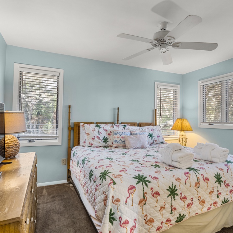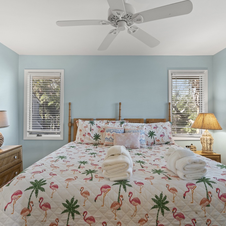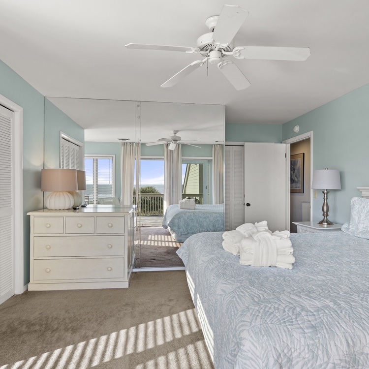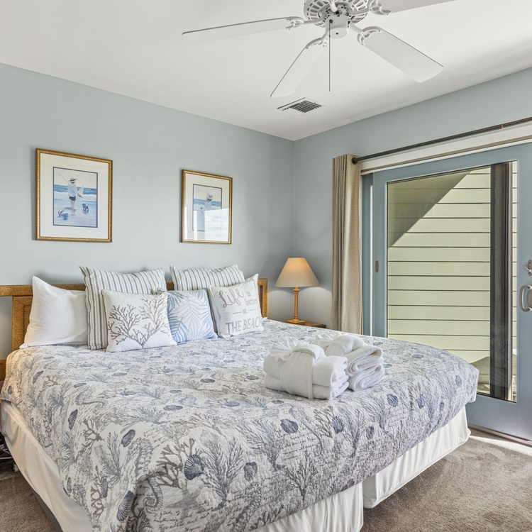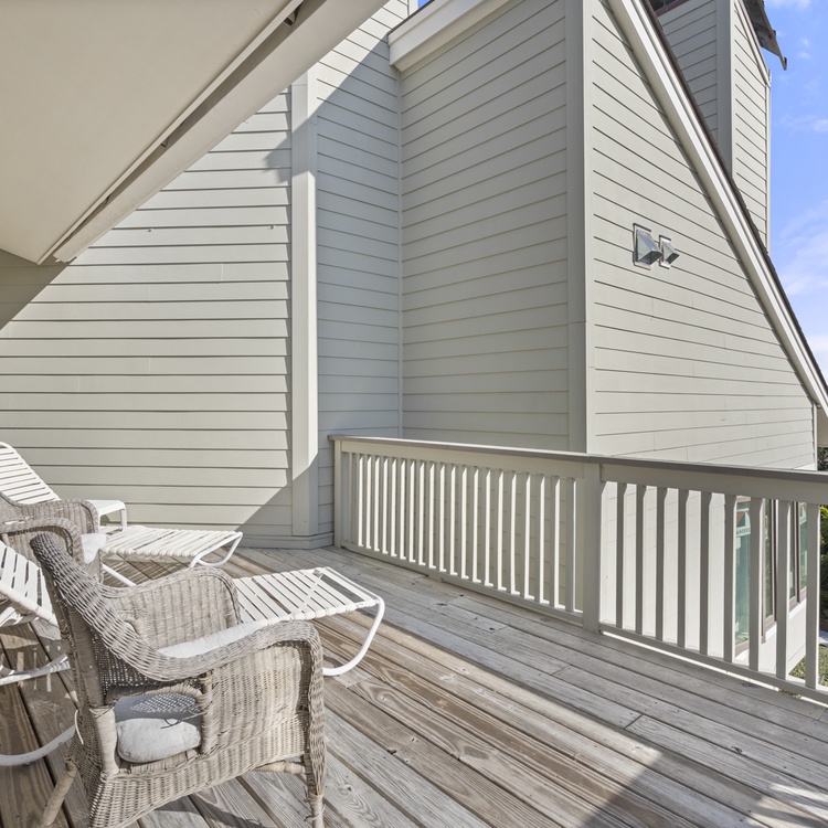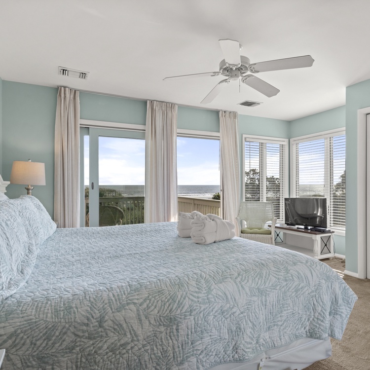 A beadboard stairway leads to the second level, where you will find the villa's three bedrooms. All bedrooms have a king-sized bed, TV, and a bathroom with a walk-in shower. Two of the three bedrooms have access to a shared oceanview deck.