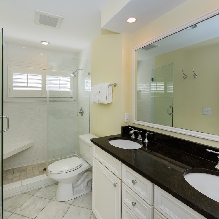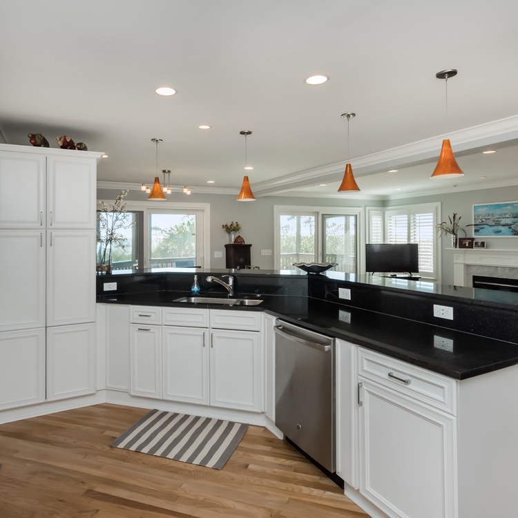 The first floor houses an open living area. The living room offers a large TV, comfortable furnishings, and easy access to the screened porch. The updated kitchen features everything needed for cooking a meal while on vacation and boasts stainless steel appliances, granite countertops, plenty of cabinet space, and bar stool seating for four. Enjoy the ocean views from the dining room table that seats six. Step outside on the breezy screened porch and enjoy morning coffee or an evening cocktail while taking in the beautiful unobstructed view. A half bath completes the 1st floor.