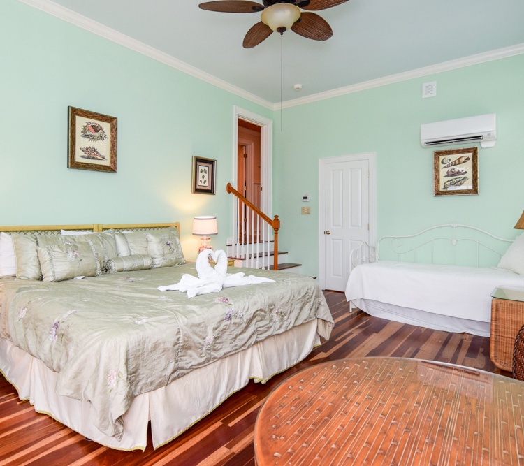 Walk into the first floor of the villa and you are greeted with the staircase to the upper levels of the home. The second floor of the home houses the main living areas. The fully equipped kitchen features stainless steel appliances, granite countertops, and bar with 4 bar stools overlooking the living and dining areas. The spacious living area offers a large flat-screen TV and DVD player, seating for all, and a stereo system with two large speakers. The dining area has seating for six and access to the second-floor porch.