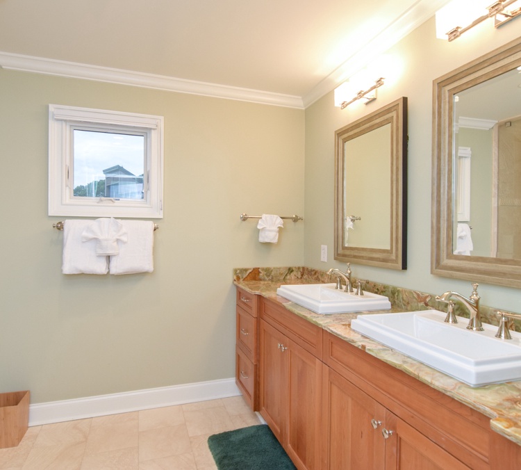 The primary suite, found on the third floor, features a king bed, TV, DVD player, sound system, access to a private deck, and a private bathroom with a walk-in shower and a double sink vanity. On the second floor there is a bedroom with a queen bed, TV with DVD player, and private bathroom with shower. The 3 remaining bedrooms are found on the first floor. One bedroom has a daybed and private bathroom with shower. Another bedroom features a king bed, daybed, seating area, bathroom with a shower, and access to a screened porch. The last bedroom offers a king bed, TV, and private bathroom with tub/shower combo. This bedroom also has access to the screened porch.