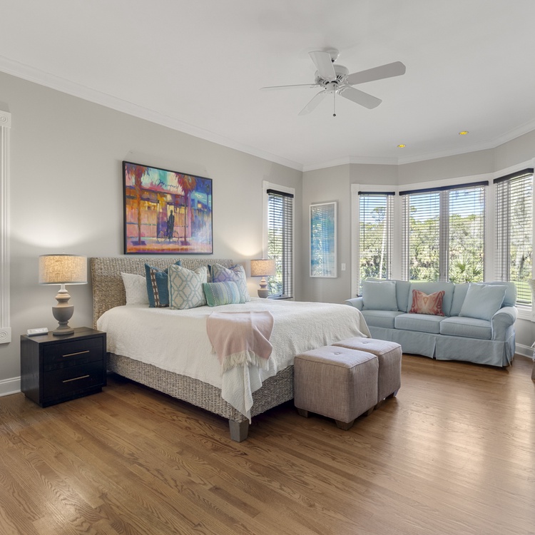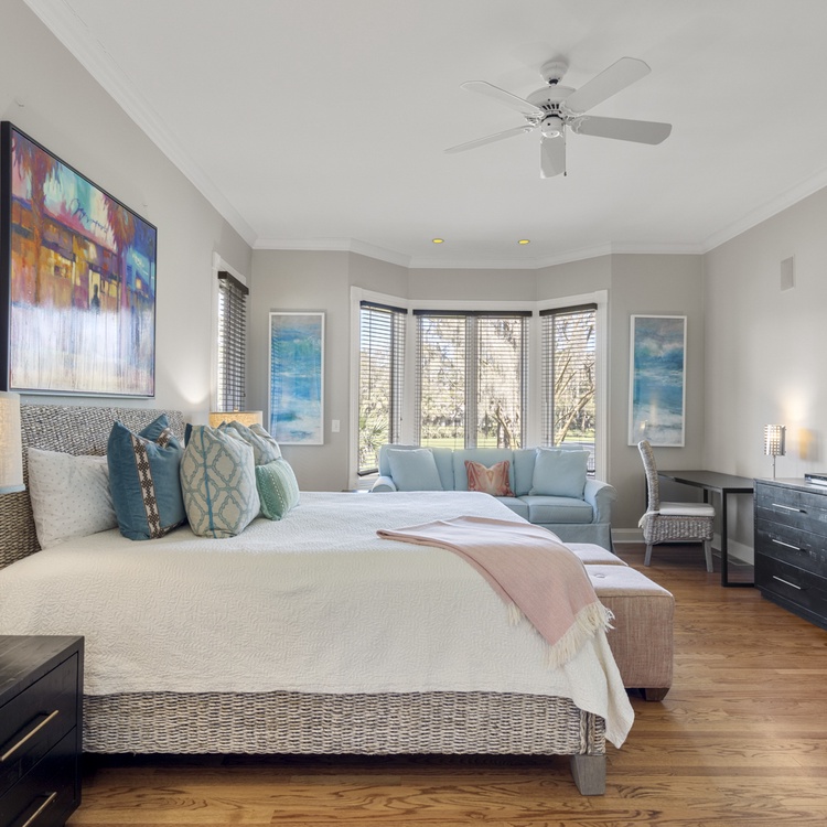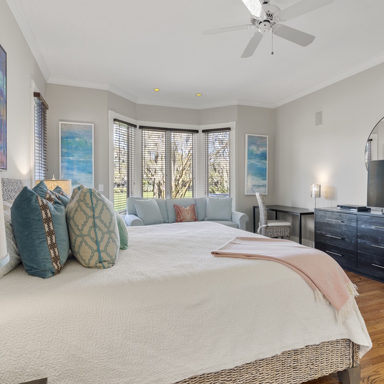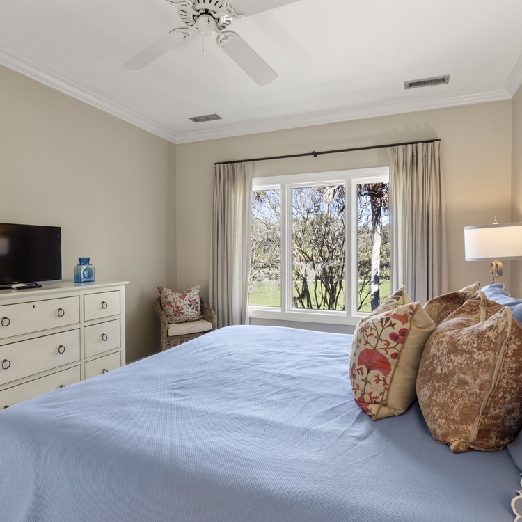 The main floor primary suite features a king bed, sitting area, flat-screen TV, views of the golf course, and private bathroom with double sinks and separate bathtub and shower. Three additional bedrooms - two king bedrooms and one queen bedroom are located on the second level and offer private bathrooms, TVs, and golf views.