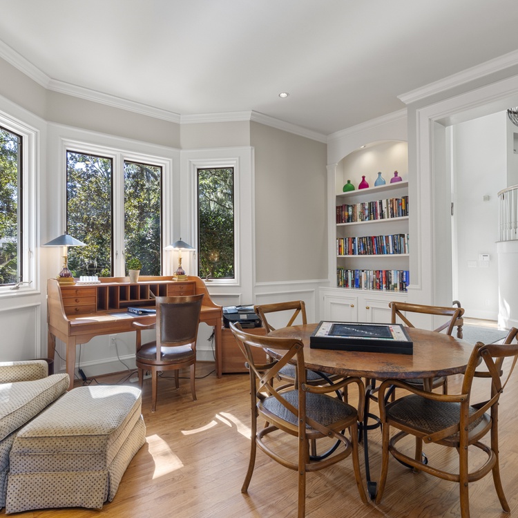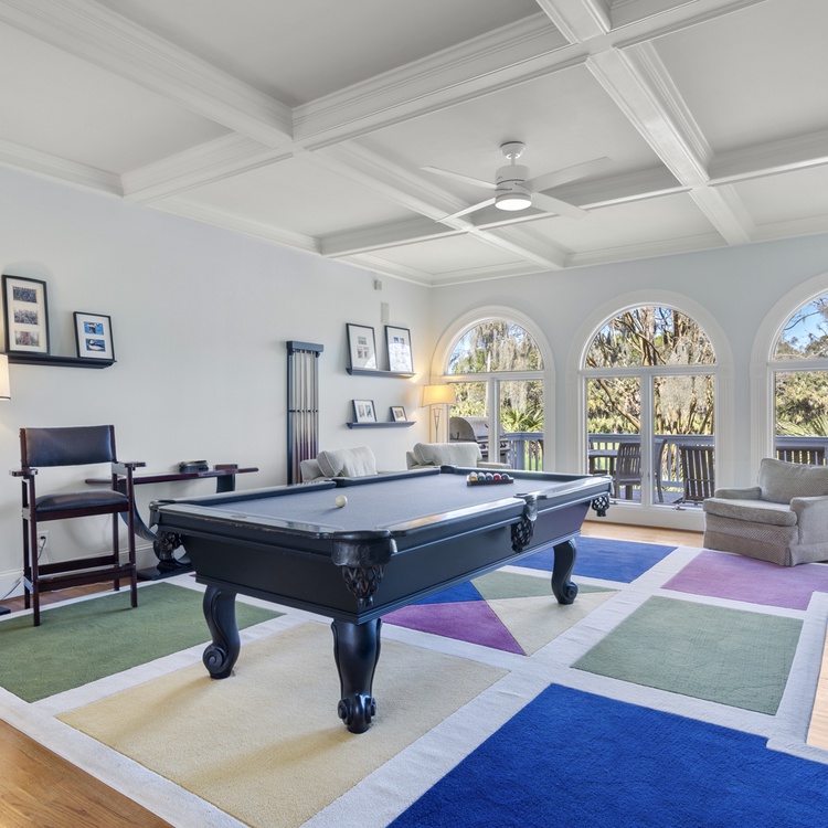 The main level features an open living space with access to the back deck and pool overlooking the golf course. The living area offers plenty of comfortable seating and a flat-screen TV. The updated kitchen features custom cabinetry, tile backsplash, a center island, and an elevated bar with four bar stools. The light-filled dining area offers a long, elegant table with seating for ten. A game room offers a pool table, sitting area, and wall-mounted flat-screen TV. A sitting room off of the foyer features a desk, library, and table for four.