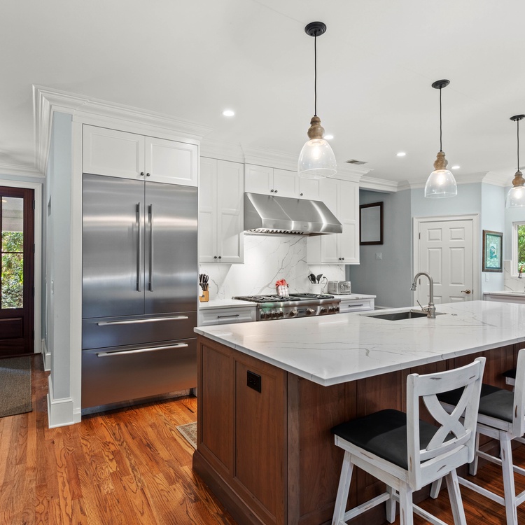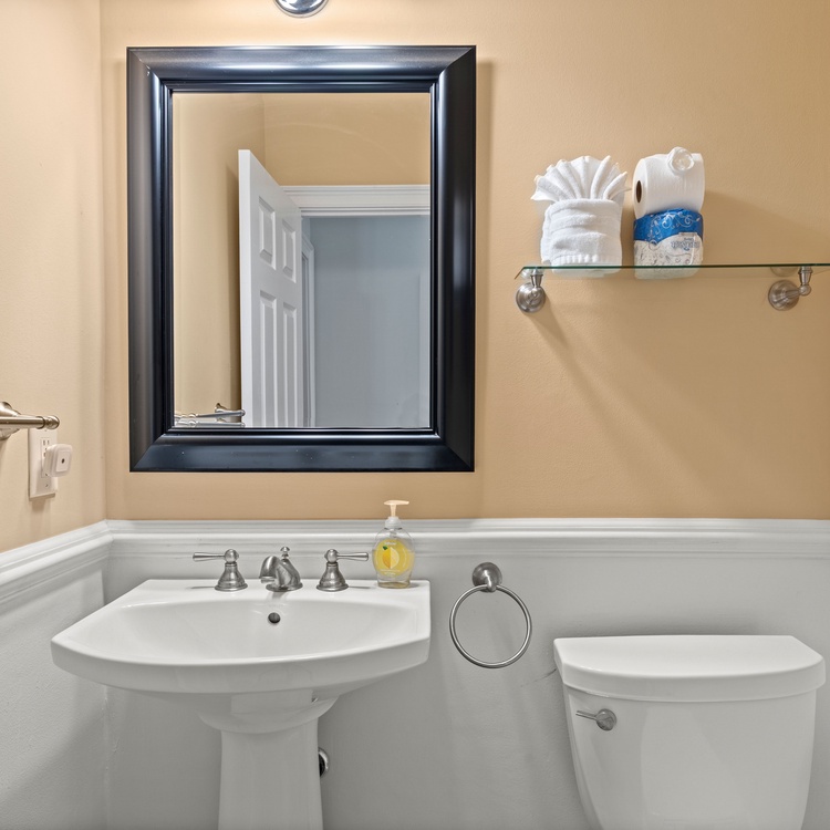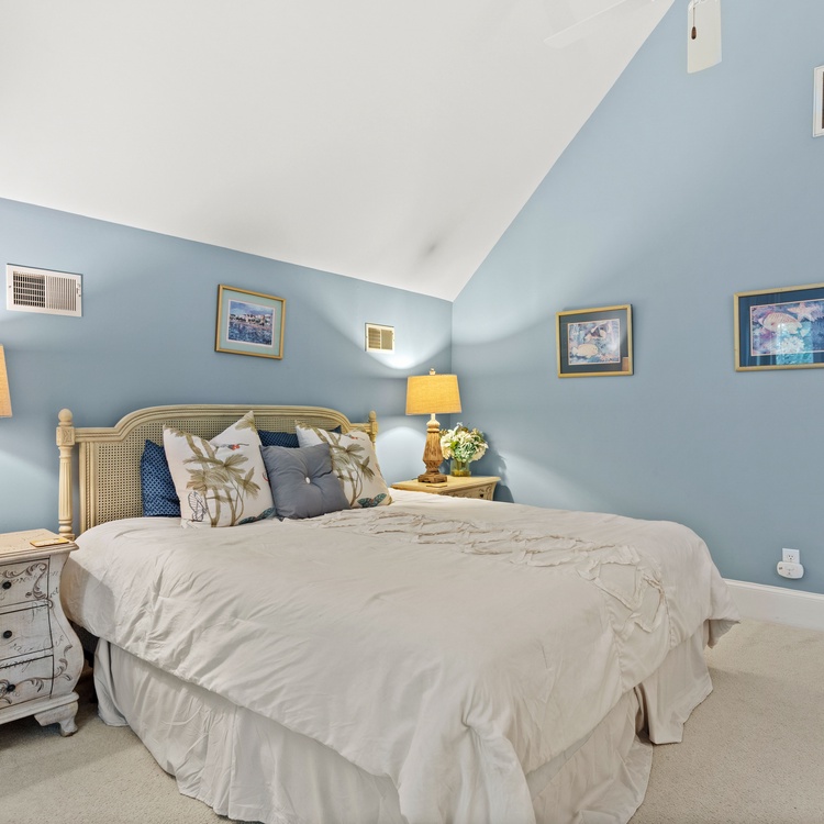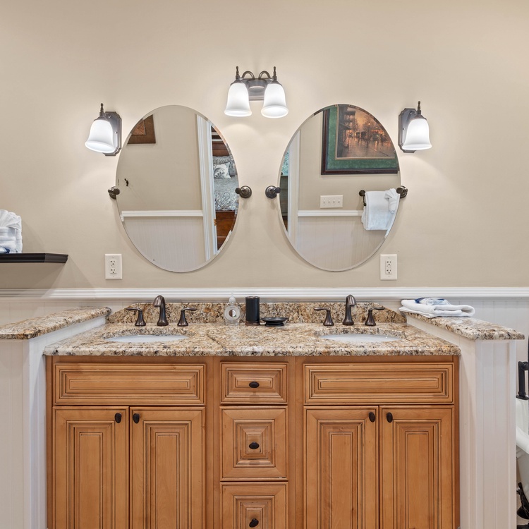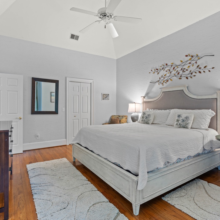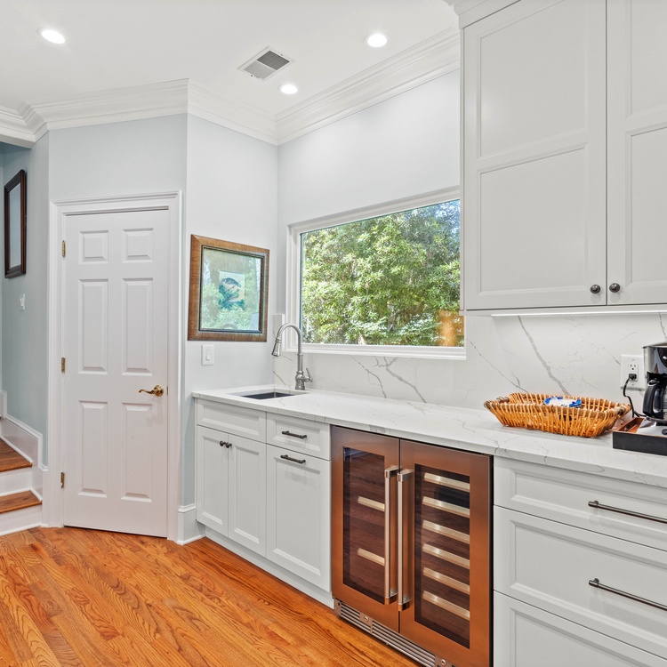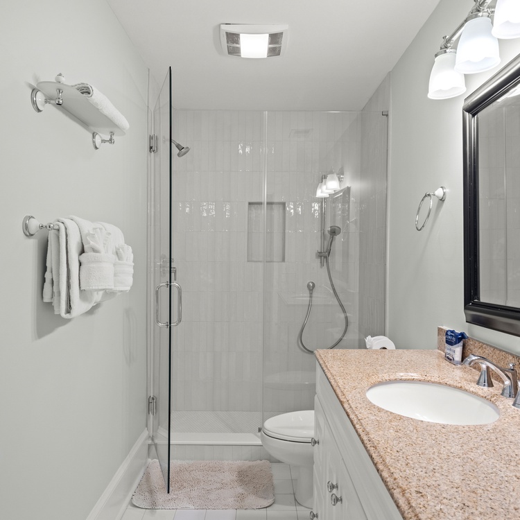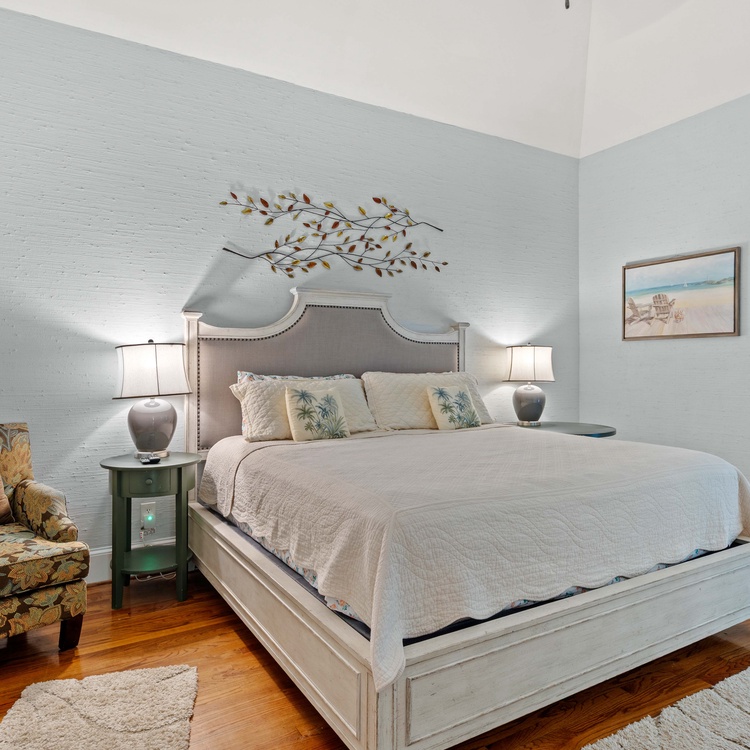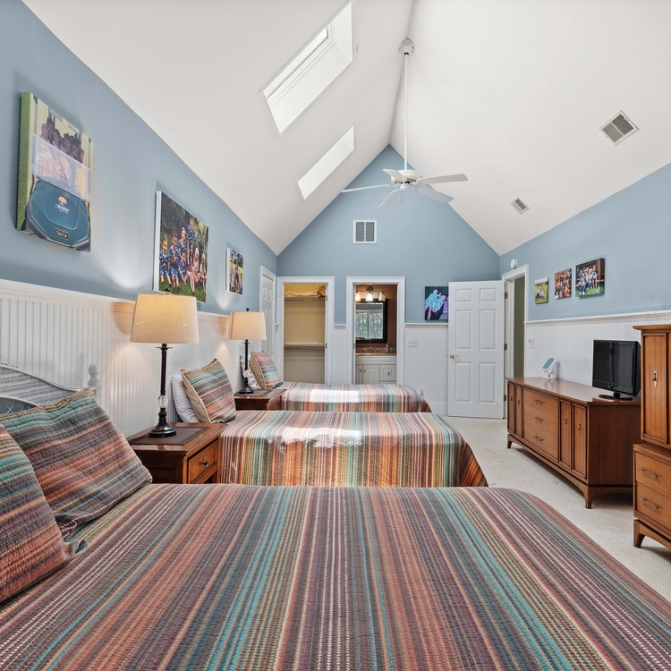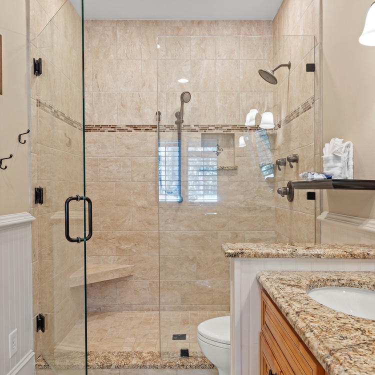 Downstairs, you will find two of the home’s bedrooms. The primary suite offers a king-sized bed, wall-mounted TV, access to the screened porch, and a luxurious bathroom with an expansive walk-in shower. The second downstairs bedroom has a king-sized bed, a comfortable sofa tucked into a windowed nook, and a private bathroom with a walk-in shower. The remaining two bedrooms are just up the stairs: a king bedroom and a bedroom with two twin over twin bunk beds. The upstairs bathrooms offer showers, bathtubs, white cabinetry, and stone countertops with under-counter sinks.