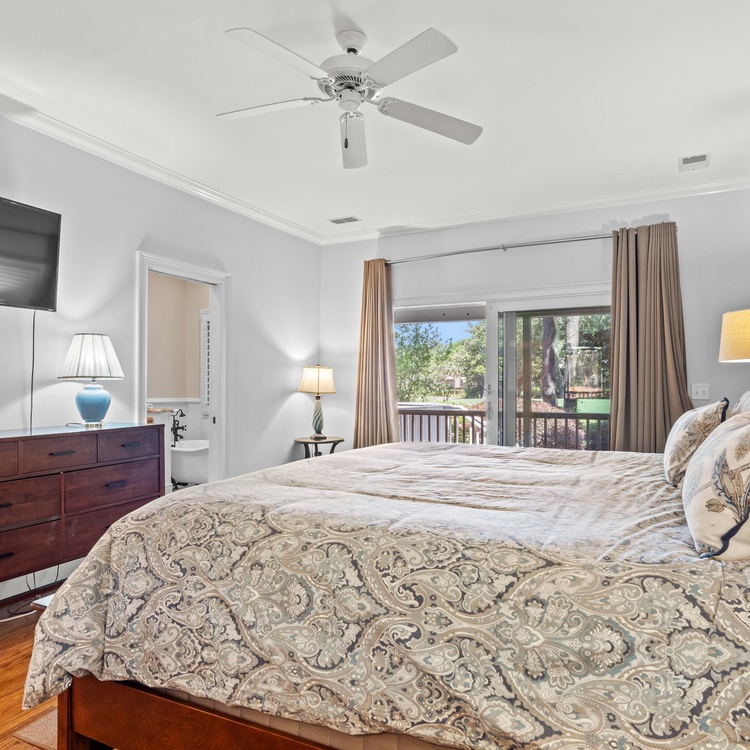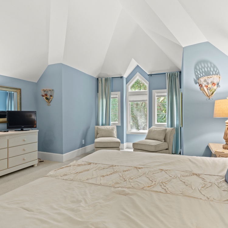 The home’s main living space is within the great room and boasts a vaulted ceiling, second-story windows, and views of the fairway through large glass doors. The living area opens to the dining area with seating for eight guests. Fully equipped to prepare your vacation meals, the kitchen has plenty of counter space and a windowed breakfast nook with dining space for 4 guests.
