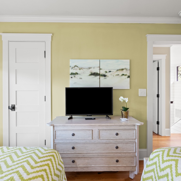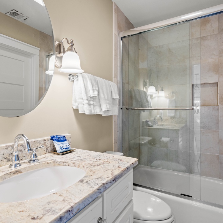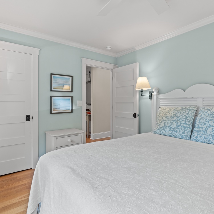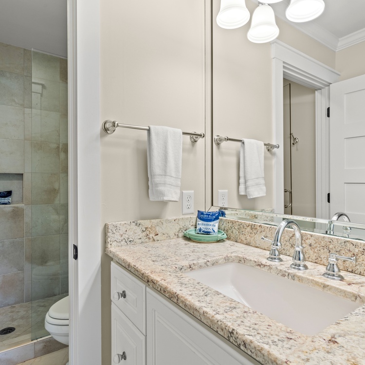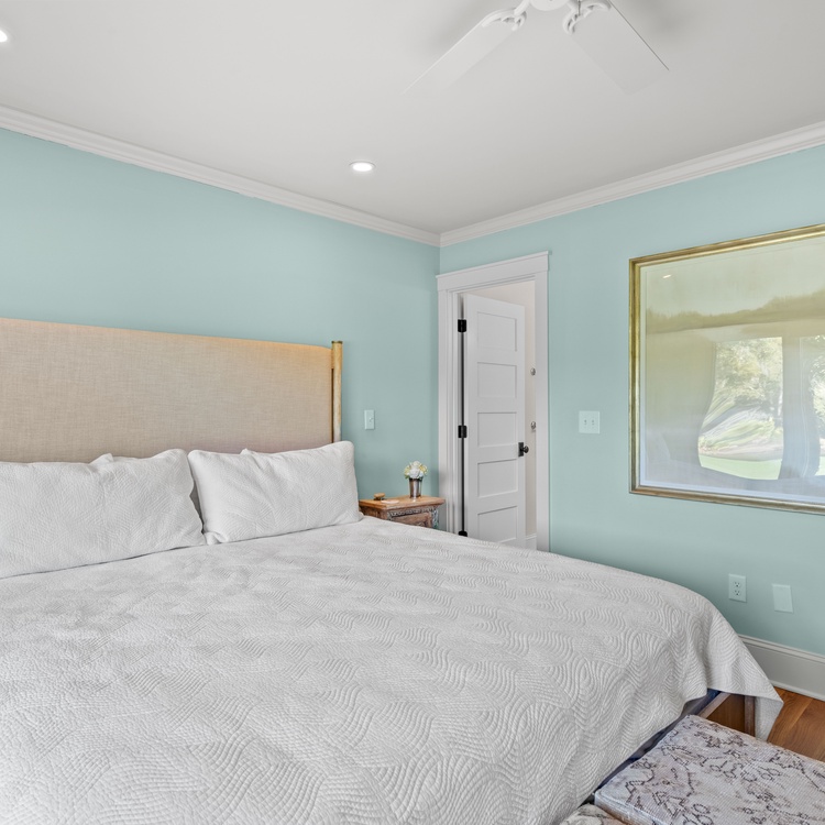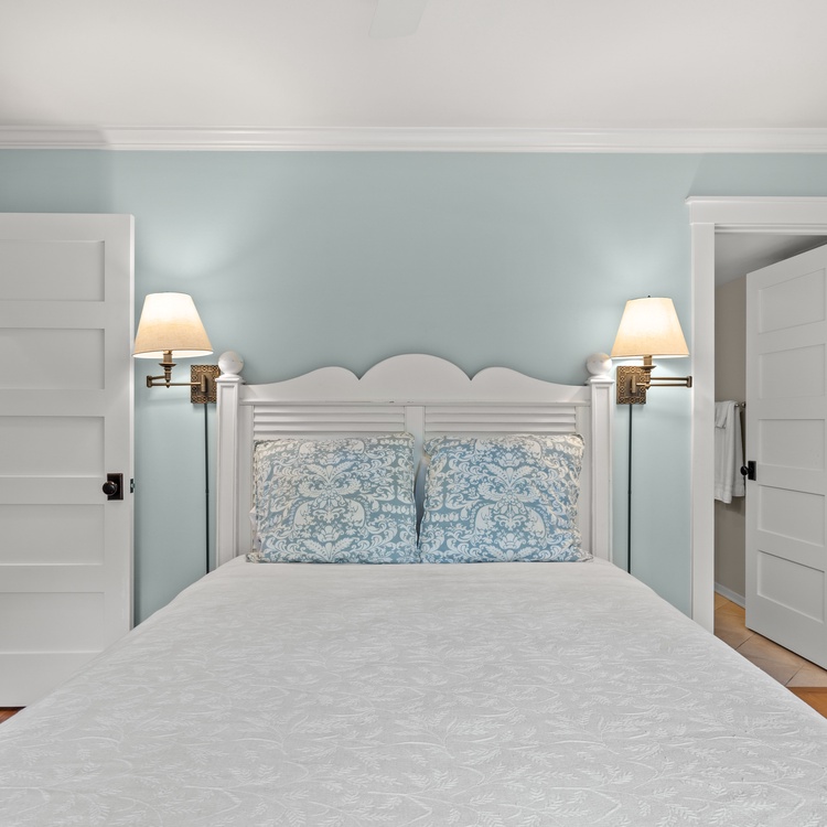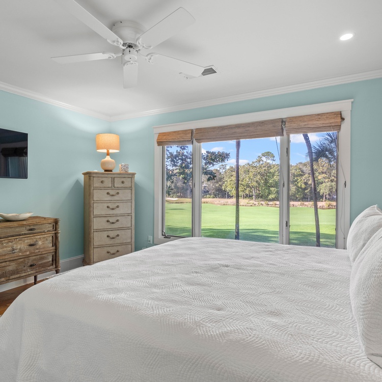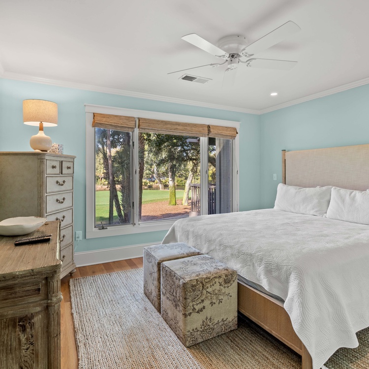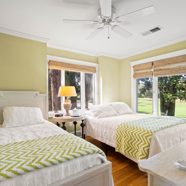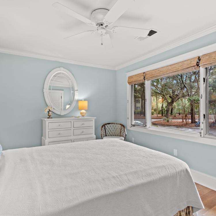 The villa's first bedroom is conveniently located on the main level. This bedroom has a queen-sized bed and a private bathroom with a walk-in shower. The two remaining bedrooms are located up a short flight of stairs. Offering a king-sized bed, a coastal color palette, and lovely golf views, the primary bedroom is a retreat in itself. The attached private bathroom has a walk-in shower. The final bedroom has one twin bed, one queen bed, and an attached bathroom with a shower/tub combo. A queen air mattress is also available for guest use.