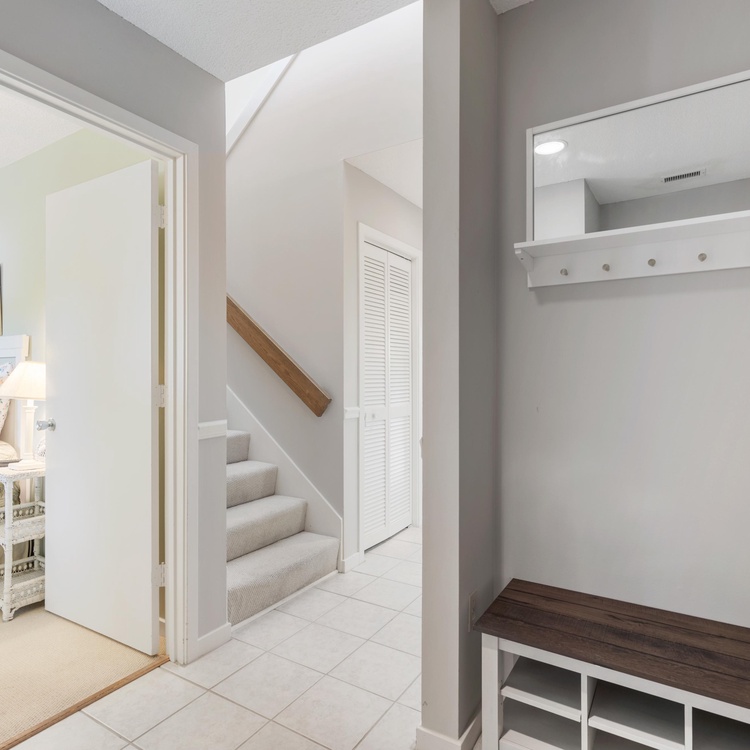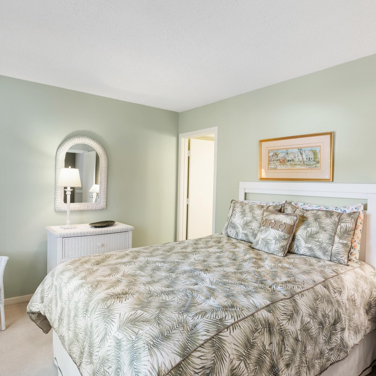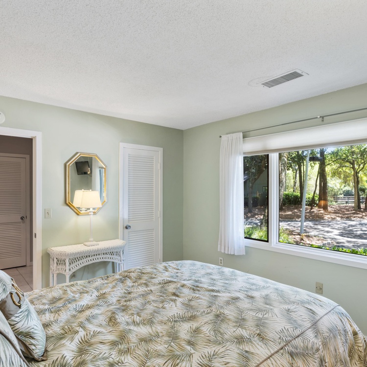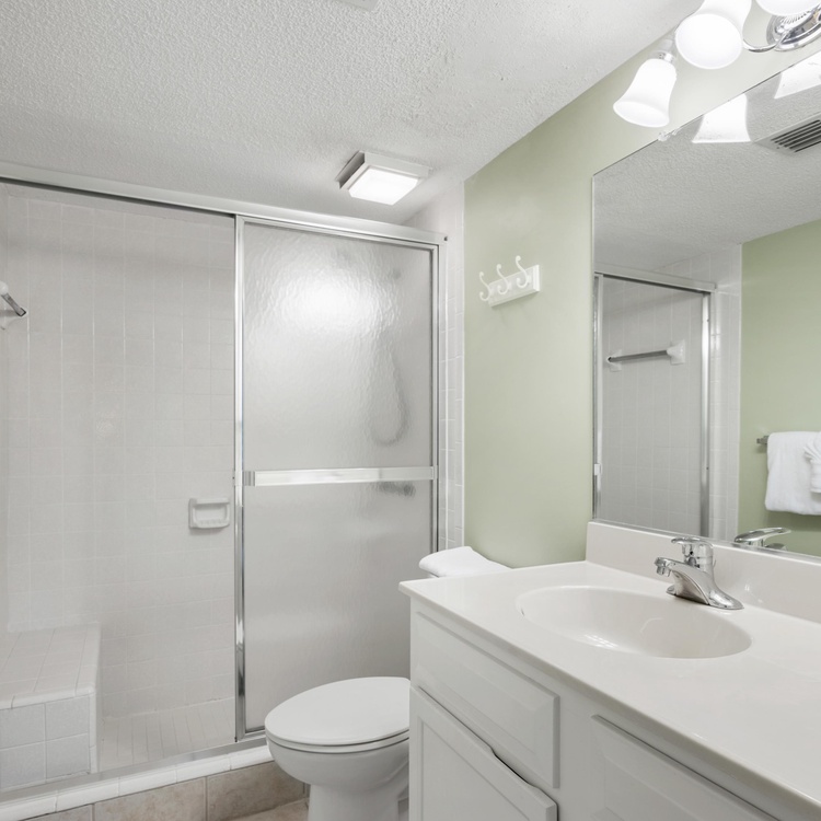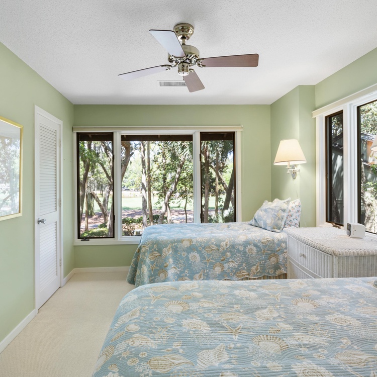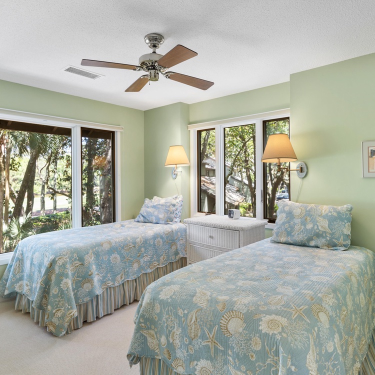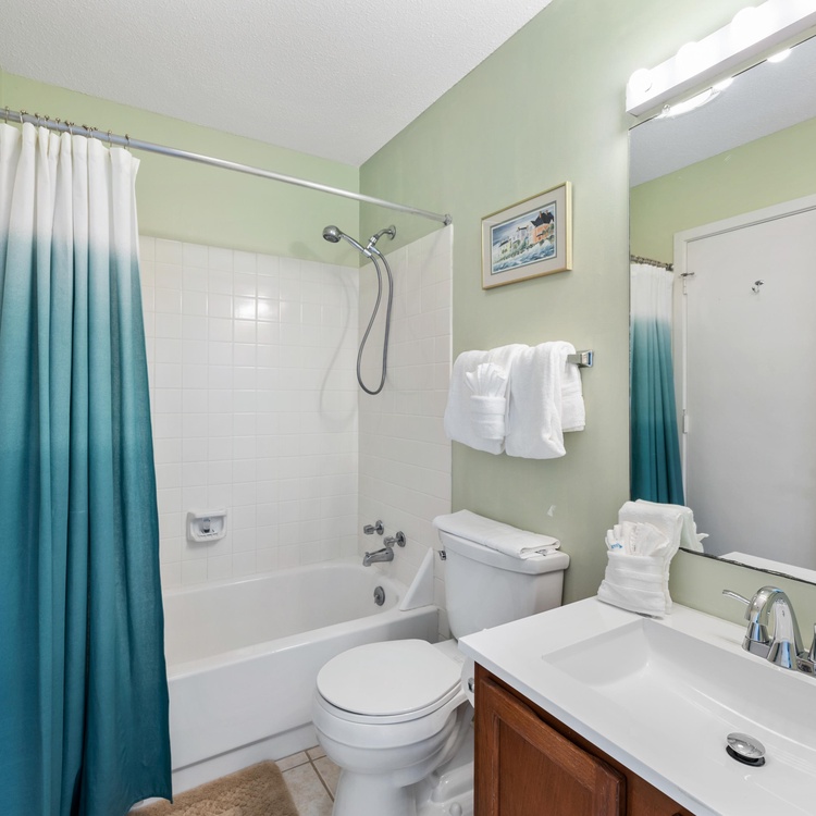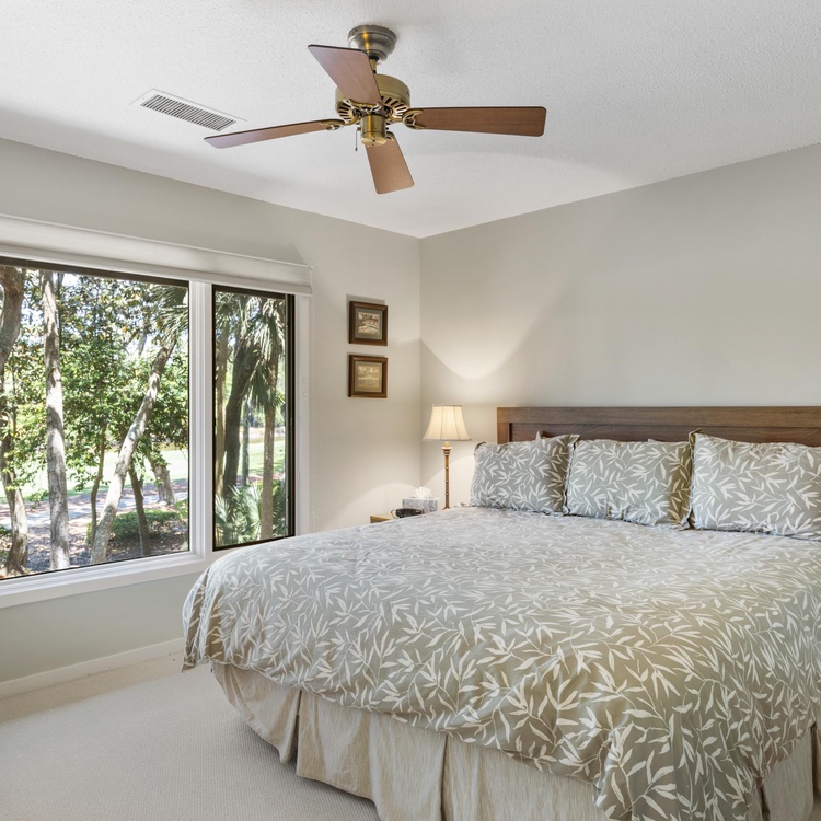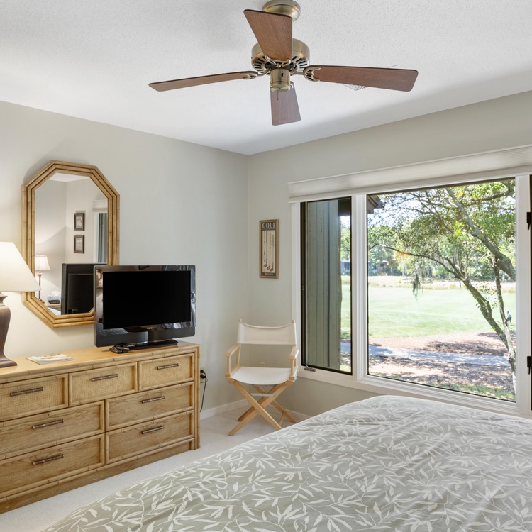 Three large bedrooms, one downstairs and two upstairs, are perfect for unwinding after a day of golfing or beachcombing. The first-floor bedroom offers a full-sized bed, a TV, and an attached bathroom with a walk-in shower. Ascend the stairs to find two additional bedrooms with scenic golf views. The primary bedroom features a king-sized bed, a TV, and a private bathroom with a shower tub combo. The final bedroom has two twin beds and a bathroom with a shower/tub combo.