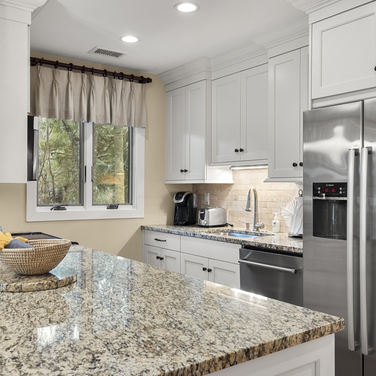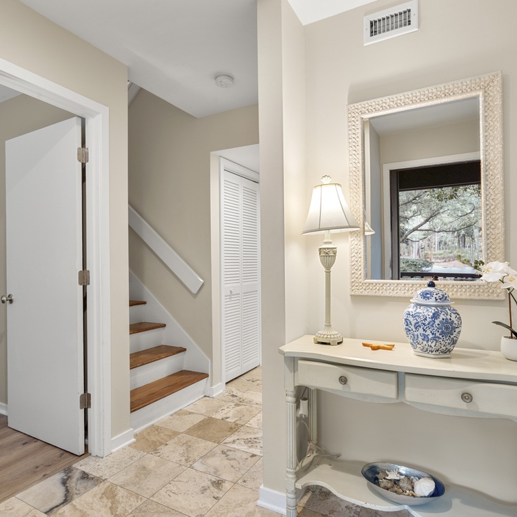 This end-unit Fairway Oaks villa offers two floors of living space. To maximize the golf views, the reverse floor plan has three bedrooms located on the first floor and the main living space and fourth bedroom on the second floor. The open living space features desirable updates and finishes. The kitchen showcases granite countertops, tile backsplash, stainless steel appliances, white cabinetry, and a wide counter bar with seating. The light-filled dining room comfortably seats your entire group and provides access to the golf course view deck. The living room offers ample seating, large flat-screen TV, and spacious wet bar for entertaining.