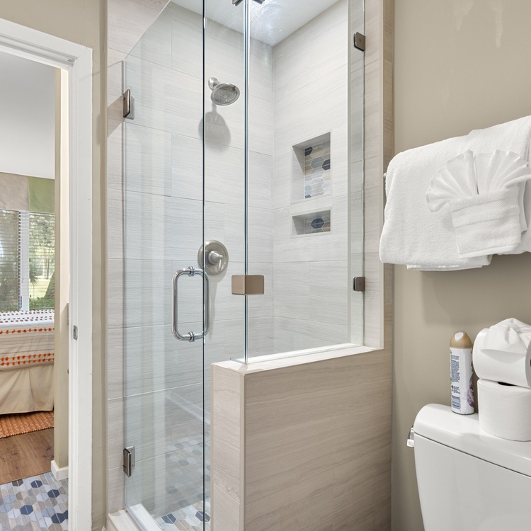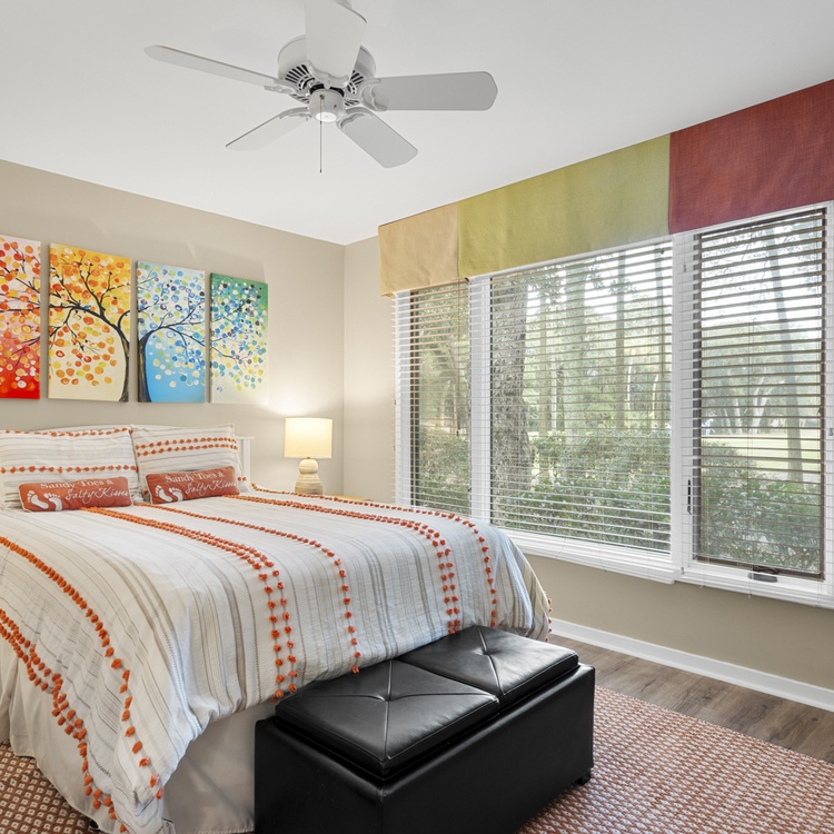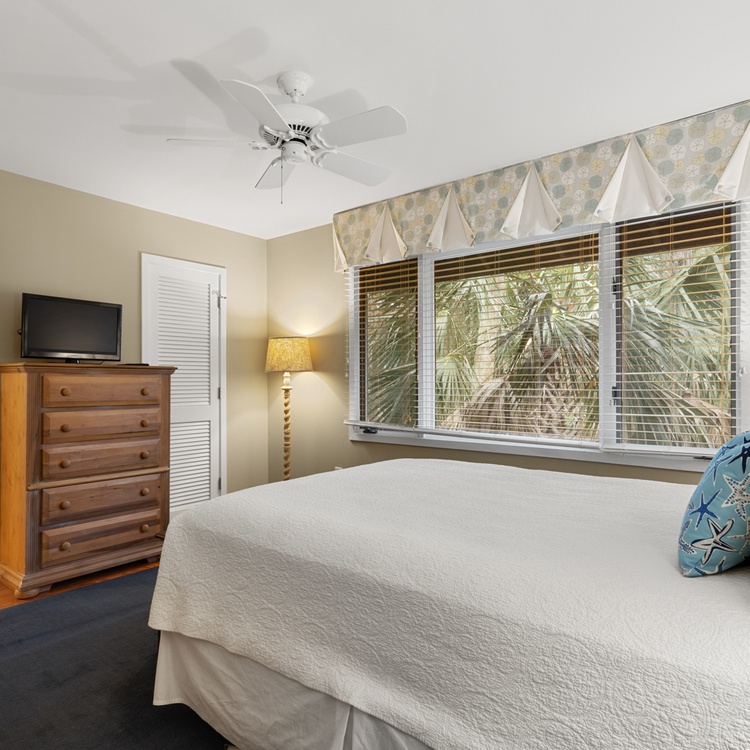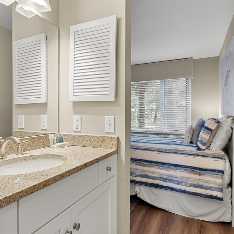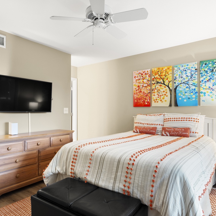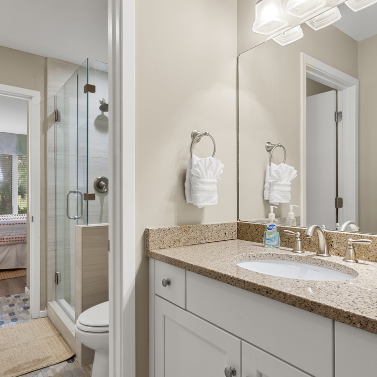 The first-floor primary suite offers a king bed, flat-screen TV, golf views, and bathroom with bathtub/shower combo. Two additional bedrooms, both with one queen bed, each have a flat-screen TV and sink vanity area and share the bathroom with shower. Ascend the stairs to the second floor and you reach the fourth bedroom with a queen bed, flat-screen TV, and bathroom with shower.