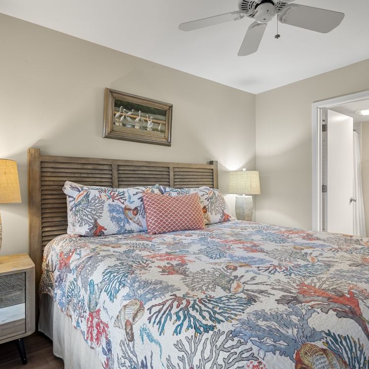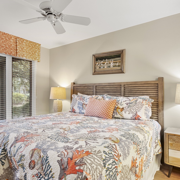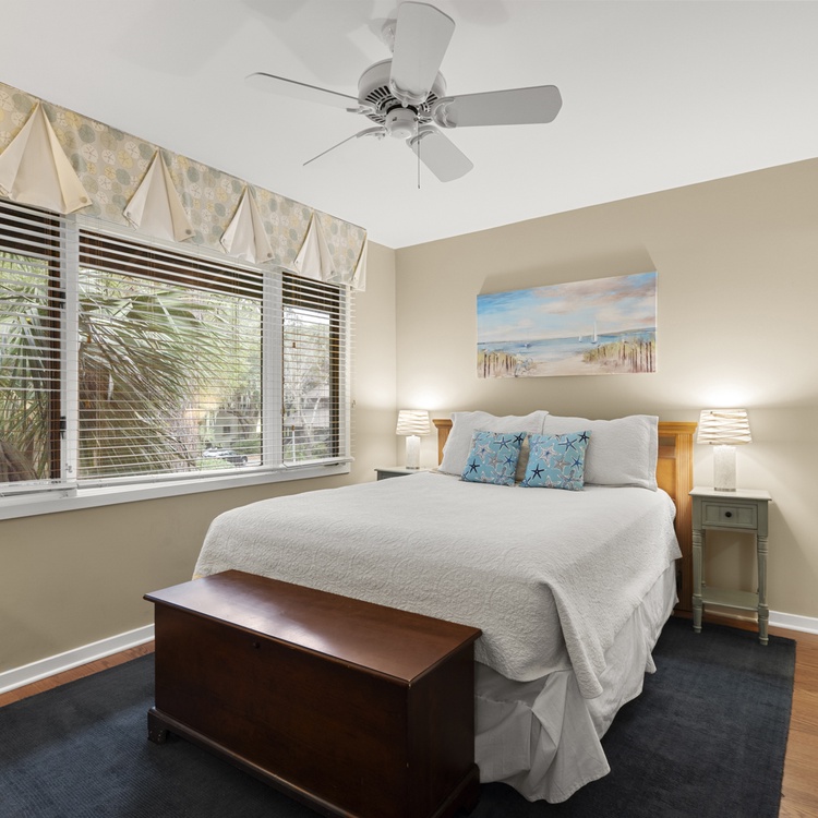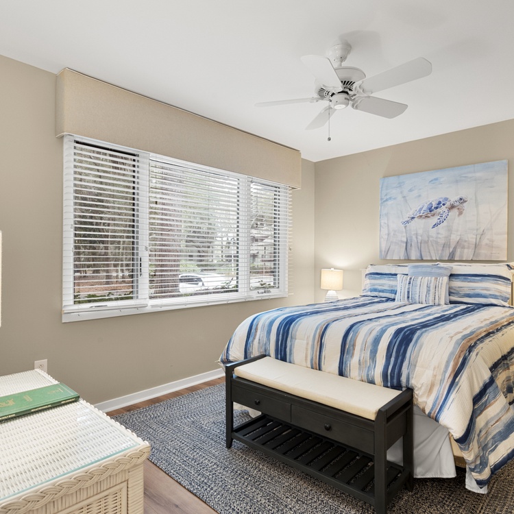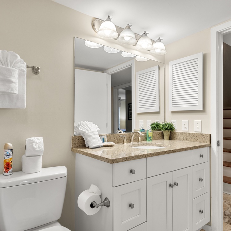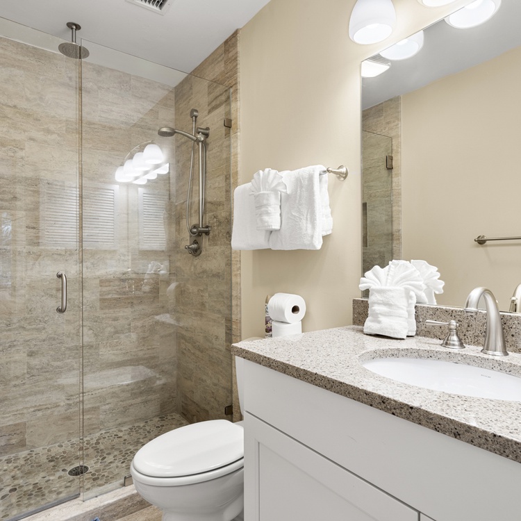 The first-floor primary suite offers a king bed, flat-screen TV, golf views, and bathroom with bathtub/shower combo. Two additional bedrooms, both with one queen bed, each have a flat-screen TV and sink vanity area and share the bathroom with shower. Ascend the stairs to the second floor and you reach the fourth bedroom with a queen bed, flat-screen TV, and bathroom with shower.