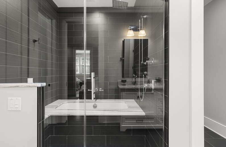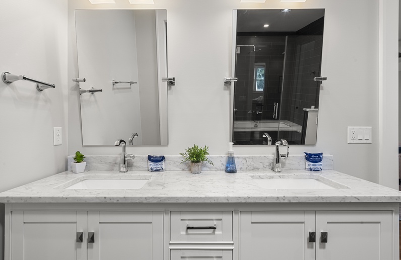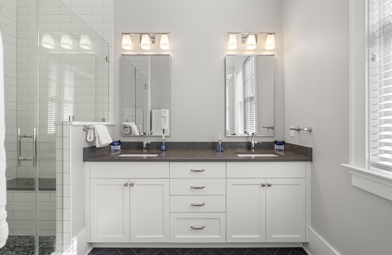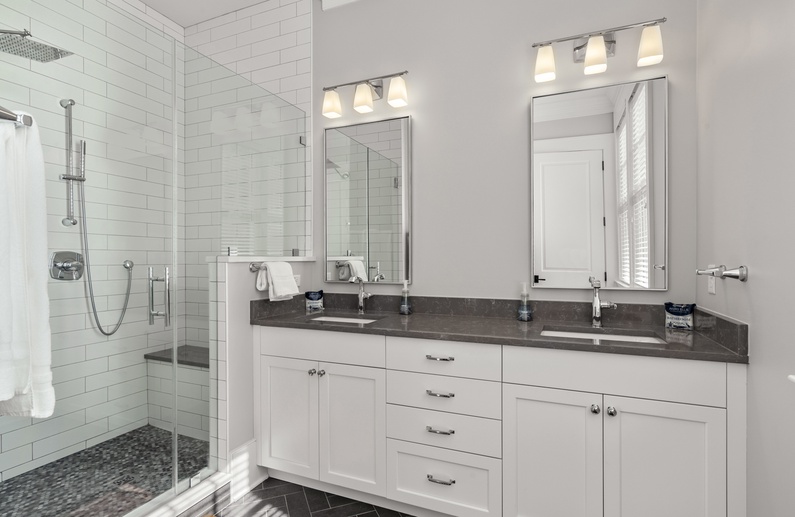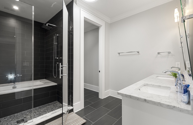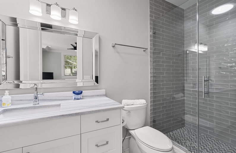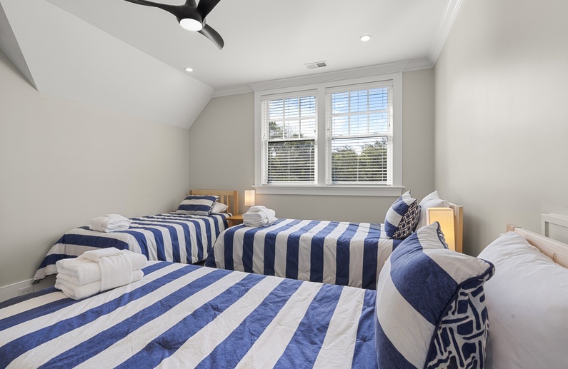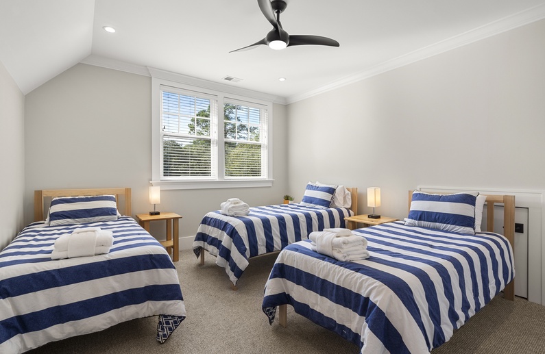 The fourth bedroom is perfect for kids as it features 3 twin-sized beds and a third bathroom equipped with a walk-in glass shower and bathtub combination. This bathroom is also accessible from the hall.