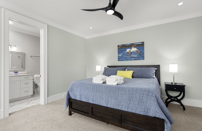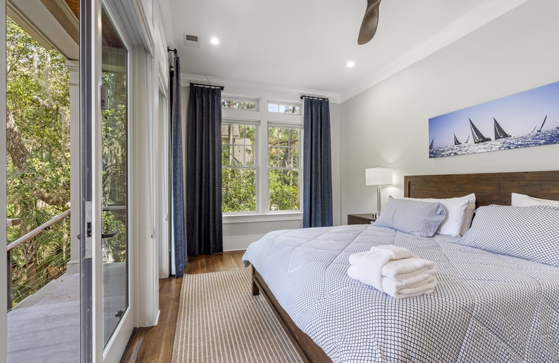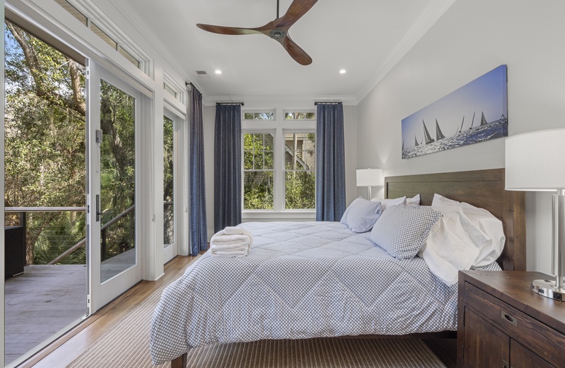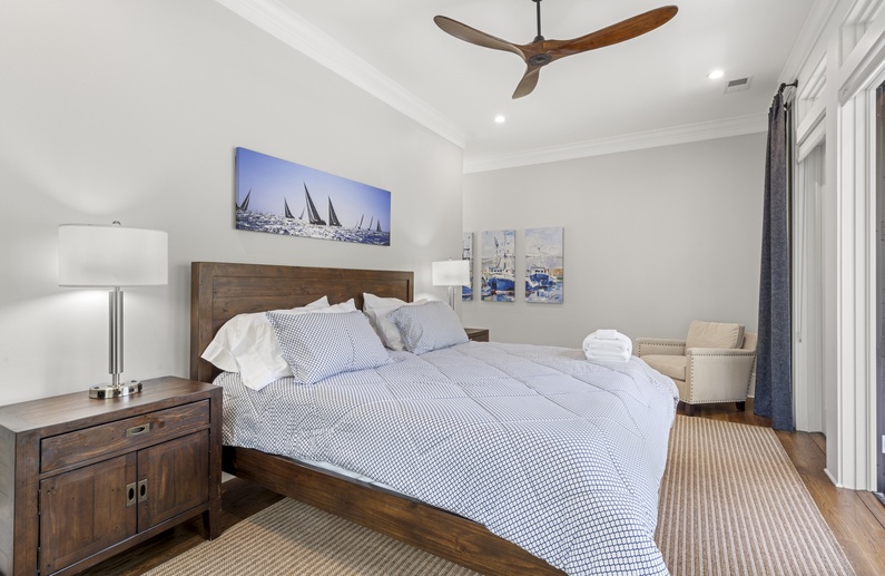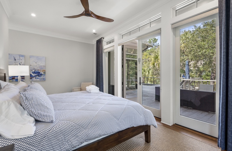 The first-floor primary bedroom features French door access to the deck, and a king-sized bed with notable bedding. It also features a private bathroom with a double sink vanity and a glass walk-in shower.