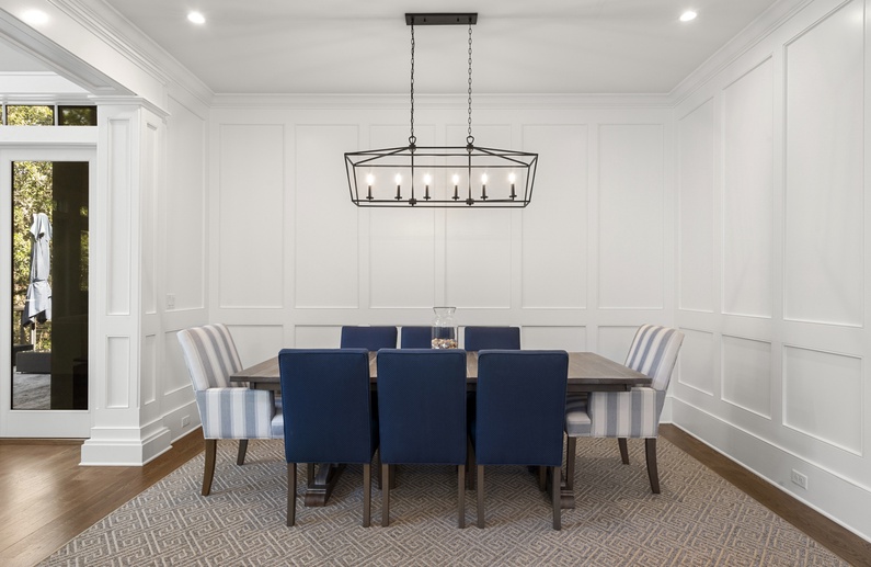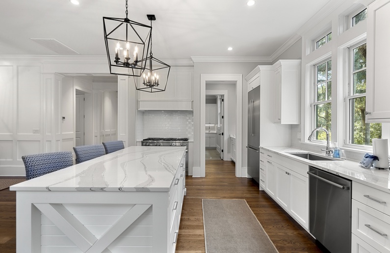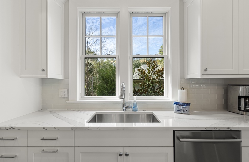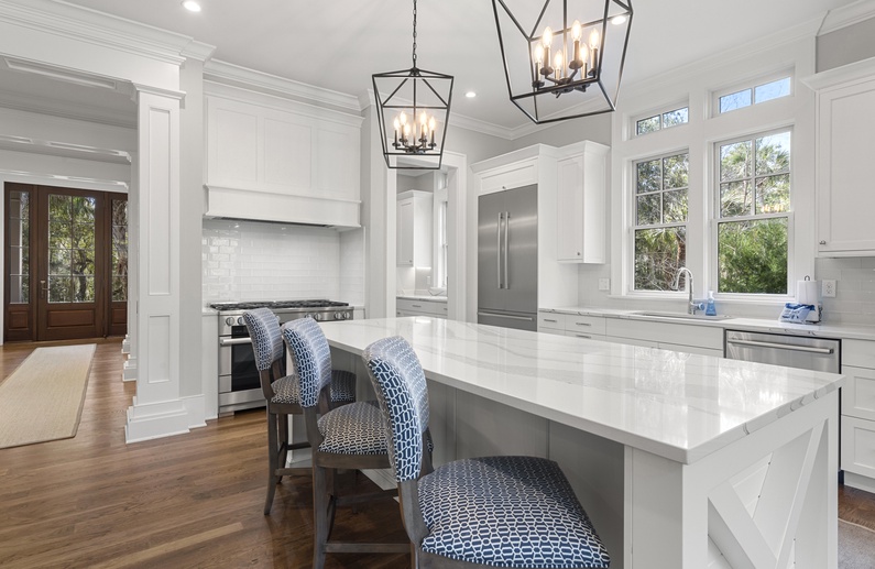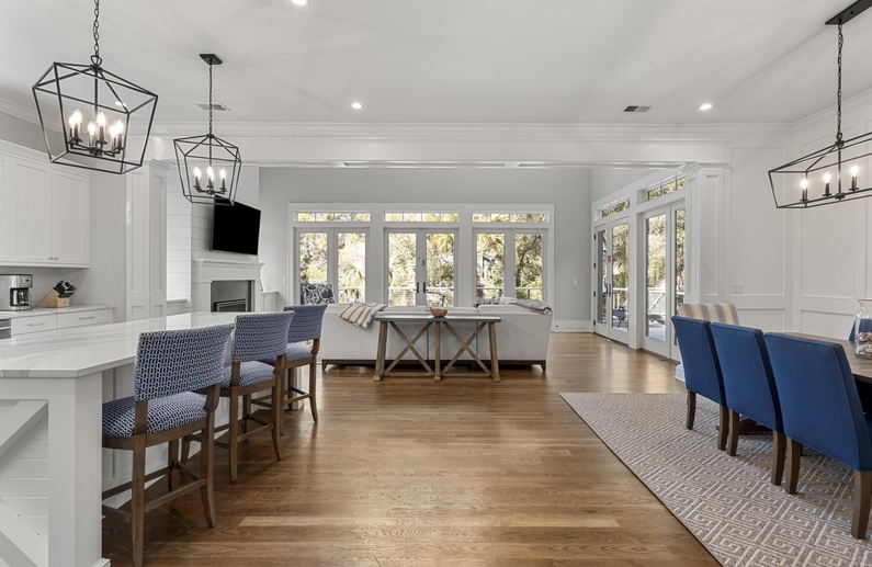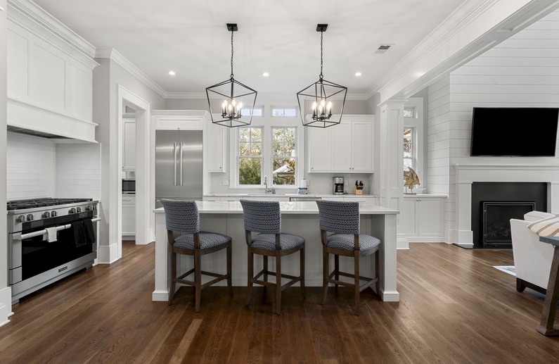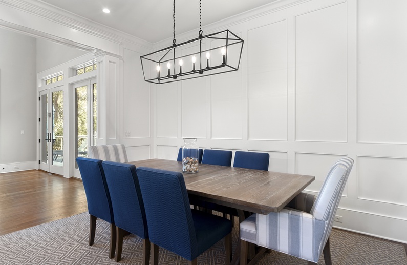 Upon entering the property, you’ll find exquisite finishes, accentuated hardwood flooring, high ceilings, and an abundance of natural light. In the main living area, you will find upscale and comfortable seating, a large flat-screen TV, and French door access to the pool and back deck. The doors leading out to the pool deck also have an optional alarm system. The fully equipped kitchen offers white cabinetry, ample counter space, and a center island with barstool seating. The dining area serves as the perfect entertainment space as it offers pool and deck views, seating for your whole party, and close proximity to the kitchen.