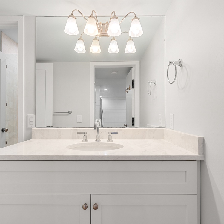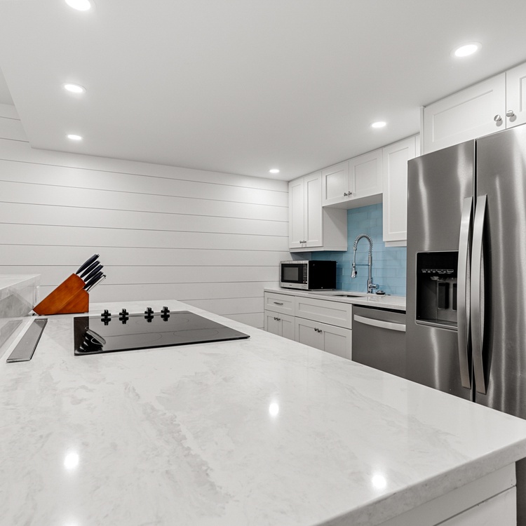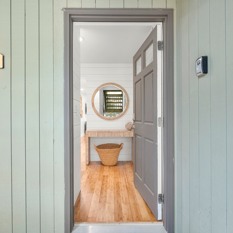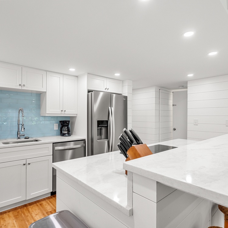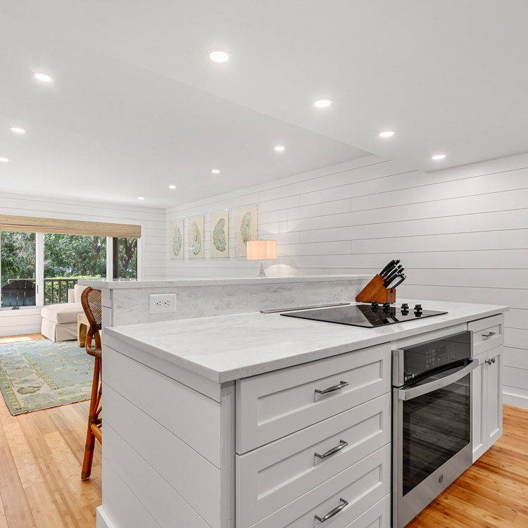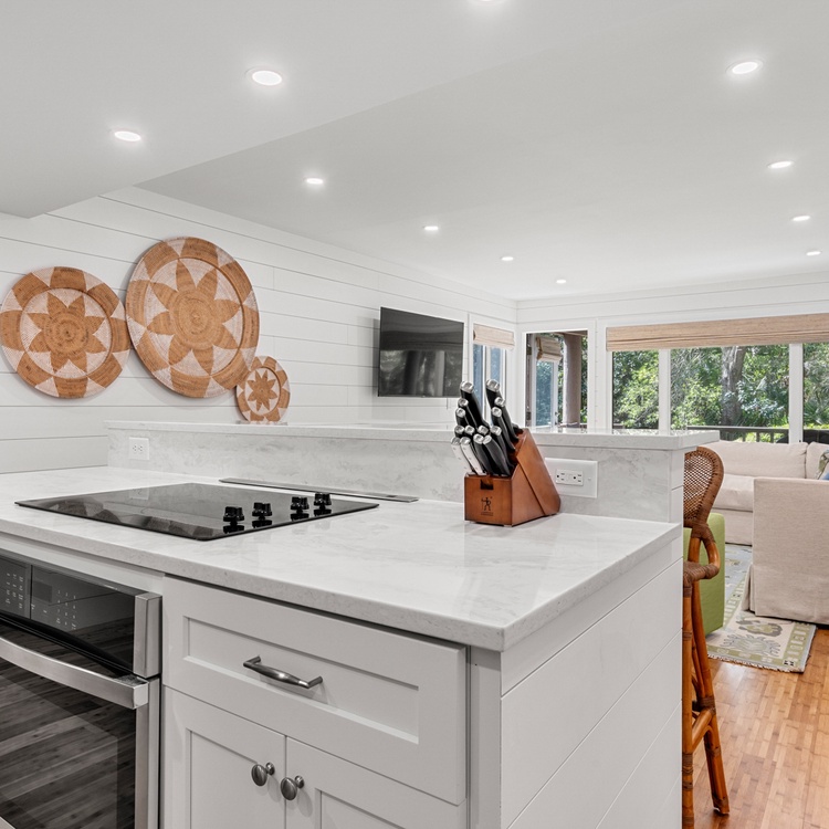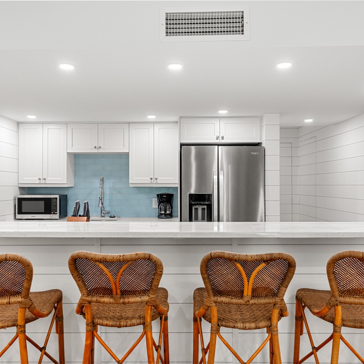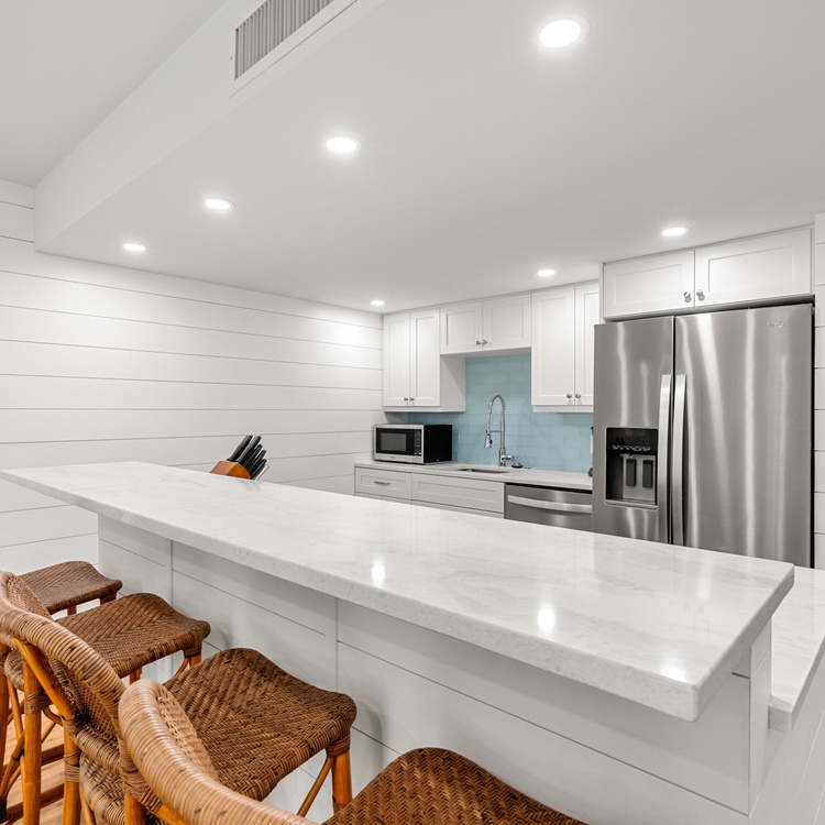 The living room offers guests ample seating and plenty of natural light. The updated kitchen provides brand new stainless steel appliances, a beautiful coastal backsplash, and seating for four.