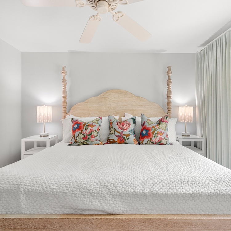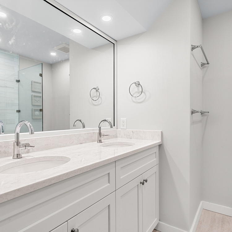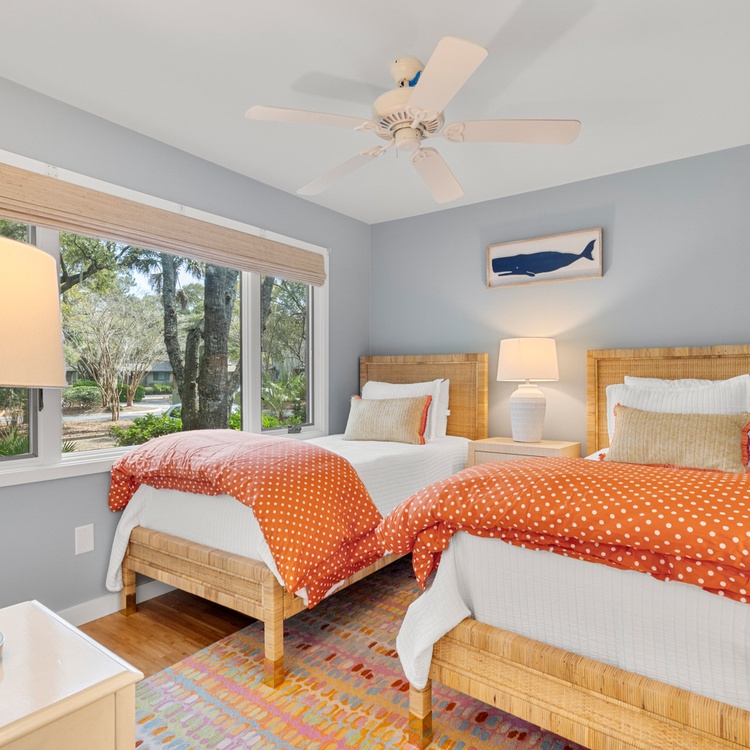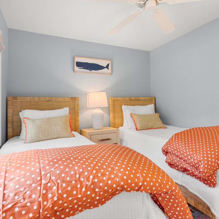 In the primary bedroom, you’ll find a king-size bed and a flat-screen television. Attached to the primary bedroom is a full bathroom featuring a dual vanity and walk in shower. Near the front of the villa, the second bedroom is located just off the main entrance and provides two twin beds. A full size bathroom is accessible from the bedroom as well as from the hall.