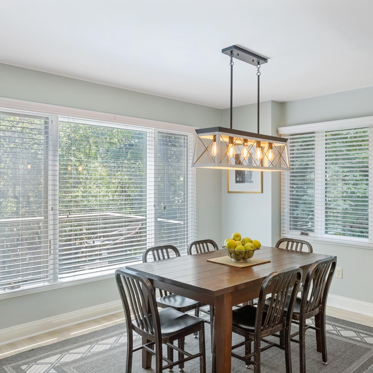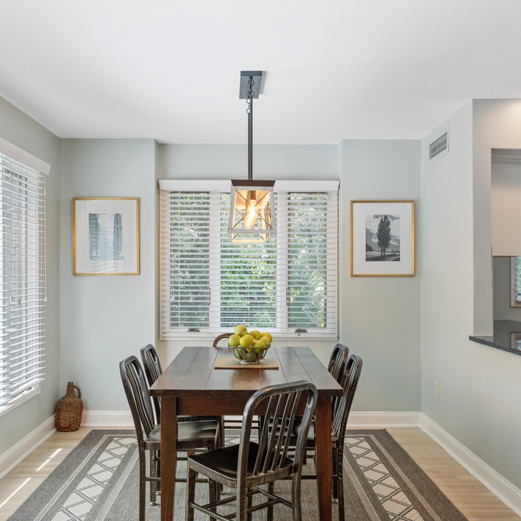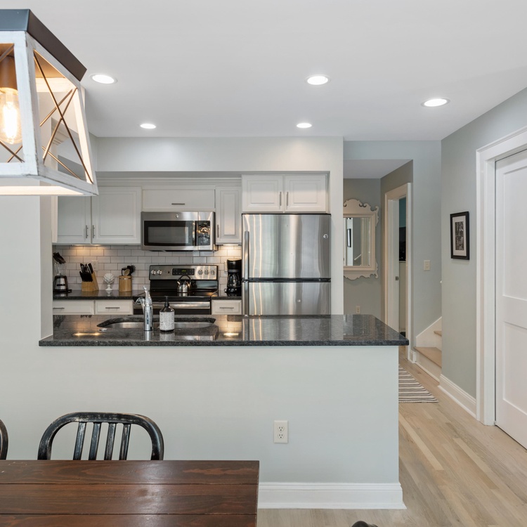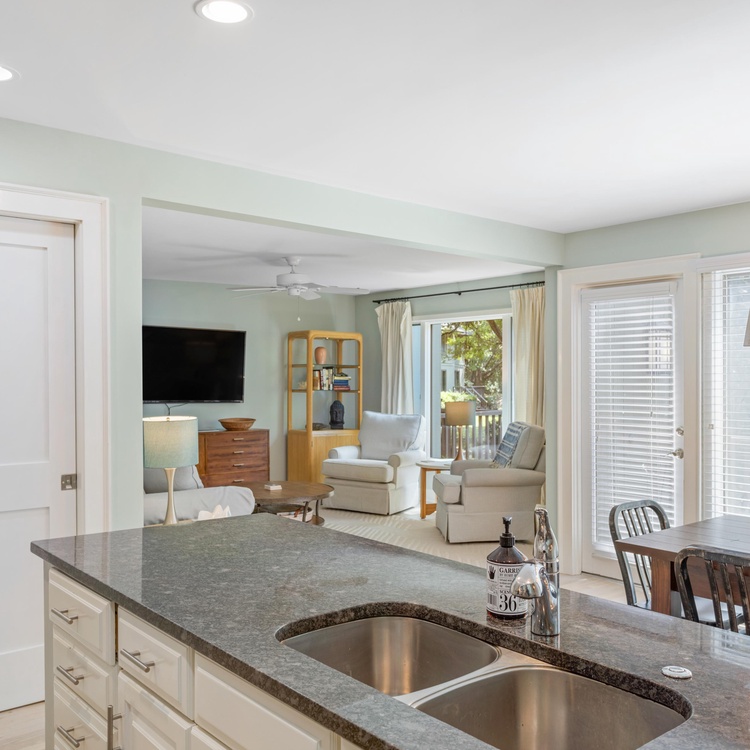 The living room offers comfortable seating for viewing the wall-mounted flat-screen TV. The dining room features a table for six as well as access to the back deck. The fully equipped kitchen is open to the dining room and features dark countertops against white cabinetry and backsplash. A half bath is also located on the first floor.