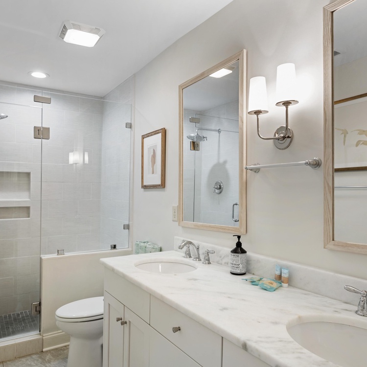 The first-floor bedroom offers a queen bed, flat-screen TV, and bathroom with shower. The second floor features two additional bedrooms. The primary suite offers a king bed, flat-screen TV, and bathroom with double sinks and shower. The third bedroom offers two twin beds, TV, and bathroom with shower/tub combo.