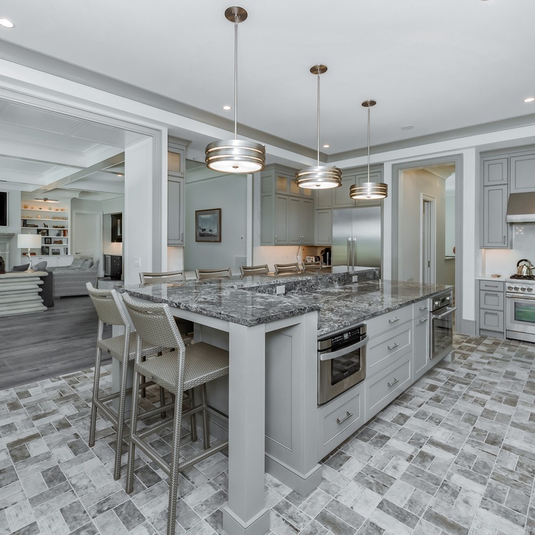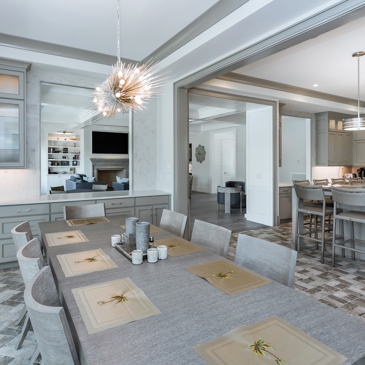 The main living area is located on the first floor and features a coffered ceiling, two sofas, and two chairs around the large flat-screen TV, three chairs and a table perfect for playing cards, a wet bar with wine cooler, and easy access to the back deck. The back deck features gorgeous views of Osprey Point Golf Course, a pool, spa, table for dining, and several lounge chairs. Back inside, guests will enjoy the bright sunroom featuring a sofa and two chairs. The dining space offers comfortable seating for 10 and is close to the large kitchen island with seven barstool seats. The upgraded, fully-equipped kitchen features stainless steel appliances and plenty of cabinet and counter space.