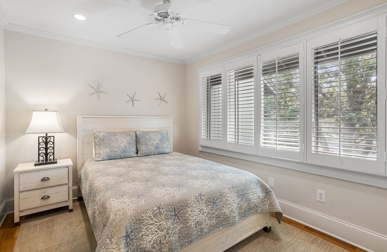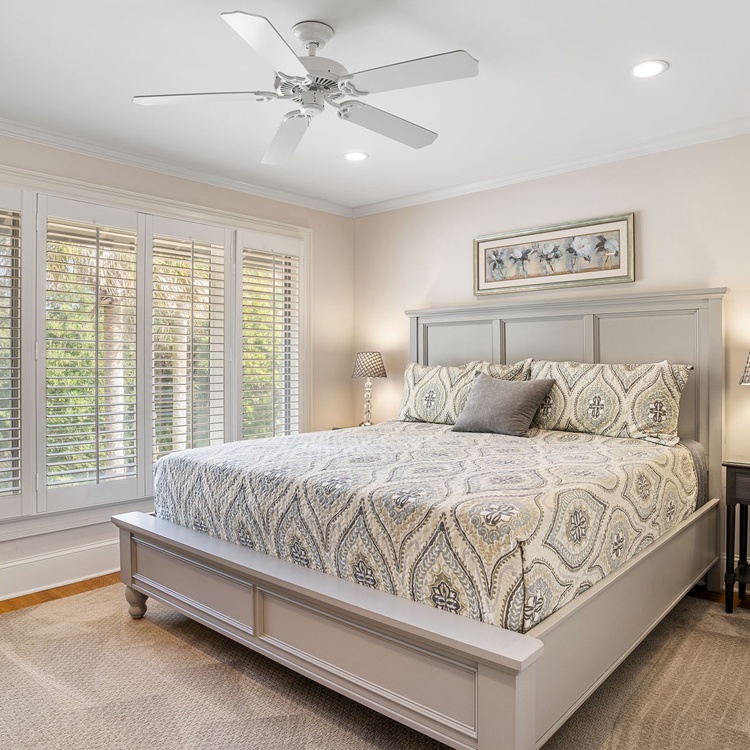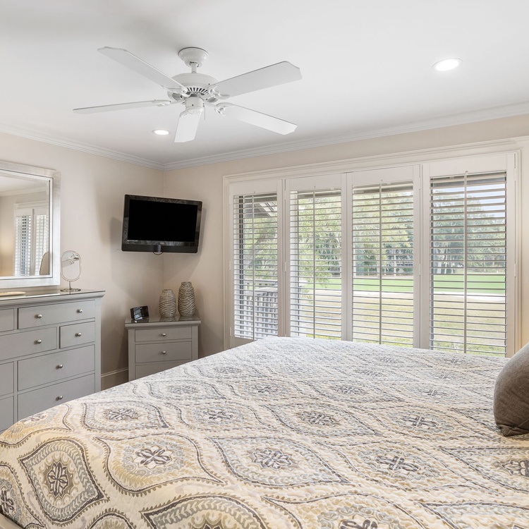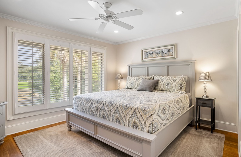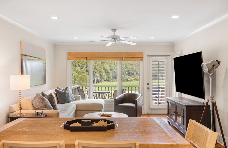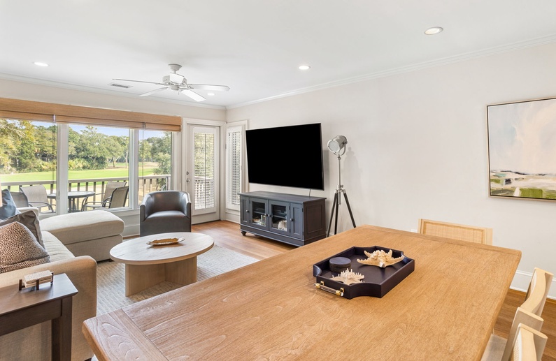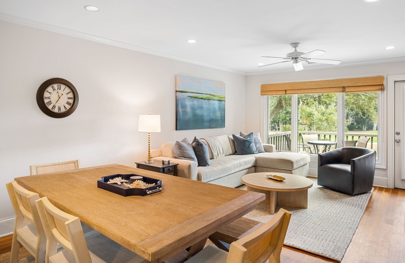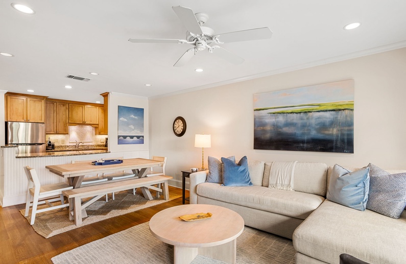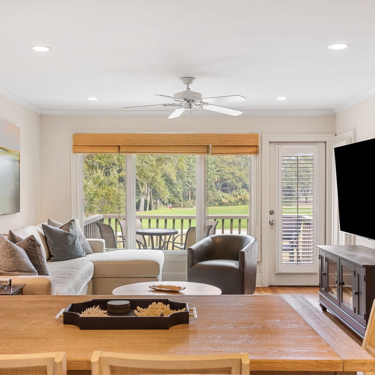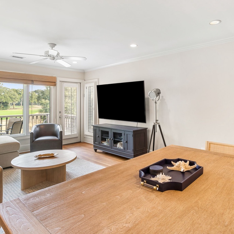 This Kiawah Island vacation rental is a second-story, two-bedroom villa. Guests will enjoy the deck overlooking the golf course and the short 5-minute walk to the beach.