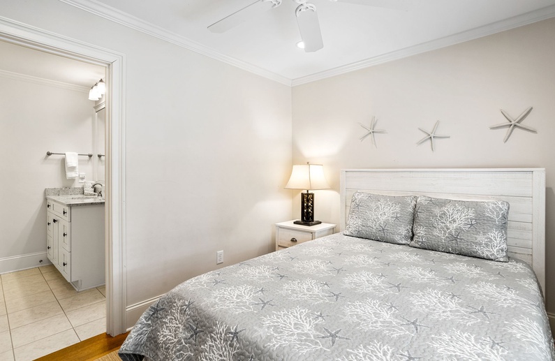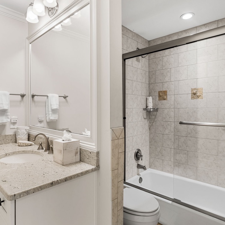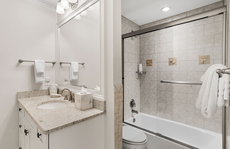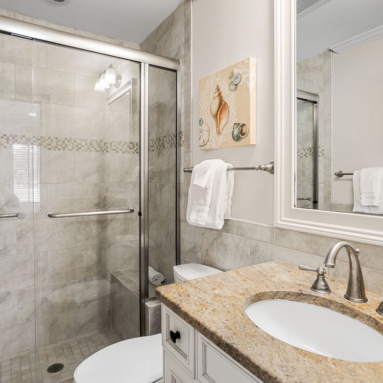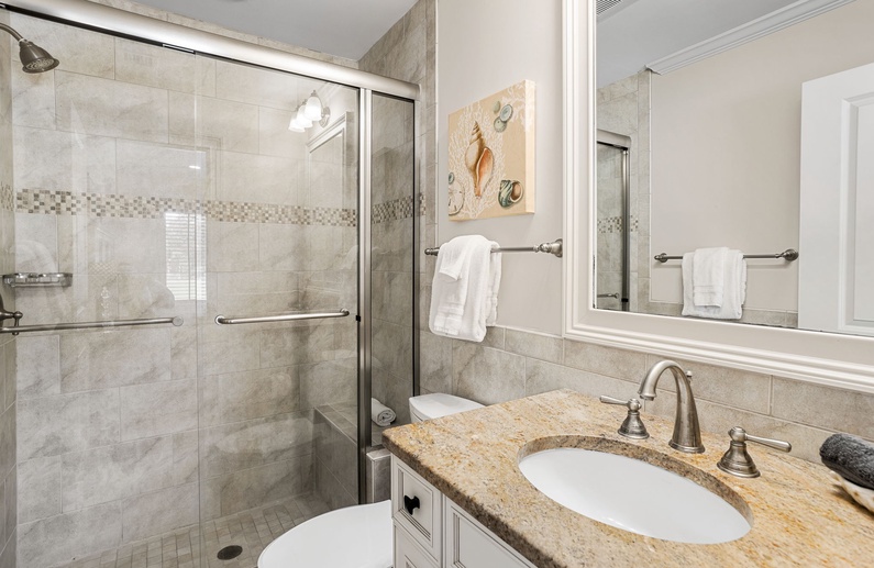 The first bedroom offers a king-sized bed, TV, and private bathroom with a walk-in shower. The second bedroom features a queen bed and a private bathroom with a shower/tub combo.