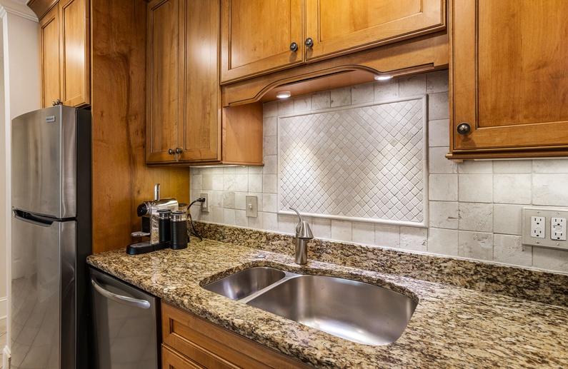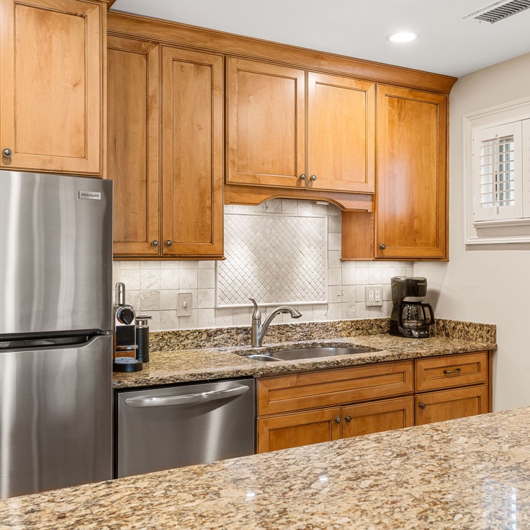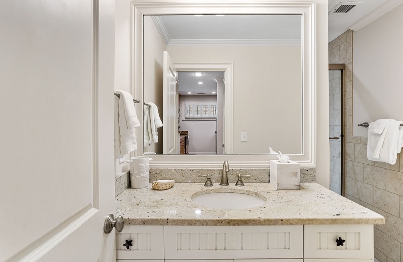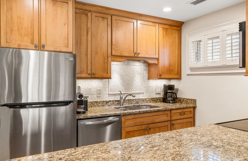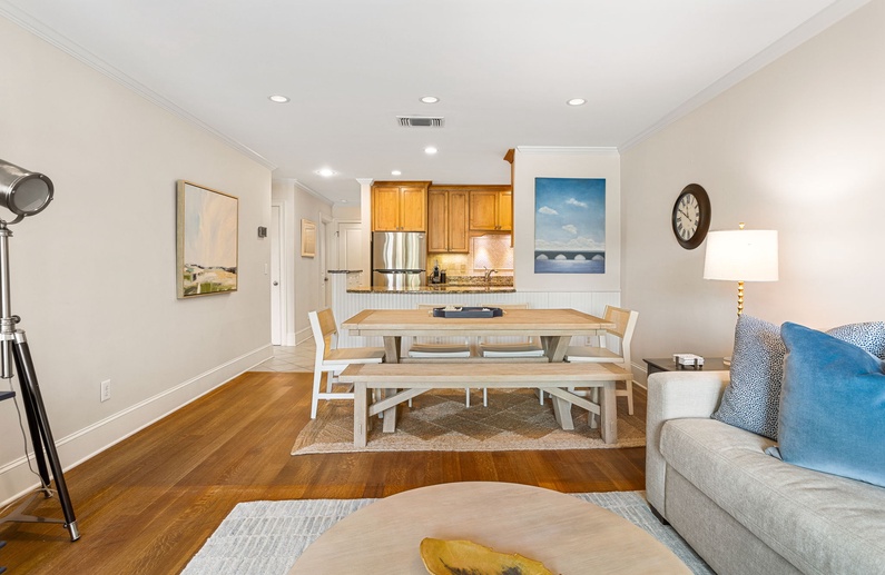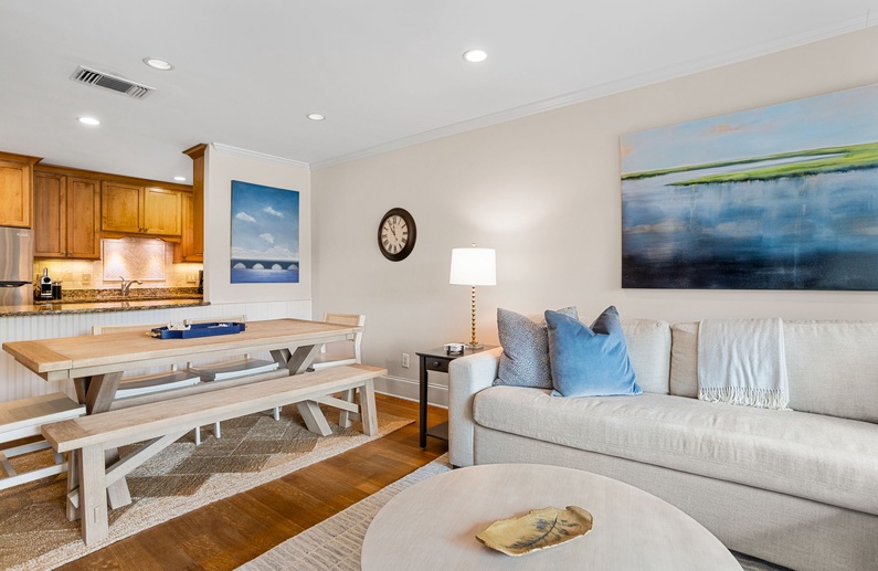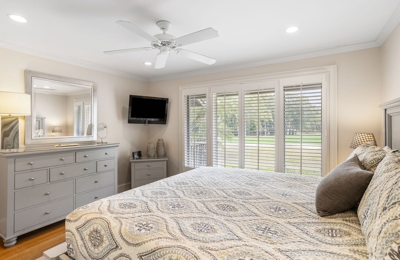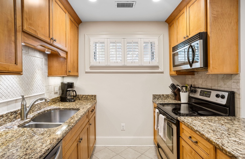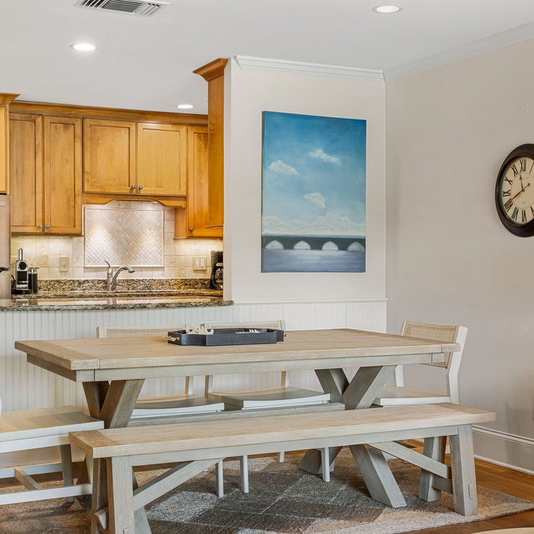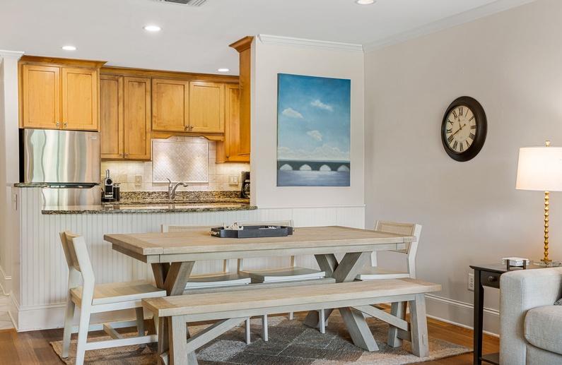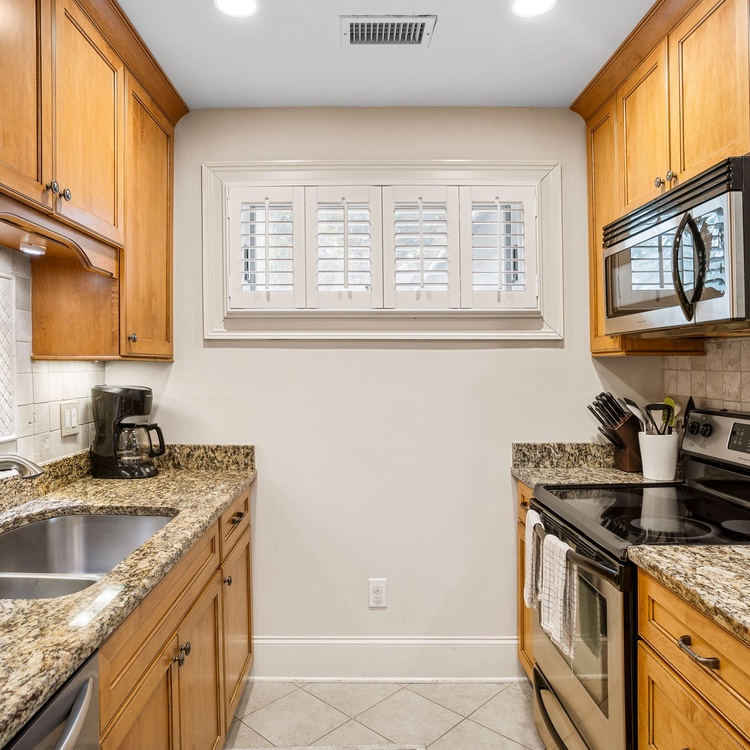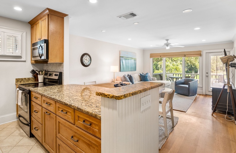 Walk in the front door and be welcomed by the beach-themed decor. The living room offers comfortable furniture, a TV, and views of the golf course. The updated, fully-equipped kitchen has granite countertops, stainless steel appliances, and plenty of room to prepare your vacation meals. The dining area has a table with seating for four.