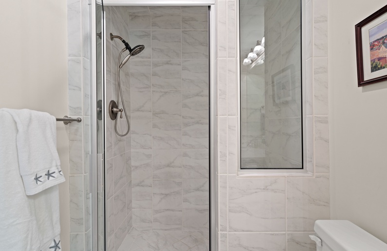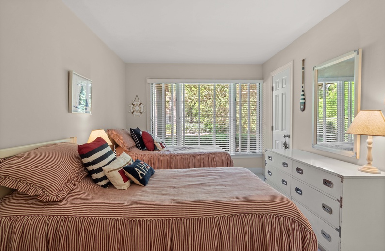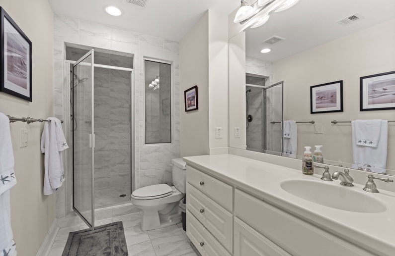 Downstairs, the first floor hosts three inviting bedrooms. The primary suite includes a queen bed and a private en-suite bath complete with a walk-in shower. The two additional bedrooms are thoughtfully furnished, one with a queen bed, the other with two double beds, ideal for families or friends traveling together. The second and third bedrooms share a full bathroom featuring a shower/tub combo, with the third bedroom also having its own access to the bathroom.