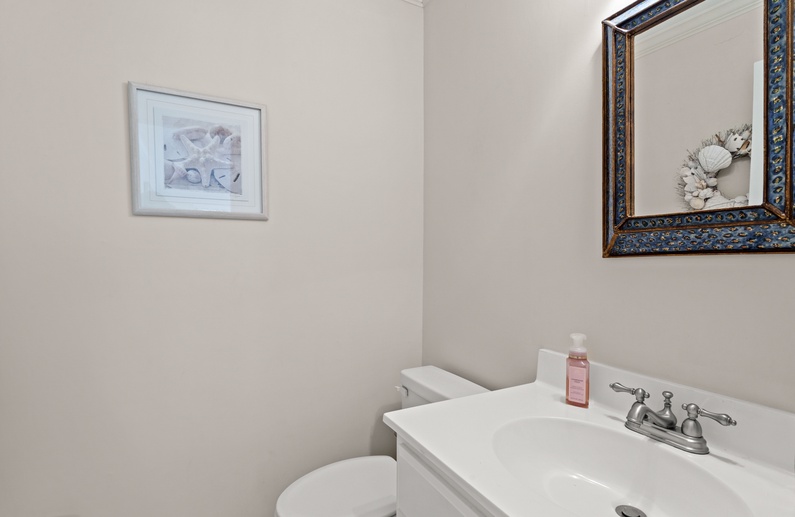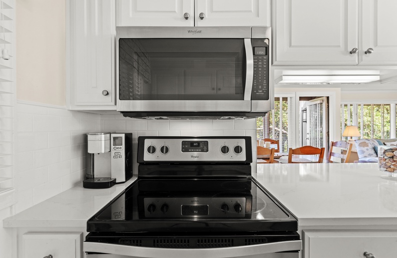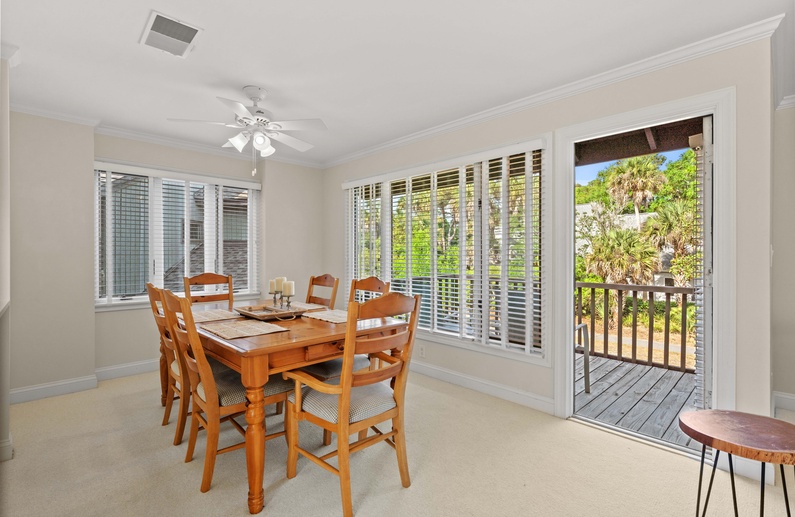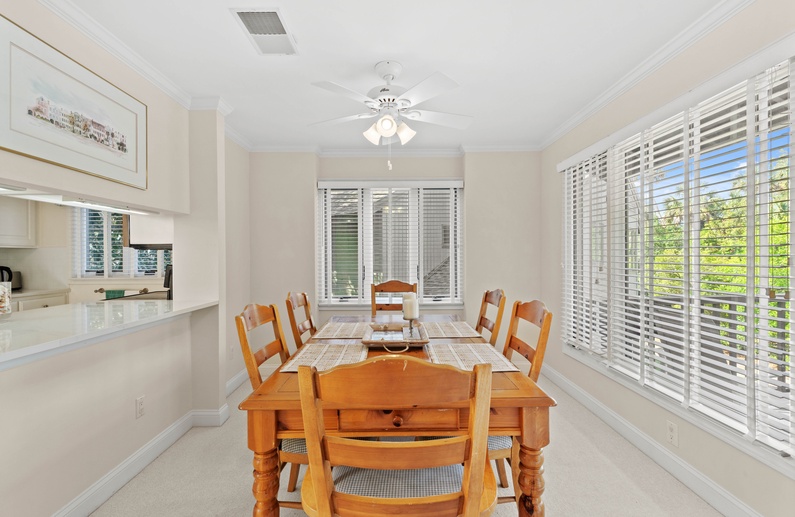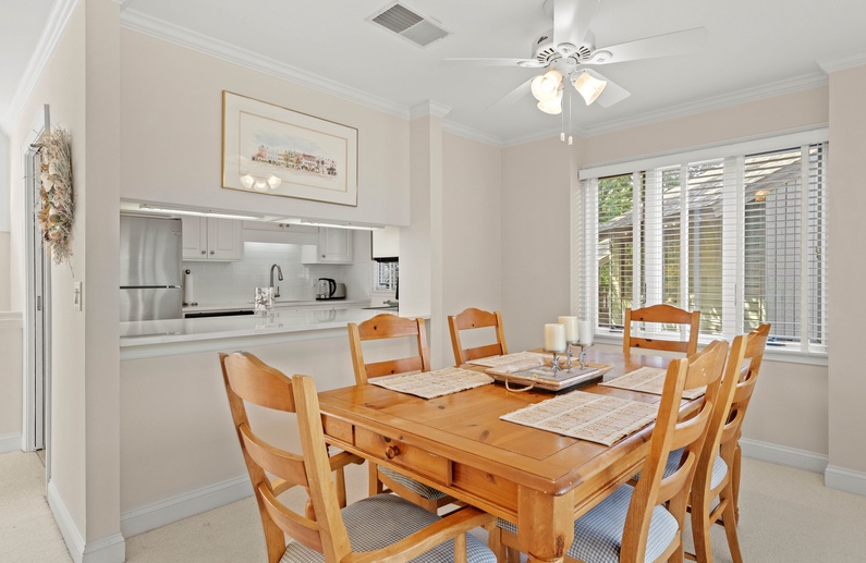 The villa features a reverse floor plan with the main living spaces located on the second floor. Upstairs, you'll find a bright and open living area with comfortable seating and a flat-screen TV, making it the perfect place to relax after a day on the green or at the beach. The dining area seats six and has a view into the fully equipped kitchen with modern appliances and everything you need to cook and entertain with ease. Step outside to your private balcony, located just off the dining area, and surround yourself with Kiawah Island’s serene nature, perfect for morning coffee or an evening glass of wine.