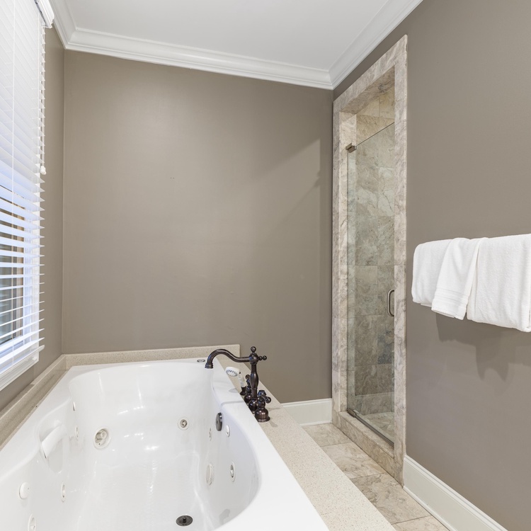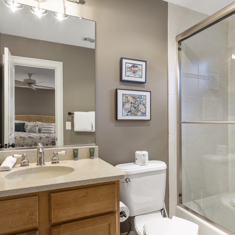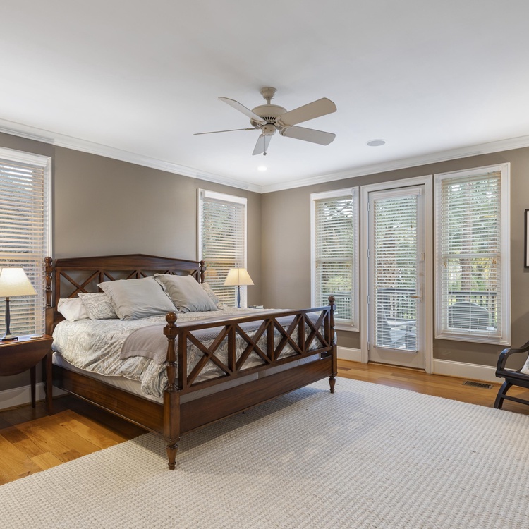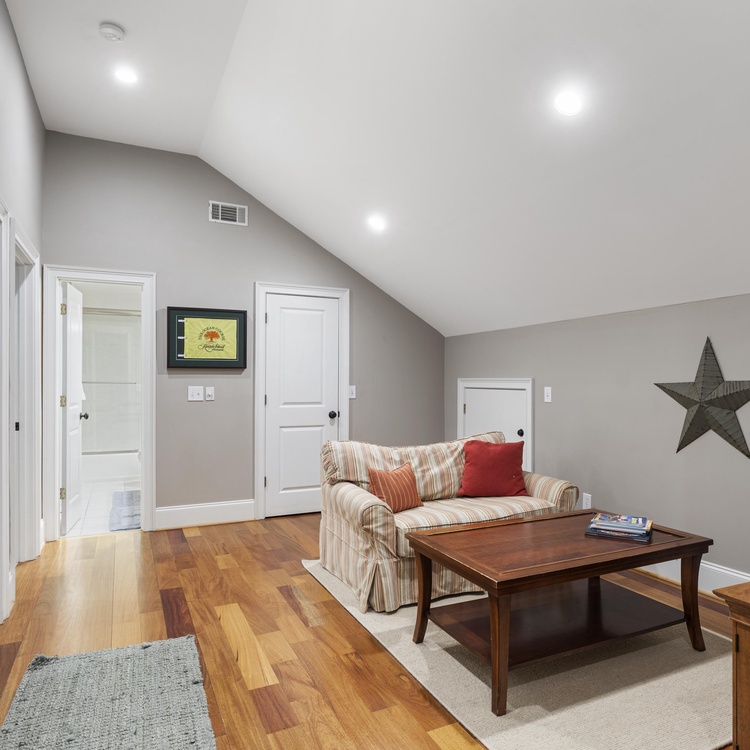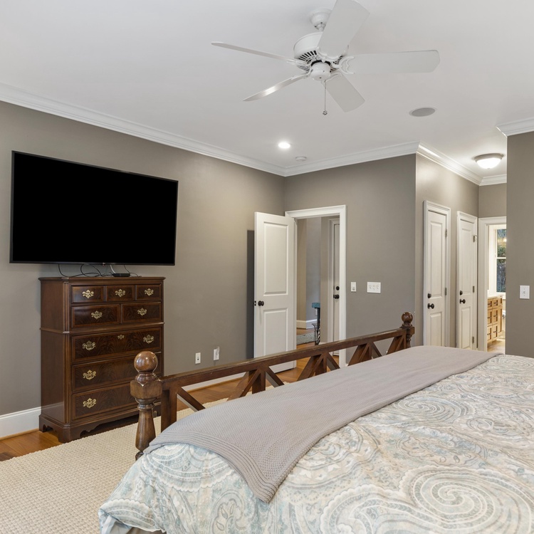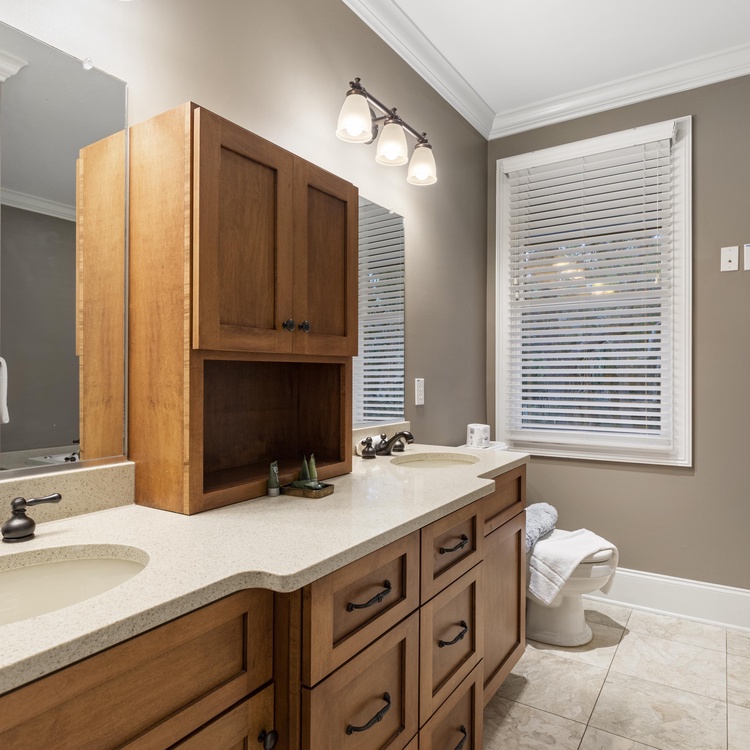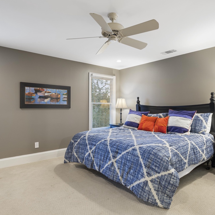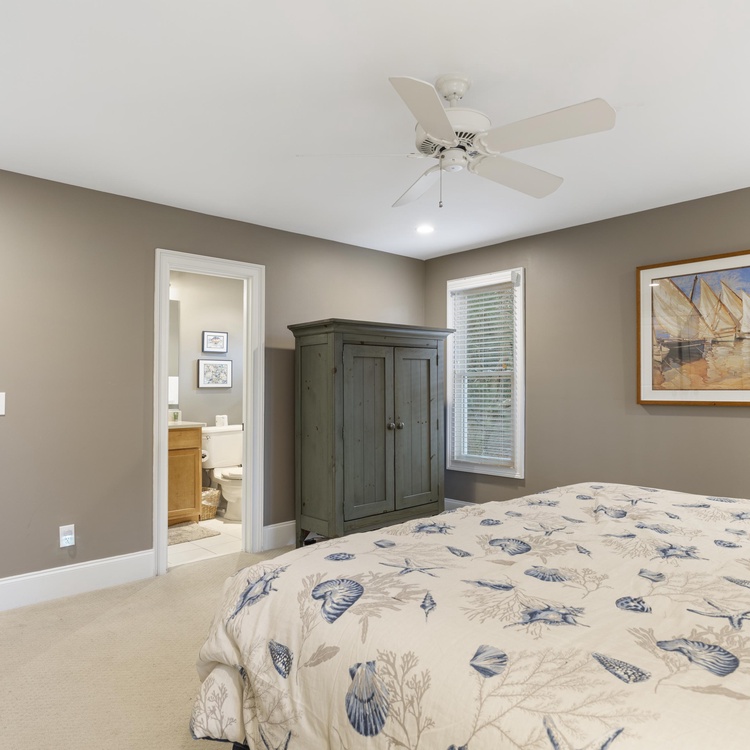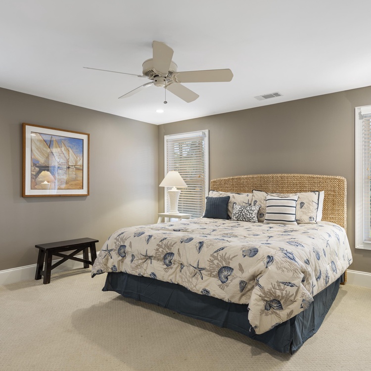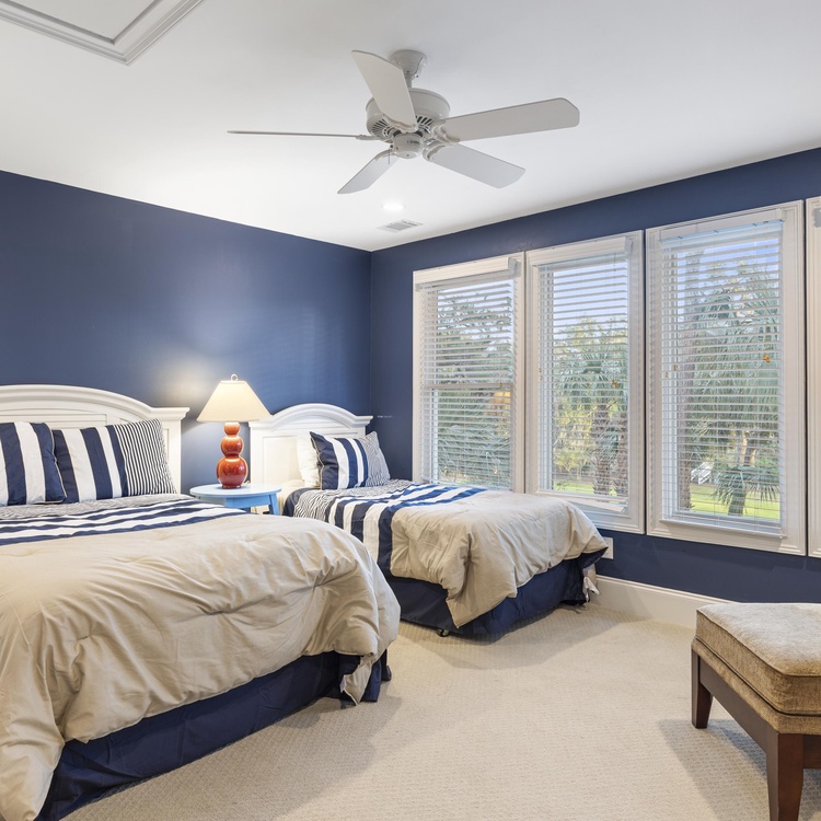 The primary suite is located downstairs and offers access to the back deck, fairway views, a king-sized bed, flat-screen TV, and spacious private bathroom with custom cabinets, double sink and vanity areas, jetted tub, and separate walk-in shower. The three remaining bedrooms are located upstairs. A secondary suite offers a king-sized bed and private bathroom. Two additional bedrooms, one with a king-sized bed and the other with a double and twin bed, share a bathroom. These three bedrooms open to a sitting area that serves as an additional gathering space for family.