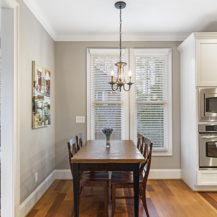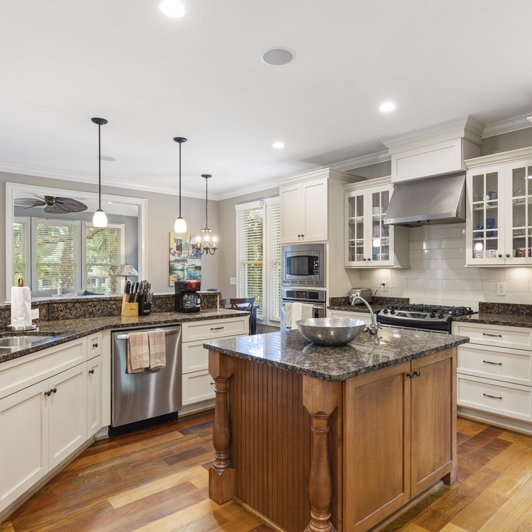 The spacious and open gourmet kitchen with large center island features a prep sink, breakfast area with seating for four, and a kitchen bar area with seating for four. There is also a large separate dining room with seating for eight so family meals can be enjoyed together.