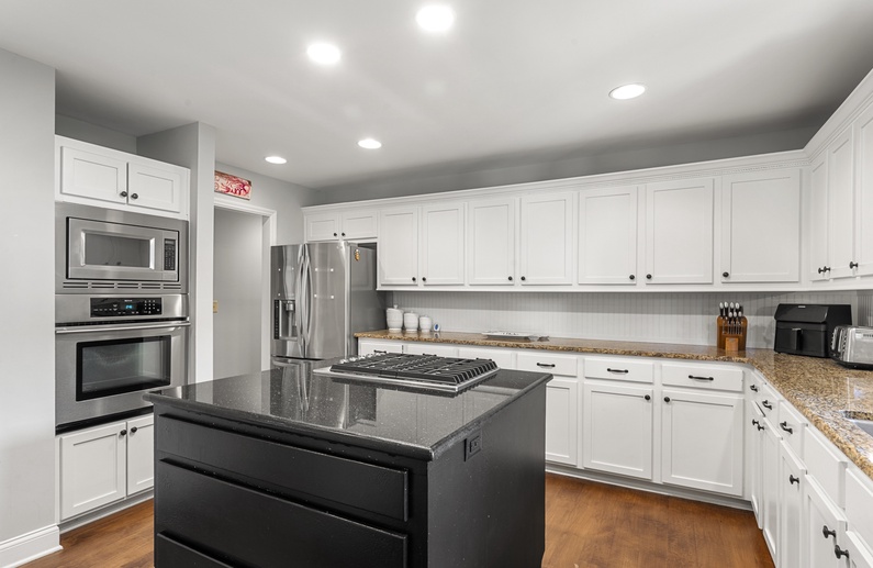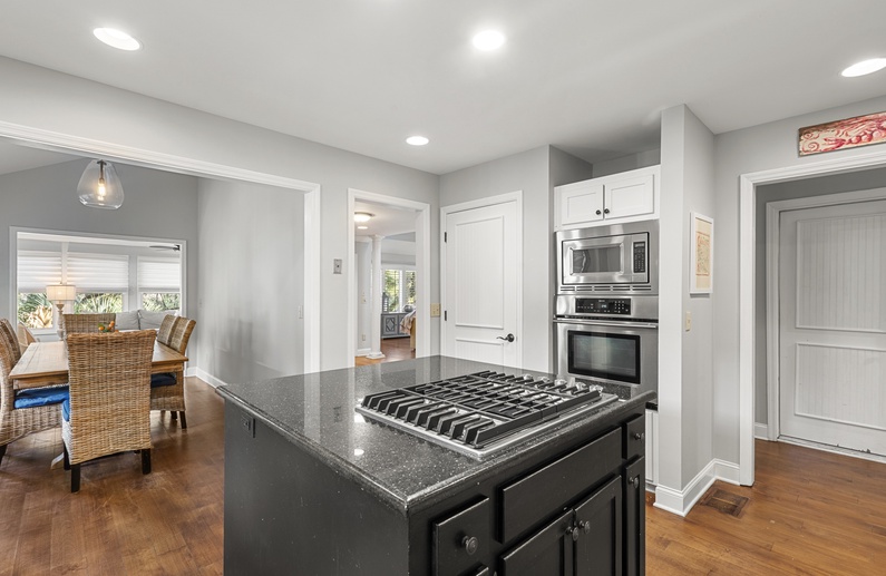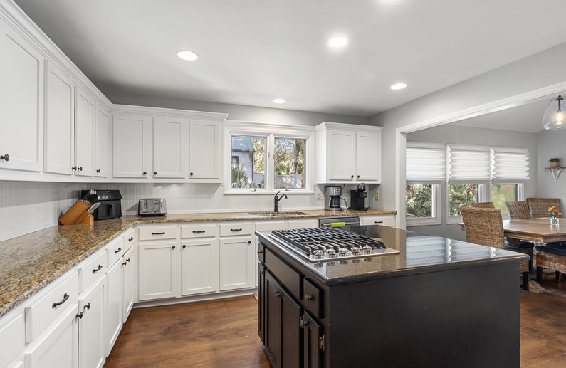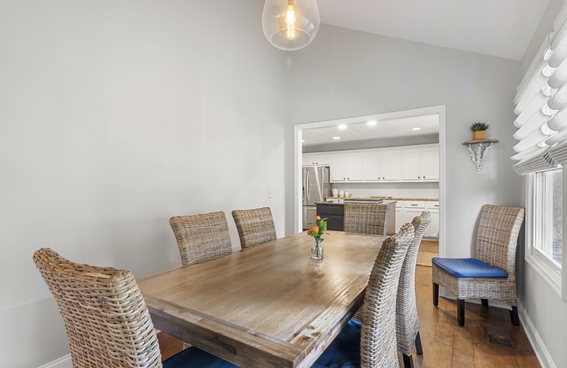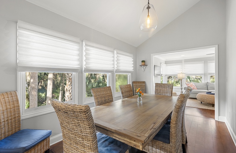The home’s main living area features soaring ceilings, a plush sectional sofa, and a TV. The living area gives way to the sunroom, which has plenty of windows, two love seats, and a TV. A dining area separates the sunroom and kitchen and offers seating for eight. The kitchen is fully equipped and has plenty of counter space to prepare your vacation meals and snacks.