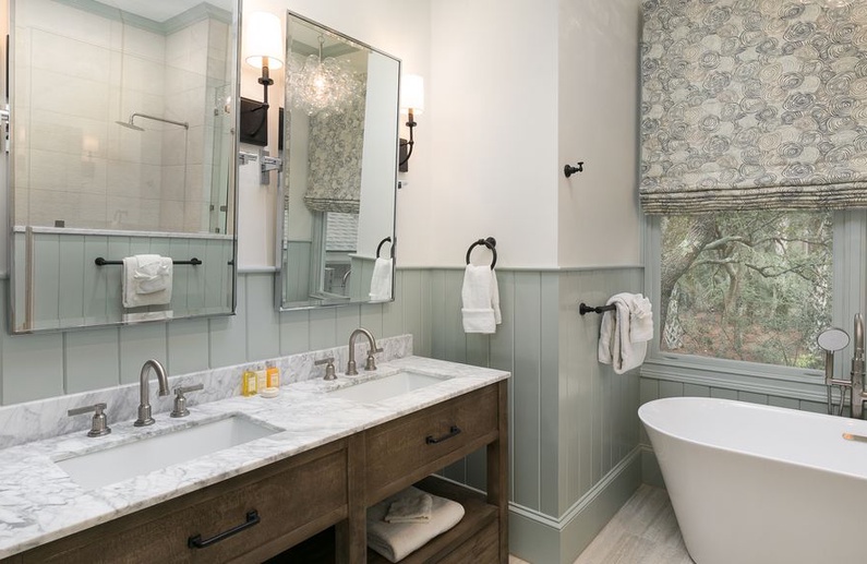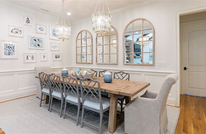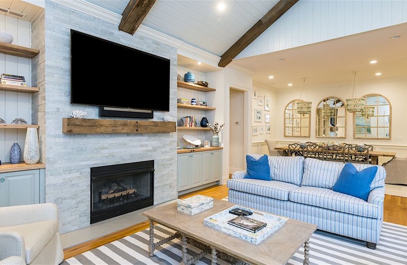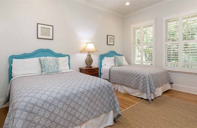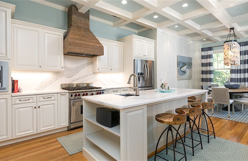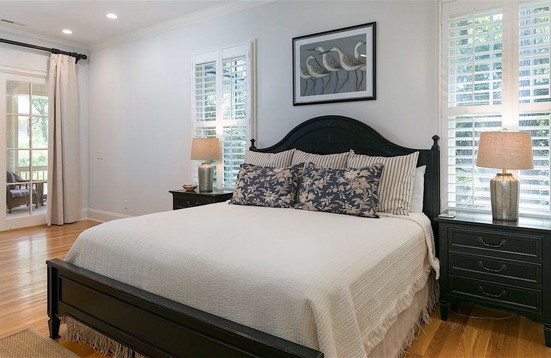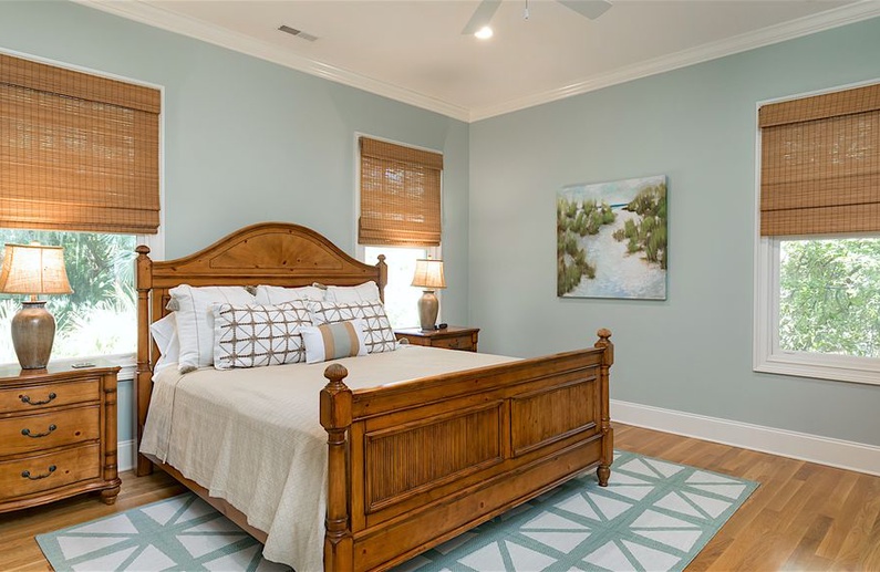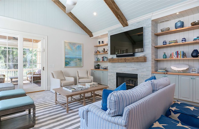 The home’s lovely great room offers vaulted shiplap ceilings, plenty of seating, a flat-screen TV, and access to the screened porch. The great room spills into the dining area, which has a gorgeous wooden table with seating for ten. Additional dining space is available in the breakfast room or at the kitchen island. The gourmet kitchen is fully equipped with two sinks, a Wolf gas oven, a reclaimed cypress hood, honed quartz countertops and backsplash, and custom white cabinetry. You will find everything you need (and more!) in this kitchen fit for a chef.