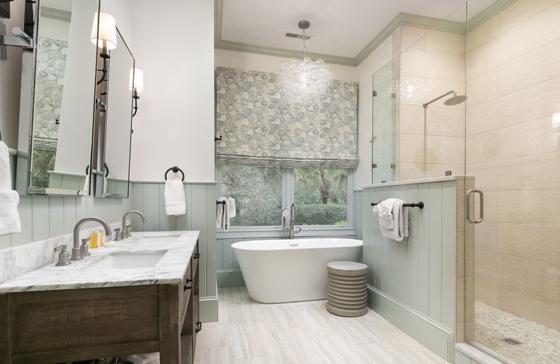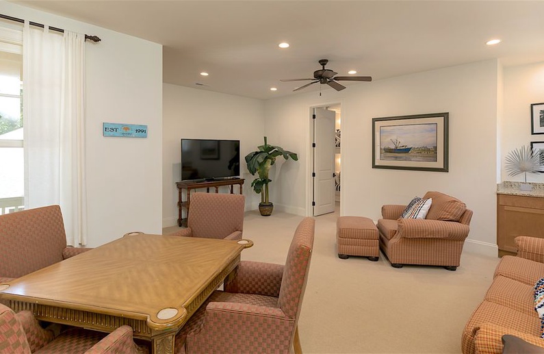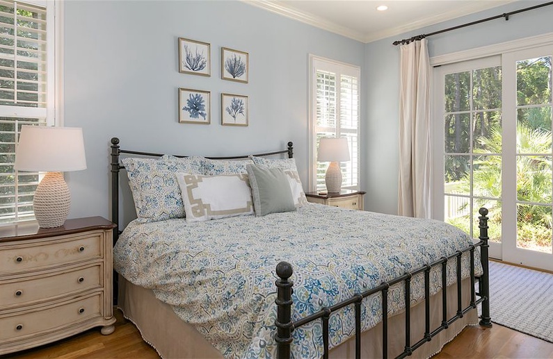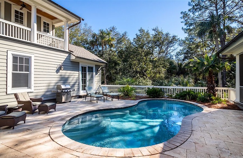 This Kiawah Island vacation rental features 5 bedrooms, a private heated pool, large gathering areas, and a main house and guest house. The renovated home is about a 9-minute walk from the beach.