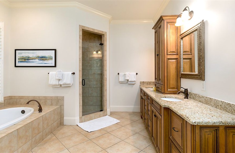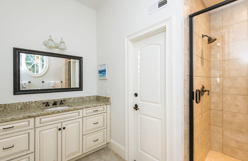 Two of the property’s five bedrooms—both suites—are in the main house. The primary bedroom offers a king-sized bed and a private bathroom with a walk-in shower and soaking tub. The secondary bedroom has a king-sized bed and private bathroom with a walk-in shower and jetted tub. On the main floor of the guest house, there is a third suite with a king-sized bed and a private bathroom with a walk-in shower. Also on the guest house’s main floor is a bedroom with two double beds and a private bathroom with shower/tub combo. Upstairs, you will find the final bedroom which has two twin over twin bunk beds, a bathroom with shower/tub combo, and a family room with a queen sleeper sofa. All bedrooms have 4K TVs for guests to enjoy.