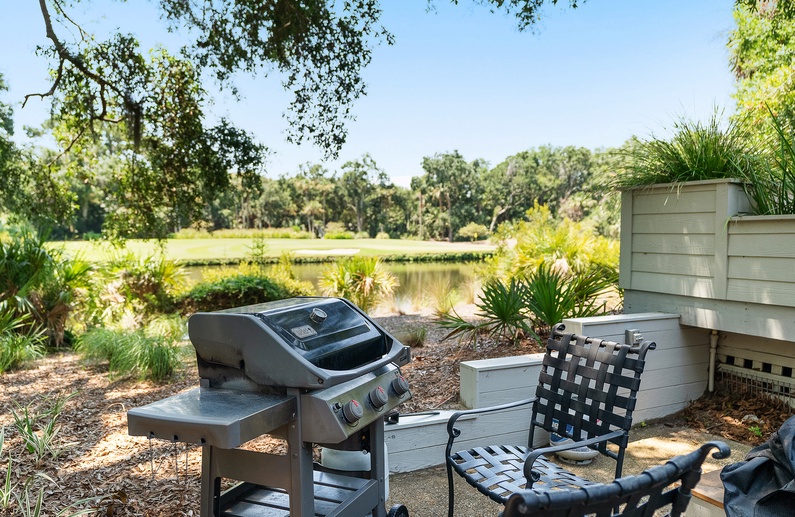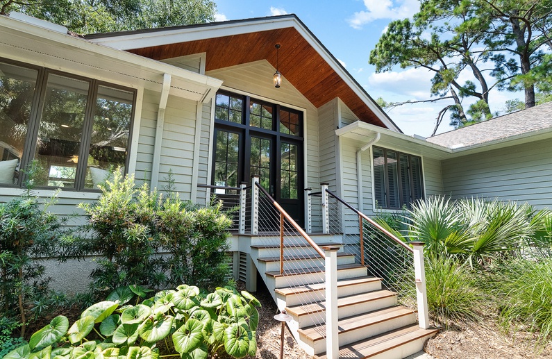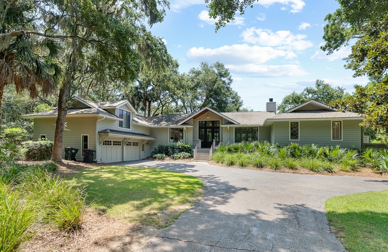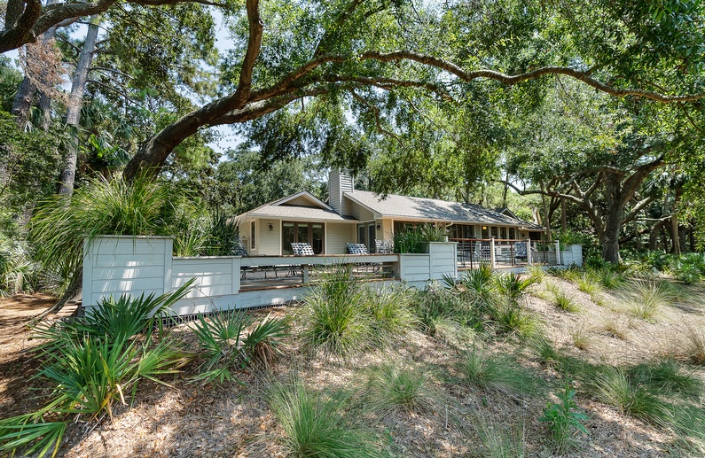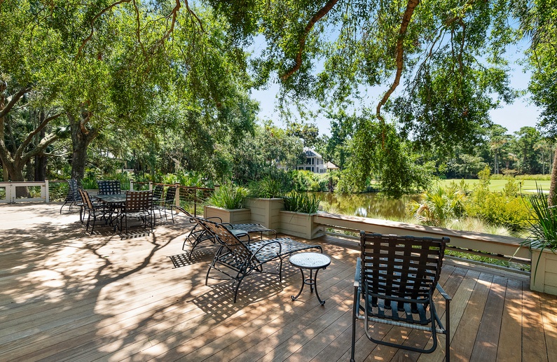 This Kiawah Island vacation rental features 5 bedrooms, 4 bathrooms, and spectacular deck views of the 11th hole on the Turtle Point Golf Course. Enjoy watching golfers play from the private, heated pool or relax amongst the peaceful lagoon. This vacation rental offers a 4-minute bike ride to the beach.
