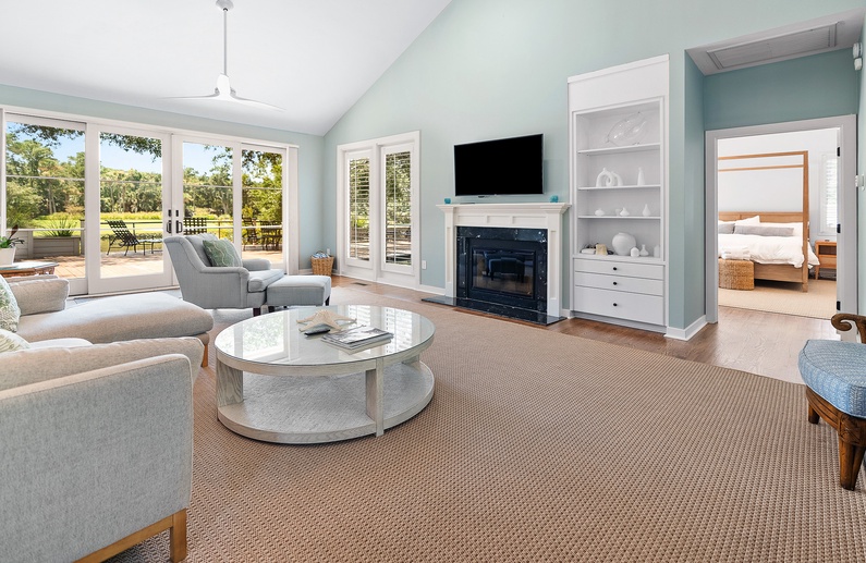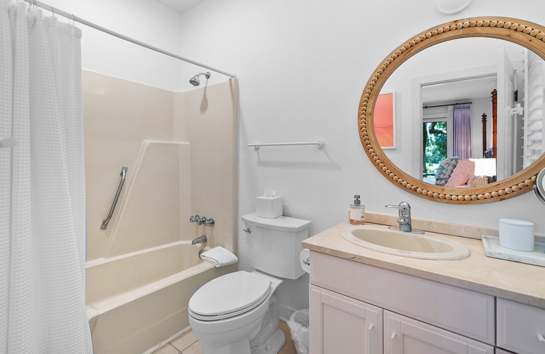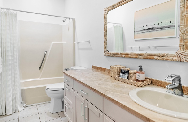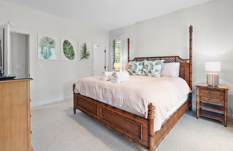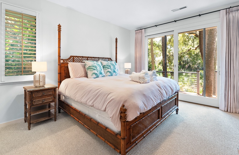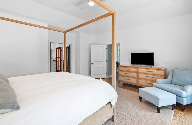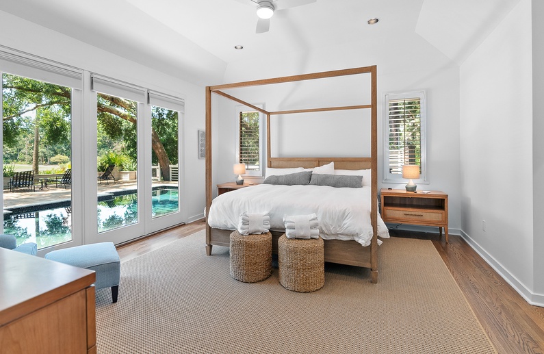 The home’s primary bedroom features a king-sized bed, access to the back deck, and impeccable golf and lagoon views. The room also provides enough closet space to fully unpack your vacation clothes and unwind. The private primary bathroom offers ample natural light, a walk-in glass shower, and a separate bathtub.