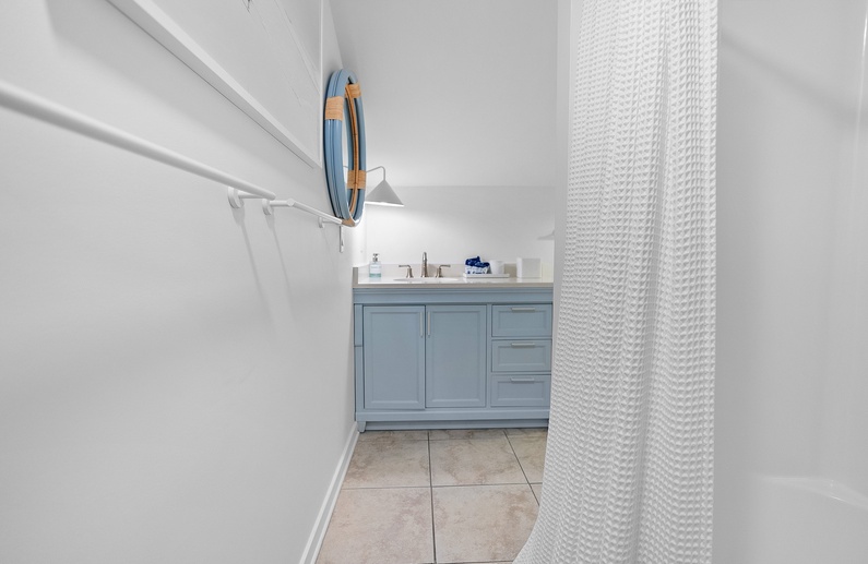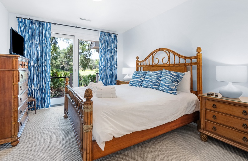 The third bedroom offers a king sized bed, a TV, golf and lagoon views, and sliding doors with access to the deck. The third bathroom is located just down the hall and features ample counter space and a shower-tub combination.